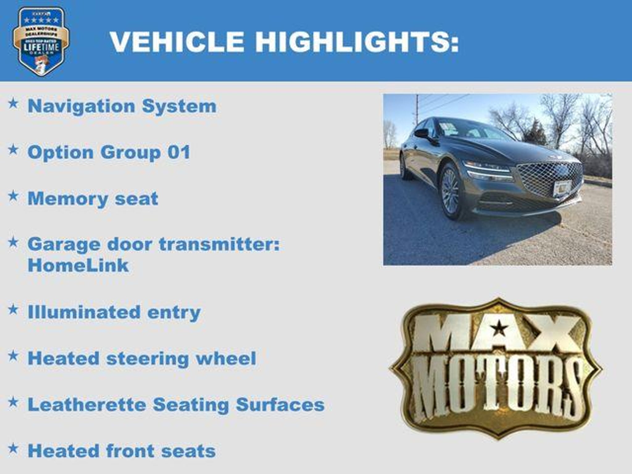 Makalu Gray 2023 Genesis G80 2.5T Odometer is 35268 miles below market average! CARFAX One-Owner. 22/30 City/Highway MPG Garage door transmitter: HomeLink, Heated front seats, Heated rear seats, Heated steering wheel, Illuminated entry, Leatherette Seating Surfaces, Memory seat, Navigation System, Option Group 01, Wheels: 18x8.0J Alloy. At Max Motors, our mission is simple: to provide every customer with a honest, transparent, and rewarding automotive experience. For 19 years as a family-owned business, we build strong customer relationships that go beyond a sale. Buying a vehicle is significant, and we ensure the process is smooth and straightforward.