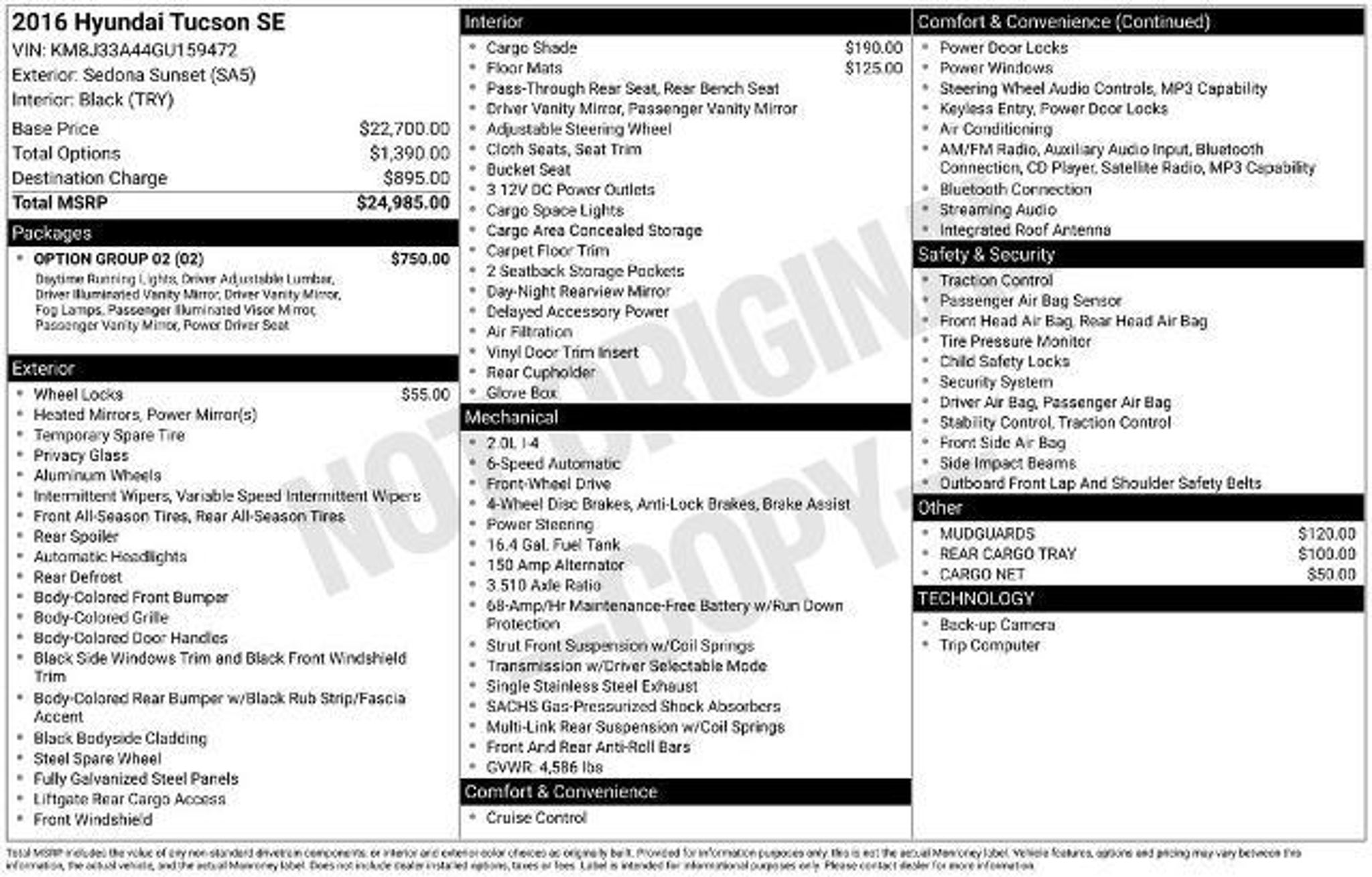 Discover the perfect blend of style, comfort, and capability with this 2016 Hyundai Tucson SE. This versatile SUV is ready to elevate your driving experience and meet the demands of your active lifestyle. Boasting a striking Red exterior, the Tucson SE commands attention on the road. Equipped with a 2.0L DOHC engine and 6-Speed Automatic transmission with Overdrive, this front-wheel-drive SUV delivers an impressive balance of power and efficiency, achieving an EPA-estimated 23 MPG in the city and 31 MPG on the highway. Key features include: â SE Popular Package 02 â Dual Illuminated Vanity Mirrors â Roof Rack Side Rails â Illuminated Glove Box â 8-Way Power Driver Seat Adjuster â LED Daytime Running Lights â Fog Lamps The Tucson SE's thoughtfully designed interior provides a comfortable and convenient driving experience. Enjoy the 8-way power-adjustable driver's seat with lumbar support, as well as the premium side sills and carpeted floor mats that add a touch of refinement. The Autonet AM/FM/SiriusXM/CD/MP3 audio system with 6 speakers keeps you entertained, while the steering wheel-mounted audio controls allow you to easily manage your music on the go. Safety is also a top priority, with features like dual front impact airbags, dual front side impact airbags, overhead airbag, anti-whiplash front head restraints, and Electronic Stability Control providing peace of mind on the road. Whether you're commuting, running errands, or embarking on an adventure, this 2016 Hyundai Tucson SE is the perfect companion. Experience the perfect blend of style, comfort, and capability â visit our showroom today and discover why this Tucson SE should be your next vehicle.