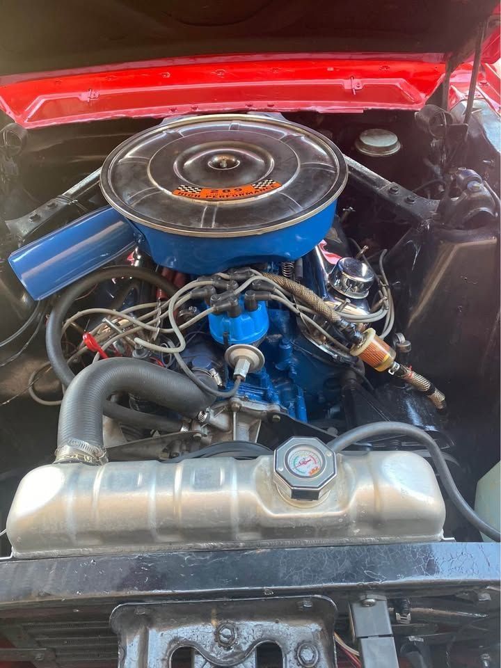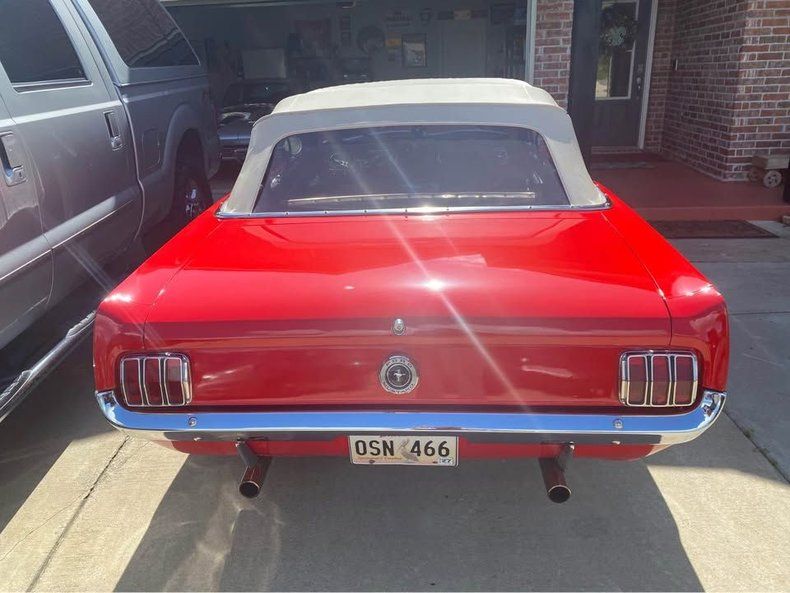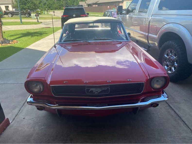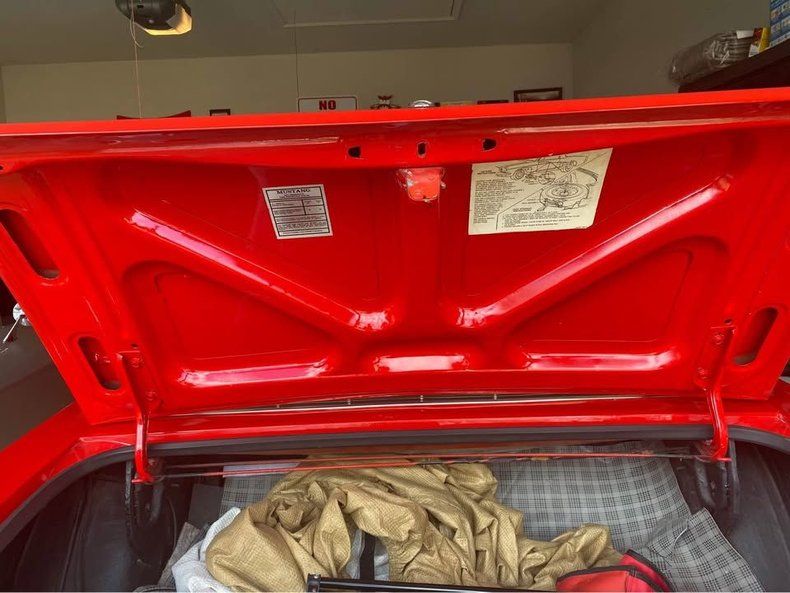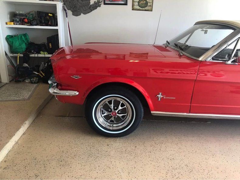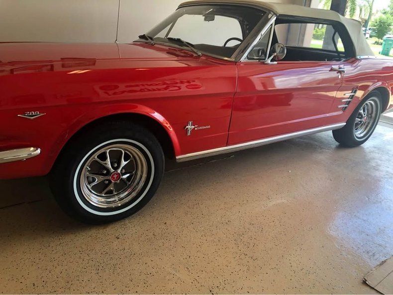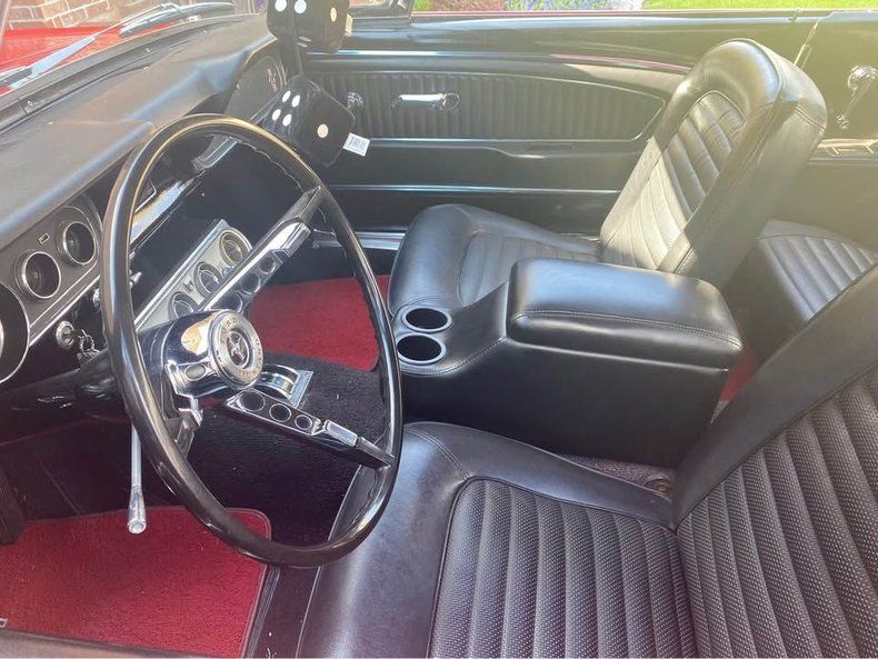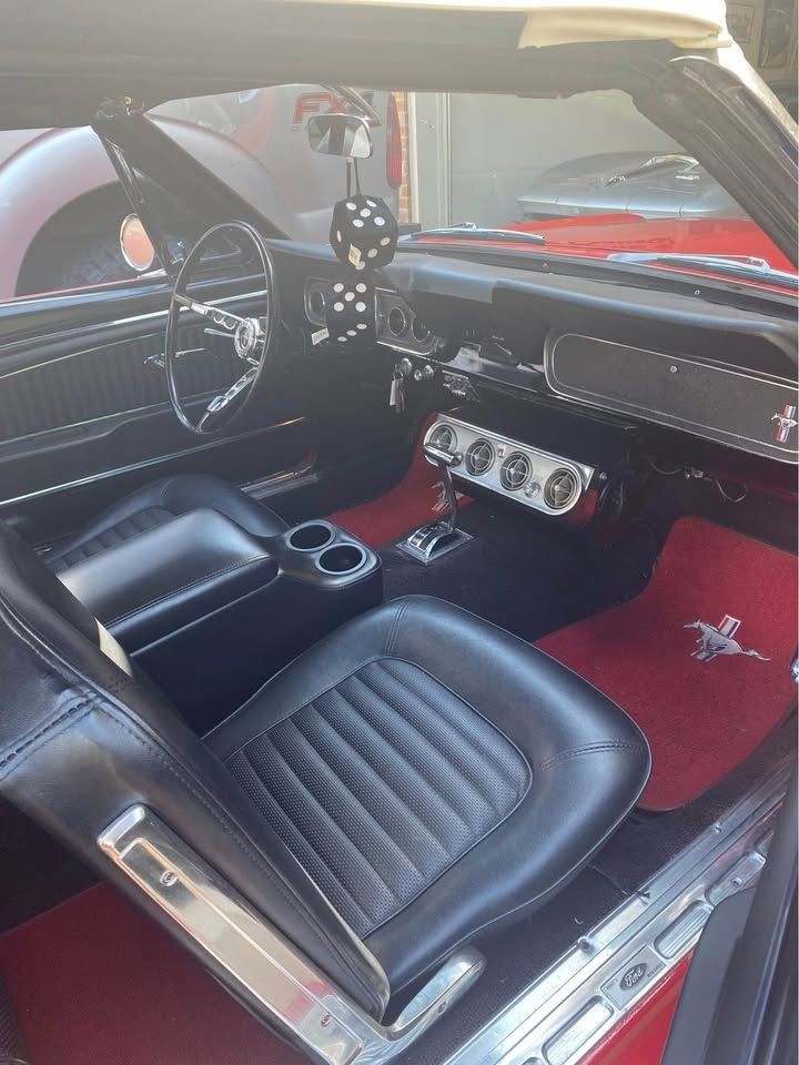 FEATURES AND UPGRADES Convertible body style Restoration completed All numbers matching drivetrain Aluminum radiator Electric cooling fan Black interior Bucket seats Center console with dual cup holders Woodgrain-style steering wheel Classic Mustang badging 289 fender badge White convertible top Chrome bumpers and trim Styled wheels with red Mustang center caps