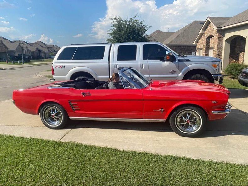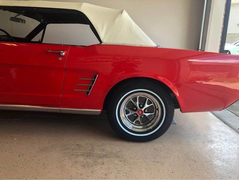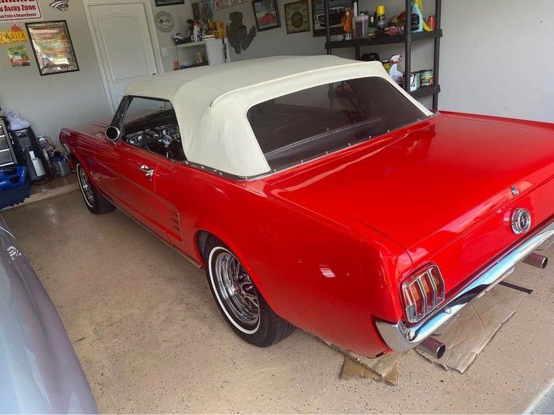 CONDITION This 1966 Ford Mustang Convertible is a restored example with an all numbers matching drivetrain. It presents in a bright red exterior with a white convertible top and classic Mustang styling throughout. The black interior shows bucket seats and a clean, well-kept cabin layout. It is equipped with an automatic transmission, along with an aluminum radiator and an electric fan as part of the restoration. The odometer shows 2,600 miles.