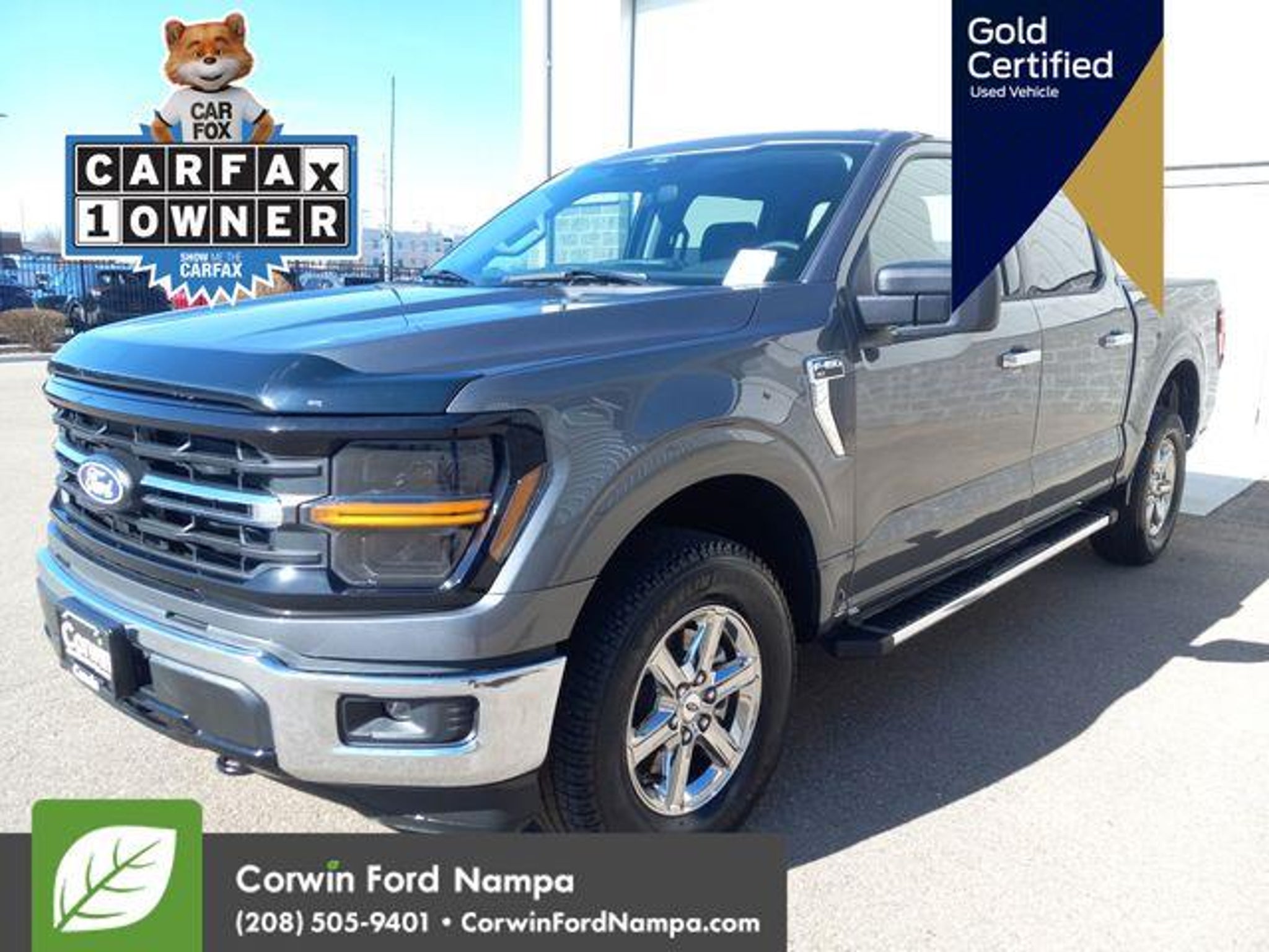 Our Certified, Accident Free, One Owner 2025 Ford F-150 XLT SuperCrew 4X4 in Carbonized Gray Metallic has one job to do: Satisfy your demands! Powered by a Twin-TurboCharged 3.5 Liter EcoBoost V6 delivering 400hp to a 10 Speed SelectShift Automatic transmission for rugged performance. This Four Wheel Drive truck also easily adapts to daily commuting and difficult challenges, and it returns nearly 24mpg on the highway with a bold Ford grille leading the way. Additional dynamic details include LED lighting, fog lamps, chrome bumpers, chrome-like PVD wheels, cast aluminum running boards, a drop-in bedliner, and a Class IV trailer hitch. Comfortable cloth seats set you up for success in our XLT cabin. They complement convenient features like a multifunction steering wheel, air conditioning, keyless entry, cruise control, and a high-tech infotainment system boasting two large displays. The 12-inch productivity screen and 12-inch touchscreen help support WiFi compatibility, Apple CarPlay®, Android Auto®, Bluetooth®, voice control, and an AM/FM stereo for digital benefits owners love. Ford provides automatic braking, lane-keeping assistance, blind-spot monitoring, trailer reverse guidance, forward collision warning, a rearview camera, rear cross-traffic alert, hill start assistance, trailer sway control, and more for safer trucking. It's no wonder our F-150 XLT is a top choice for truck professionals worldwide! Save this Page and Call for Availability. We Know You Will Enjoy Your Test Drive Towards Ownership! Corwin Ford Nampa! Friendly service and aggressive pricing is why we are your new and pre-owned vehicle dealer serving, Nampa, Boise, Meridian, Caldwell, Kuna, Eagle, Emmett, Idaho City, Wilder, New Plymouth, Star, Middleton, Weiser, Payette, Horseshoe Bend, Mountain Home, Idaho, and surrounding states.