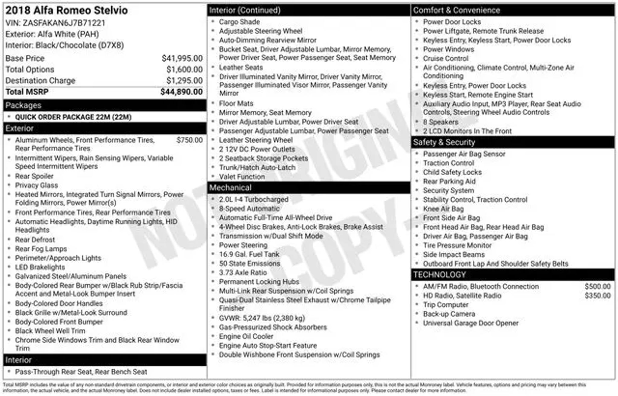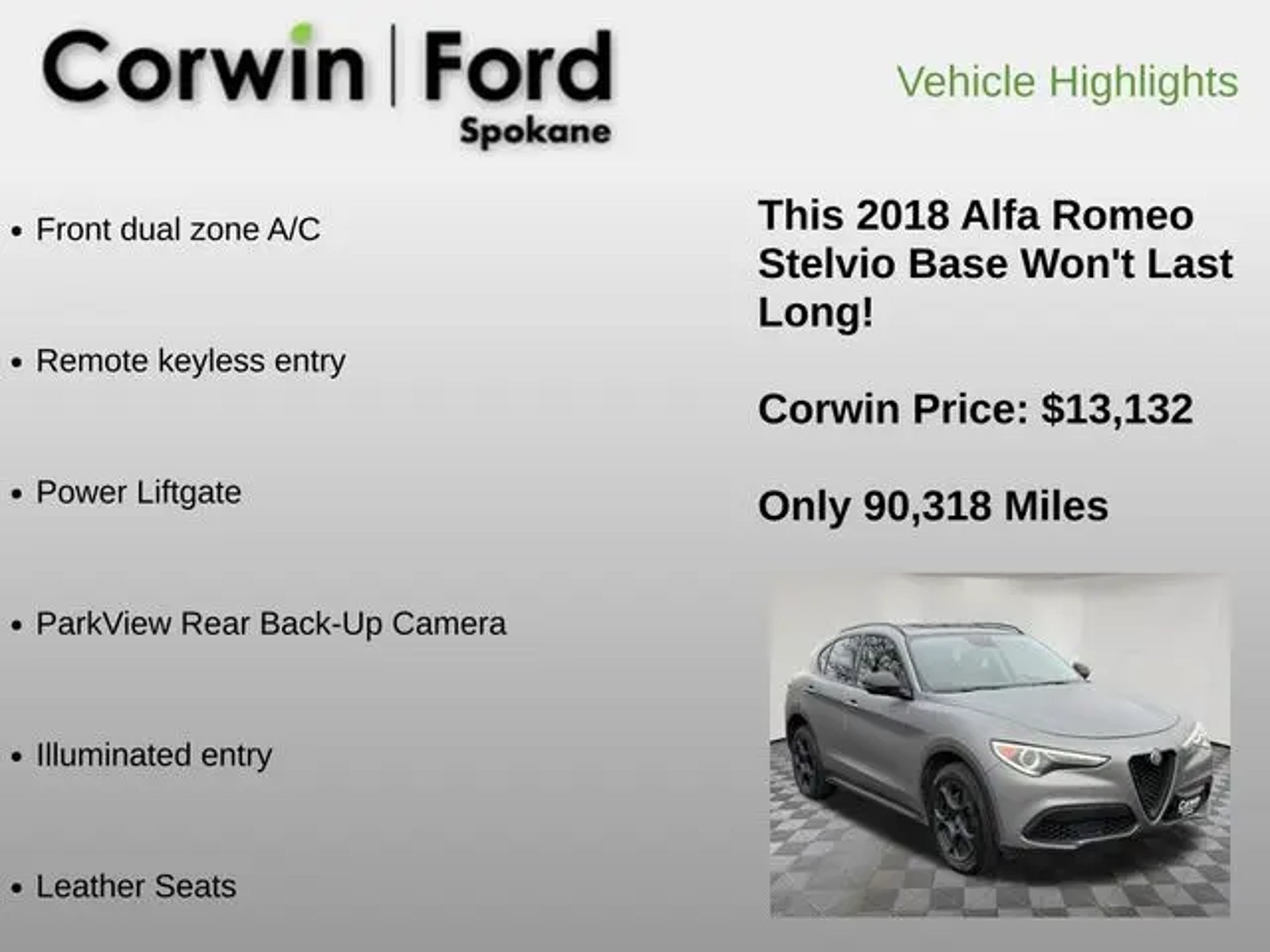 Discover the exceptional 2018 Alfa Romeo Stelvio Base, a captivating SUV that blends Italian style, performance, and versatility. This well-equipped model offers a compelling package that is sure to impress. - This Alfa Romeo Stelvio is well equipped and includes: - 8.8 Widescreen Color Display - Front Dual Zone A/C - Remote Keyless Entry - Power Liftgate - ParkView Rear Back-Up Camera - Illuminated Entry - Leather Seats The Stelvio's striking exterior design commands attention, with its distinctive Alfa Romeo grille, sleek profile, and sculpted lines that evoke a sense of Italian flair. Step inside and you'll be greeted by a well-appointed cabin that prioritizes comfort and convenience, featuring premium materials and thoughtful touches throughout. Powered by a potent I4 engine and paired with an 8-speed automatic transmission, this Stelvio delivers an exhilarating driving experience. With standard all-wheel drive, you'll enjoy confident handling and exceptional control, even in challenging weather conditions. The fuel-efficient performance, with an EPA-estimated 22 MPG in the city and 28 MPG on the highway, ensures you can explore with confidence. Discover the joy of driving with the 2018 Alfa Romeo Stelvio Base. This SUV is a true testament to the brand's commitment to craftsmanship, performance, and style. We invite you to visit our showroom and experience the Stelvio for yourself. Let us demonstrate how this exceptional vehicle can enhance your daily commute and weekend adventures.