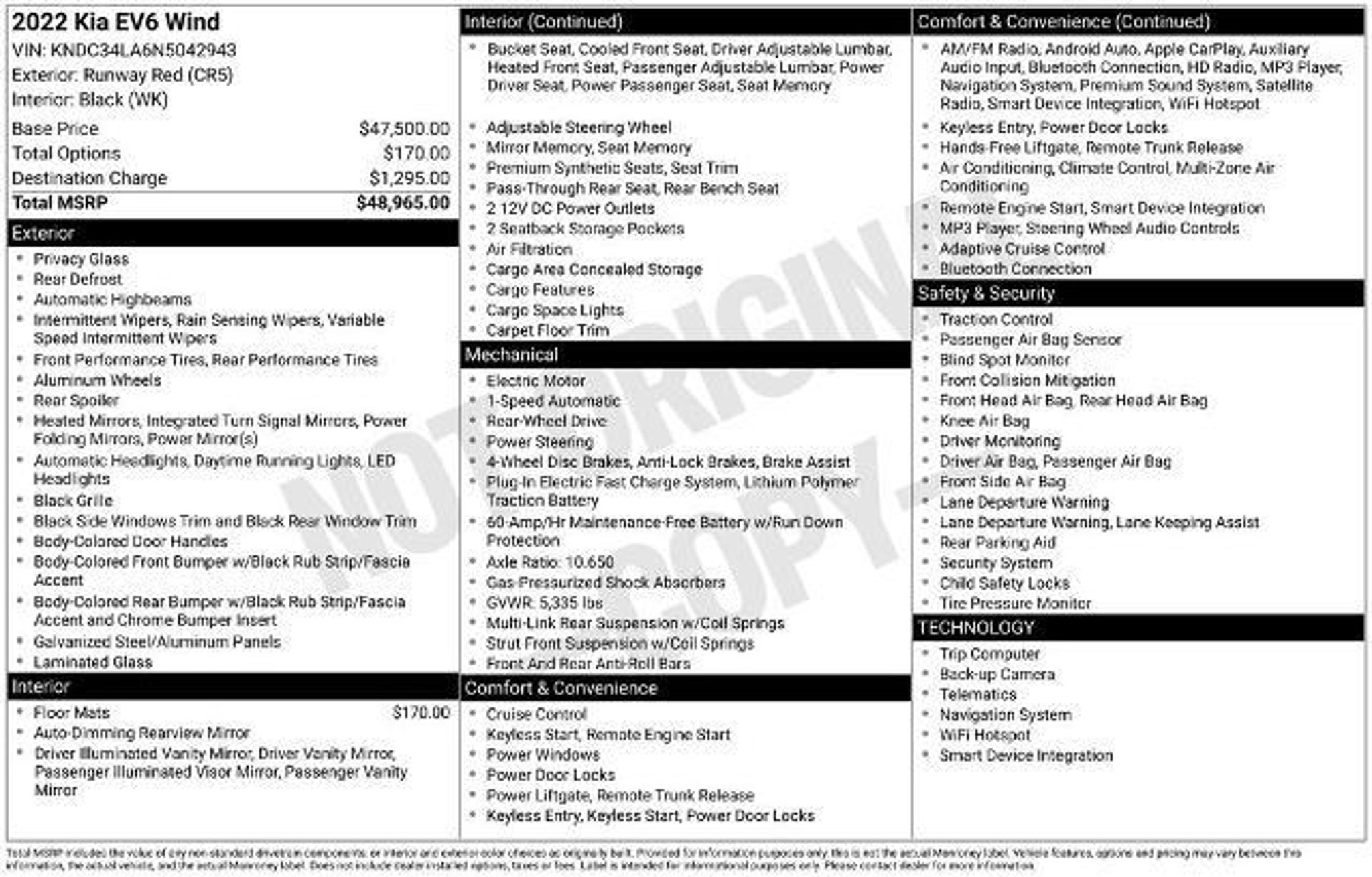 Elevate your driving experience with this exceptional 2022 Kia EV6 Wind. This all-electric marvel combines cutting-edge technology, uncompromising performance, and a stunning design that's sure to turn heads. â Navigation system: AVN 5.0 Navigation System â 14 Speakers â Meridian Premium Audio System â Automatic temperature control â Memory seat â Power driver seat â Smart Key w/ Push Button and Remote Start â Four wheel independent suspension â ABS brakes â Emergency communication system â Power Liftgate â Auto High-beam Headlights Boasting an impressive all-electric range of 134 MPGe in the city and 101 MPGe on the highway, this EV6 Wind offers the perfect blend of efficiency and exhilaration. The electric motor delivers instant torque and responsive handling, ensuring a thrilling driving experience every time you get behind the wheel. The interior of the EV6 Wind is a true sanctuary, with premium Vegan Leather Seat Trim, Heated and Ventilated Front Bucket Seats, and a Meridian Premium Audio System that will immerse you in your favorite tunes. The spacious cabin and ample cargo space make this vehicle ideal for both daily commutes and weekend adventures. Safety is also a top priority, with features like Dual Front Impact Airbags, Electronic Stability Control, and an Emergency Communication System to give you peace of mind on the road. The EV6 Wind's advanced driver-assistance technologies, including Automatic High-Beam Headlights and Rear Cross-Traffic Alert, help keep you and your loved ones protected. This 2022 Kia EV6 Wind is a true testament to the brand's commitment to innovation and excellence. With its stunning design, cutting-edge technology, and impressive performance, it's the perfect choice for the discerning driver who wants to elevate their driving experience. We invite you to come in and experience the 2022 Kia EV6 Wind for yourself. Our knowledgeable sales team is ready to answer any questions you may have and help you discover why this exceptional electric vehicle should be your next ride. Don't miss the opportunity to make this remarkable EV6 Wind your own.