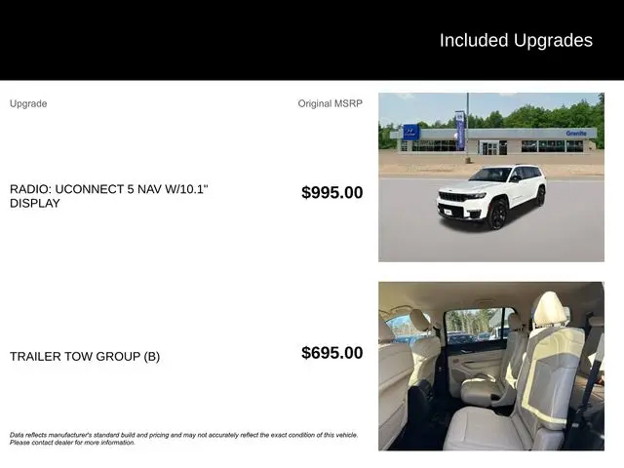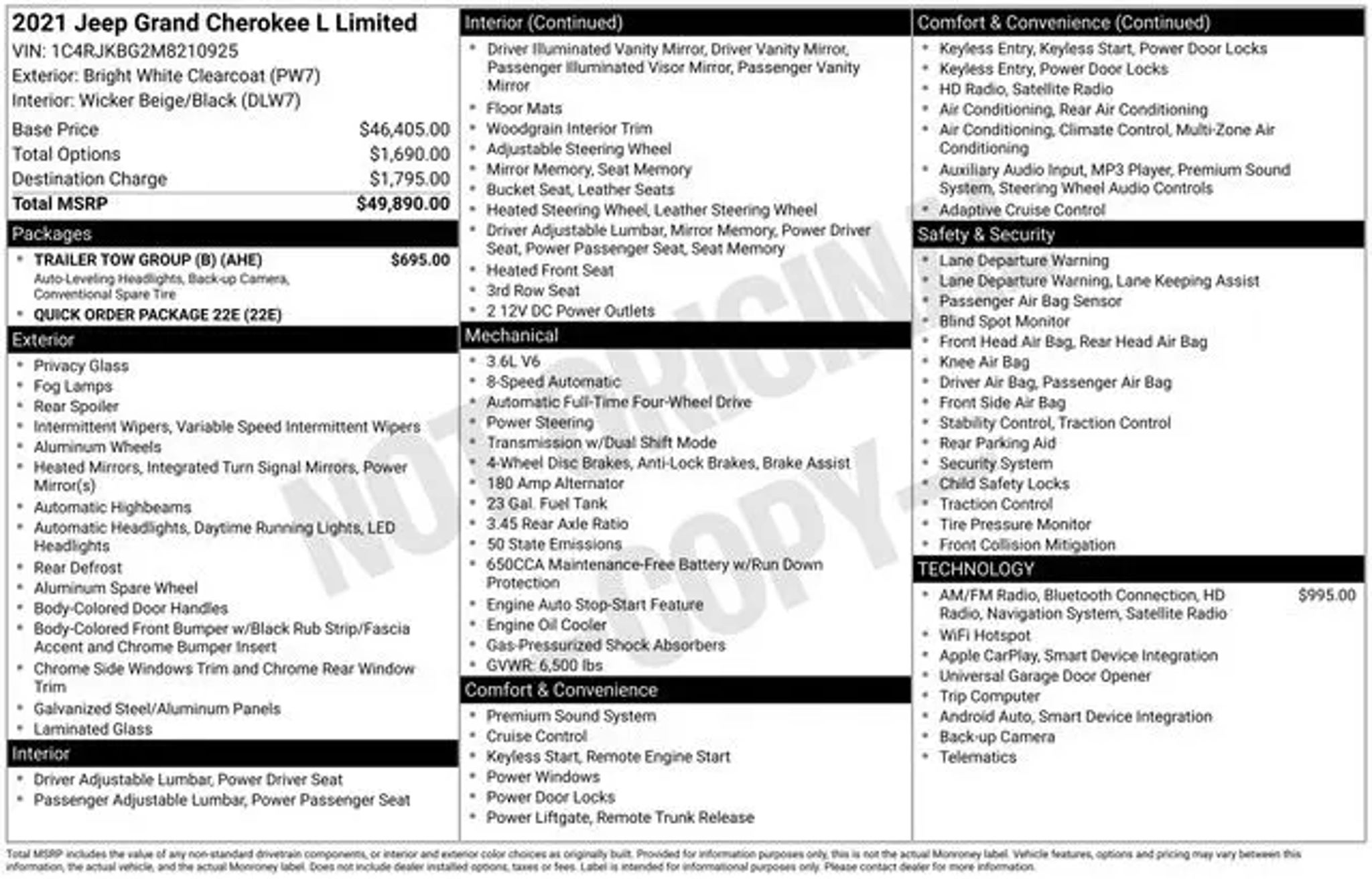 Elevate your driving experience with this exceptional 2021 Jeep Grand Cherokee L Limited. This stunning SUV offers a captivating blend of style, capability, and cutting-edge technology, making it the perfect choice for those seeking a versatile and refined automotive companion. Boasting a striking White exterior, this Grand Cherokee L is equipped with a robust 3.6L V6 24V VVT engine mated to an 8-Speed Automatic transmission, delivering a seamless and efficient 4WD driving experience. Enjoy impressive fuel efficiency, with an EPA-estimated 18 MPG in the city and 25 MPG on the highway. Key features of this well-equipped model include: - RADIO: UCONNECT 5 NAV W/10.1 DISPLAY - TRAILER TOW GROUP (B) This Grand Cherokee L Limited has been meticulously inspected and certified, ensuring it meets the highest standards of quality and reliability. With low mileage of just 73,946, this vehicle is ready to provide you with years of exceptional performance and unparalleled driving pleasure. Imagine the convenience of the premium 9 speaker alpine audio system, the clarity of the 10.1 Touchscreen Display, and the peace of mind that comes with GPS Navigation and Connected Travel & Traffic Services. The Trailer Tow Group (B) further enhances the vehicle's versatility, allowing you to tow with confidence. Step inside and experience the refined Capri Leather Seats, the warmth of the Heated Steering Wheel, and the seamless integration of Apple CarPlay and Google Android Auto. The spacious and well-appointed cabin, combined with the power liftgate and split-folding rear seats, offers exceptional versatility to accommodate your lifestyle. This 2021 Jeep Grand Cherokee L Limited is a true testament to the brand's commitment to excellence. With its exceptional features, impressive capabilities, and certified pre-owned status, it represents an exceptional value proposition that is sure to impress. We invite you to schedule a test drive and discover the exceptional driving experience that awaits you. Certification Program Details: SIGNATURE CERTIFIED POWERED BY ALLSTATE! INCLUDES A RIGOROUS 70 POINT VEHICLE SAFETY INSPECTION AND A COMPLIMENTARY 6 MONTH - 6,000 MILES LIMITED WARRANTY