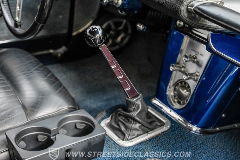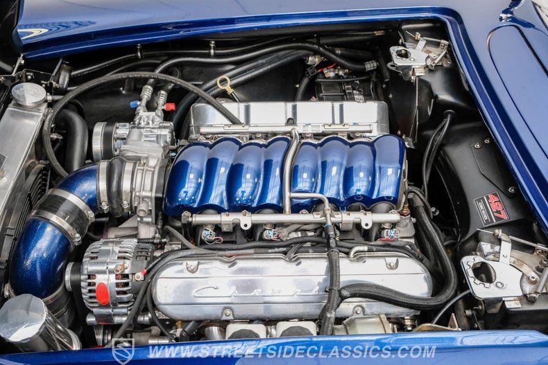 Inside, we find a factory black leather interior with blue accents that is classic Corvette. Sitting in front of its three-spoke power-assisted steering wheel, the five-pod gauge setup, featuring a broad half-moon speedometer and center-mount tach, broadcasts all the most pertinent information a driver could need in an efficient and aesthetically pleasing way. An analog clock, a Billet floor shifter, dual cup holders, and a padded grab bar each add a bit of charm to the simple yet elegant interior of this car.