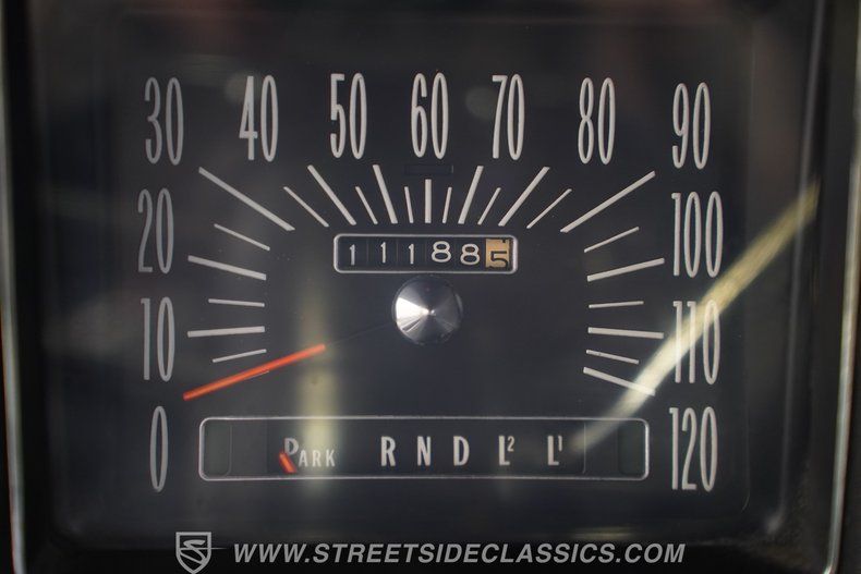 The black interior presents well and remains mostly original. The front bench seat splits with a fold-down armrest while still offering seating and belts for three passengers. The vinyl upholstery and door panels are in good condition. New carpet has been installed, and an aftermarket radio adds modern sound to the cabin.