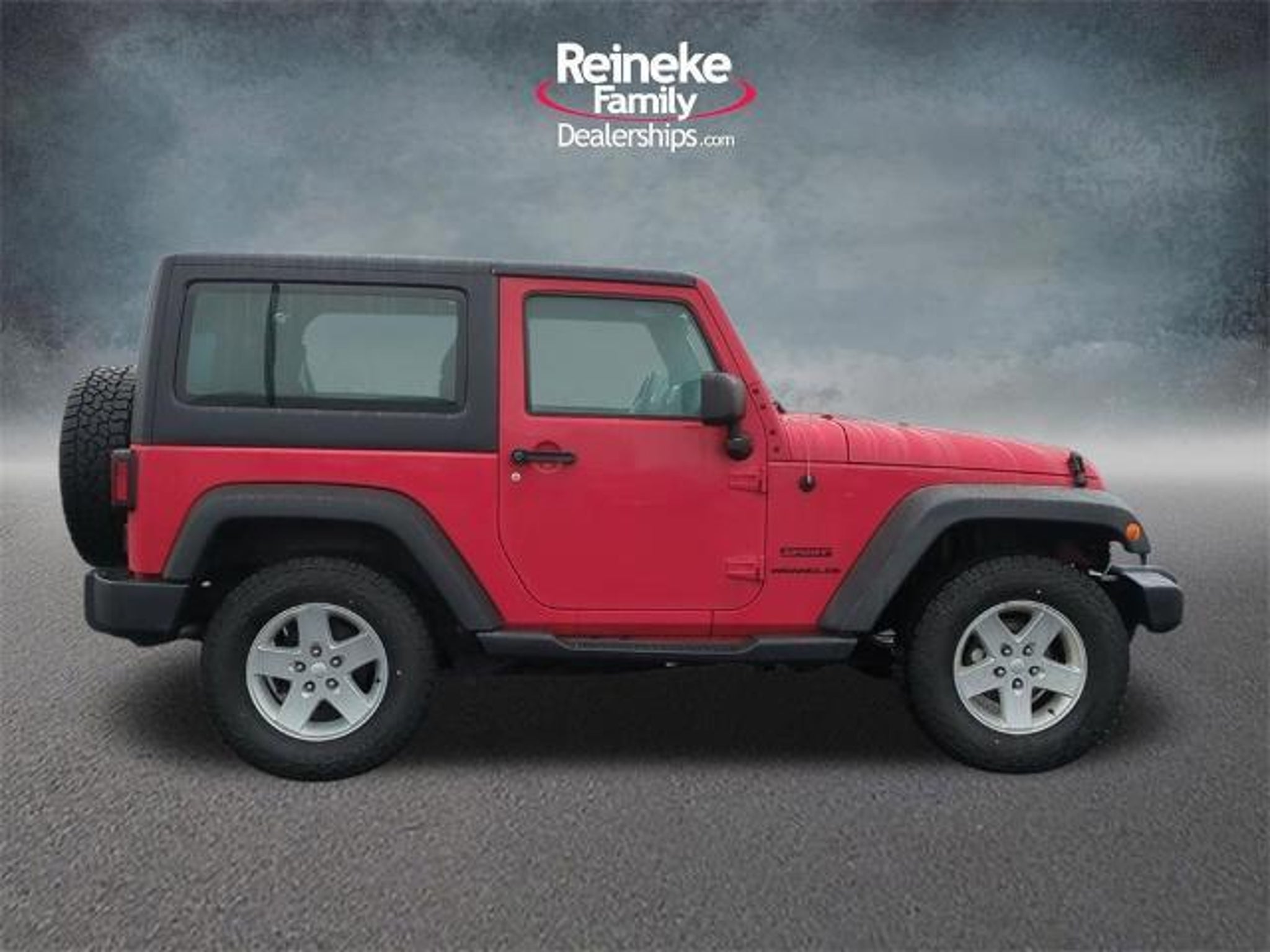2014 Jeep Wrangler Sport 4WD 3.6L V6 24V VVT 5-Speed Automatic 17 x 7.5 Aluminum Wheels, Air Conditioning, Leather Wrapped Steering Wheel, Quick Order Package 24S. Check out all these great options! Quick Order Package 24S (17 x 7.5 Aluminum Wheels, Air Conditioning, Leather Wrapped Steering Wheel, and Chrome/Leather Wrapped Shift Knob), 16 x 7.0 Luxury Styled Steel Wheels, 3.21 Rear Axle Ratio, 4-Wheel Disc Brakes, 6 Speakers, ABS brakes, AM/FM radio, Black 3-Piece Hard Top, Brake assist, CD player, Cloth Bucket Seats, Compass, Delete Sunrider Soft Top, Driver door bin, Driver vanity mirror, Dual front impact airbags, Electronic Stability Control, Freedom Panel Storage Bag, Front anti-roll bar, Front Bucket Seats, Front Center Armrest w/Storage, Front fog lights, Integrated roll-over protection, Low tire pressure warning, Manufacturer's Statement of Origin, Normal Duty Suspension, Occupant sensing airbag, Outside temperature display, Passenger door bin, Passenger vanity mirror, Power steering, Radio: Uconnect 130 AM/FM/CD/MP3, Rear anti-roll bar, Rear Window Defroster, Rear Window Wiper/Washer, Speed control, Steering wheel mounted audio controls, Sunrider Soft Top, Supplemental Front Seat Side Airbags, Tachometer, Tilt steering wheel, Tinted Rear Quarter & Liftgate Windows, Traction control, Trip computer, and Variably intermittent wipers. Awards: * 2014 KBB.com 10 Best SUVs Under $25,000 * 2014 KBB.com 10 Coolest New Cars Under $25,000 * 2014 KBB.com Best Resale Value Awards At Reineke Family of Dealerships, we pride ourselves on delivering a convenient and transparent buying experience. Get your key from Reineke! Please be aware that all listed vehicles are subject to additional applicable sales tax, titling, license, and registration fees, including a registration convenience fee of $50 where applicable and a documentary fee of up to $398. We attempt to update this inventory on a regular basis. However, there can be a delay between the sale of a vehicle and the update of the inventory. Vehicle mileage listed may vary due to vehicle demonstrations. All pre-owned vehicles are represented and sold AS-IS with no dealer warranty, although manufacturer warranty may remain and vehicle may be eligible for an optional vehicle service contract. Although every reasonable effort has been made to ensure the accuracy of the information contained on this site, absolute accuracy cannot be guaranteed, including vehicle equipment, condition and pricing. All vehicles are subject to prior sale, so please give us