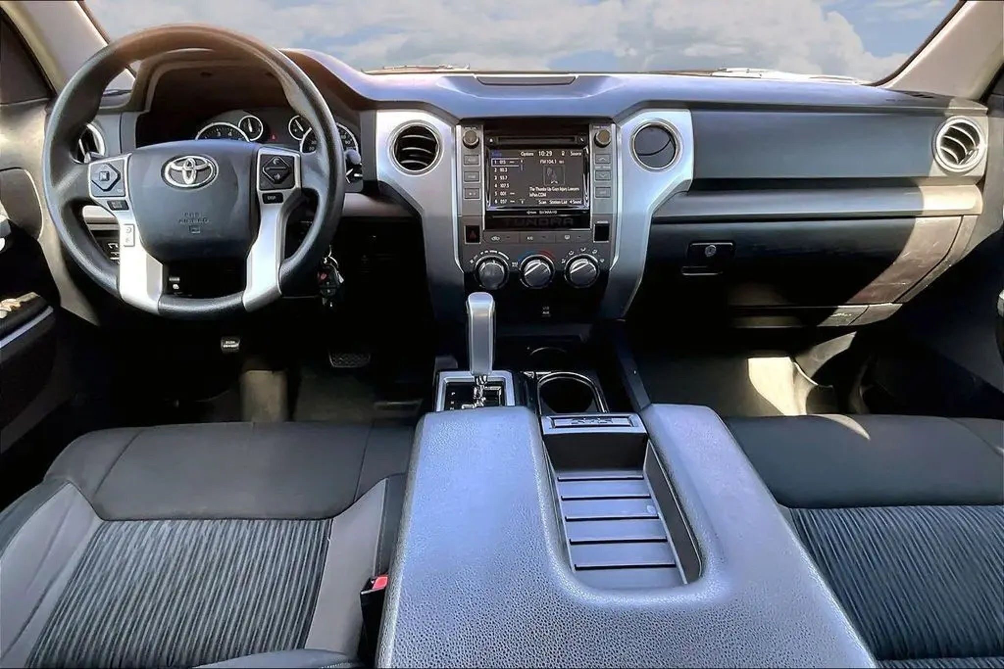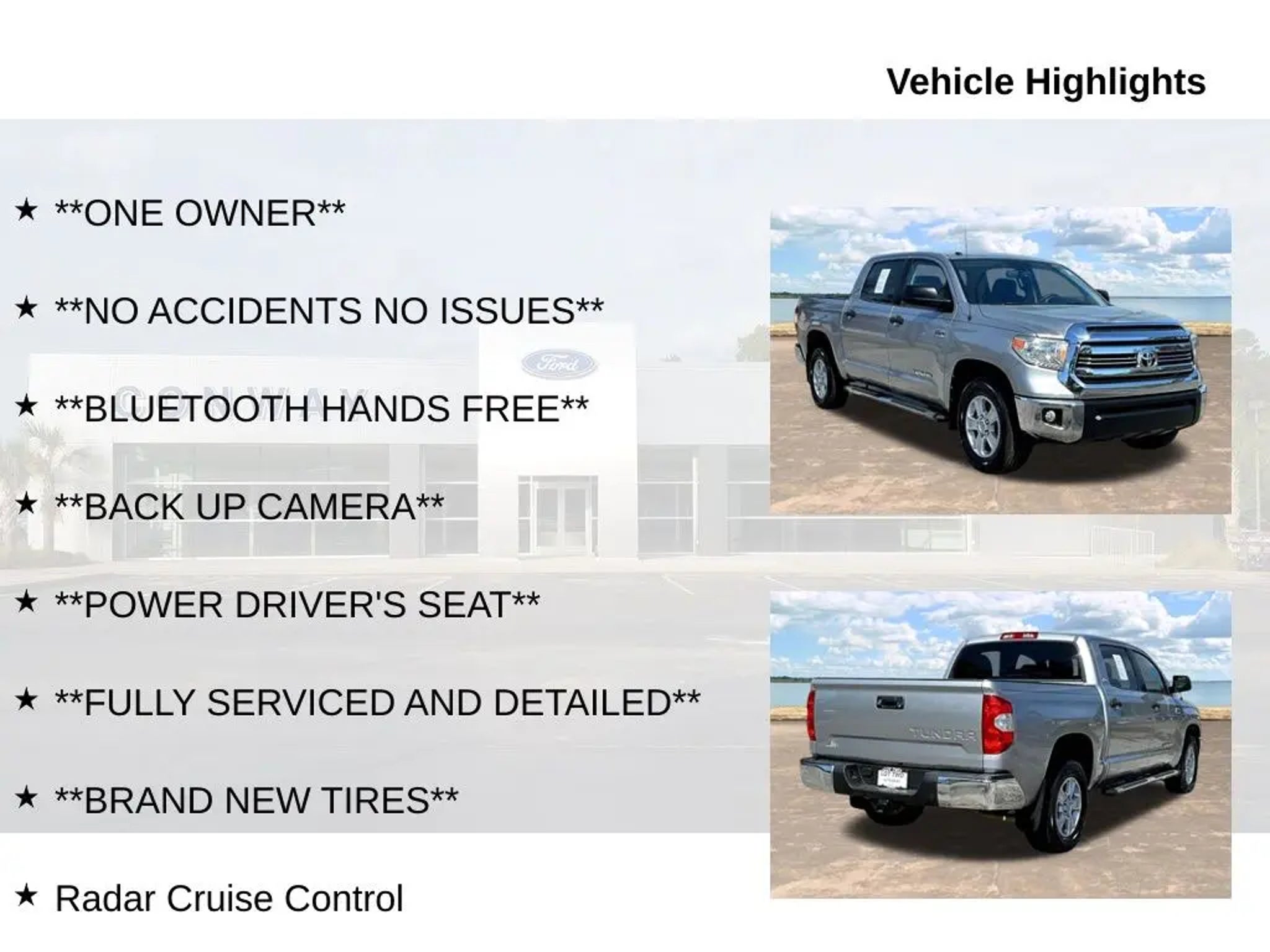 This 2016 Toyota Tundra SR5 CrewMax is a standout choice for drivers seeking a capable, well-equipped, and meticulously maintained full-size pickup. With its powerful i-Force 5.7L V8 engine, this Tundra delivers impressive performance and efficiency, boasting 13 city/18 highway MPG. - **ONE OWNER** - **NO ACCIDENTS NO ISSUES** - **BLUETOOTH HANDS FREE** - **BACK UP CAMERA** - **POWER DRIVER'S SEAT** - **FULLY SERVICED AND DETAILED** - **BRAND NEW TIRES** - Radar Cruise Control - Entune Audio Plus - Trailering Package Vehicle Detailed This Tundra SR5 is more than just a workhorse - it's a well-appointed and thoughtfully equipped truck that caters to your daily driving needs. The Entune Audio Plus system with SiriusXM satellite radio, along with Bluetooth hands-free connectivity, keep you entertained and connected on the go. The backup camera and power driver's seat provide added convenience and comfort. Beyond its impressive features, this Tundra has been meticulously serviced and detailed, ensuring it's ready to provide you with years of reliable and enjoyable ownership. The brand-new tires and comprehensive service history give you the peace of mind that this truck has been well-maintained and is ready to tackle any task or adventure you have in mind. Whether you're hauling heavy loads, towing a trailer, or simply commuting in style, this 2016 Toyota Tundra SR5 CrewMax is an exceptional choice. Its spacious interior, robust capabilities, and wealth of premium amenities make it a standout in the full-size pickup segment. We invite you to experience the exceptional value and quality of this Tundra for yourself. Visit our showroom today and let us demonstrate how this truck can exceed your expectations.