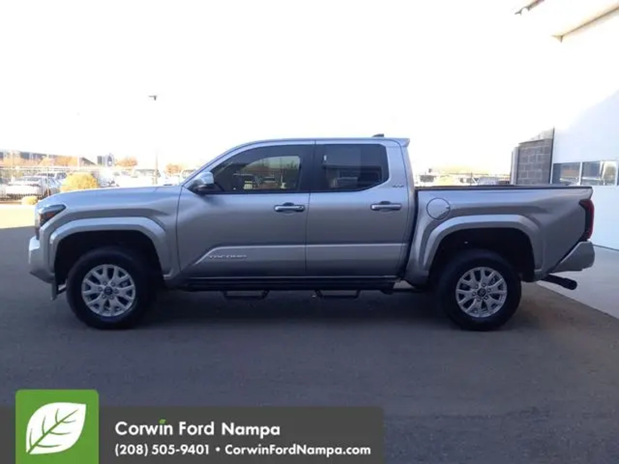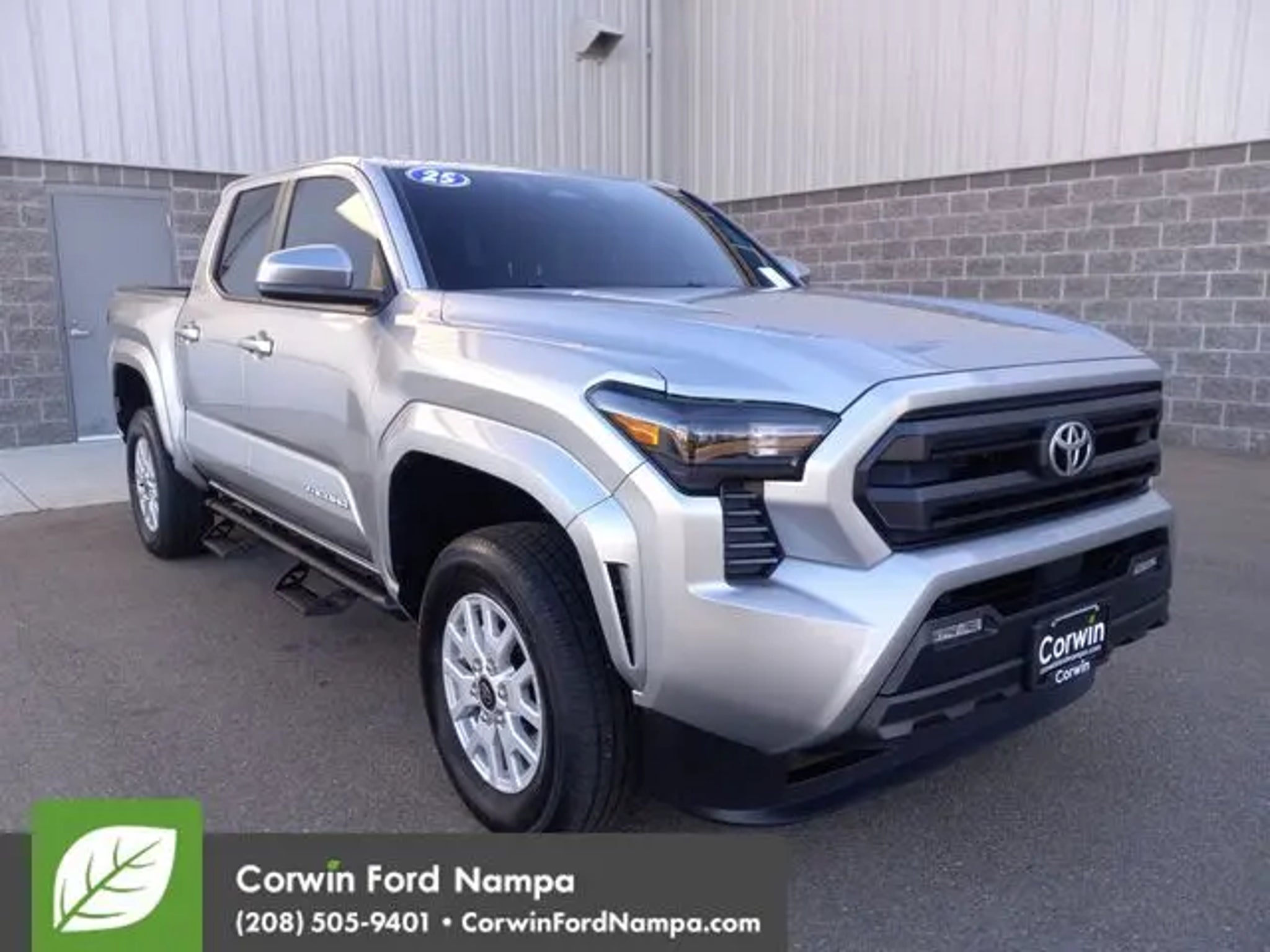 A bold blend of strength and style, our Accident Free, One Owner 2025 Toyota Tacoma SR5 Double Cab 4X4 in Celestial Silver Metallic delivers legendary off-road capability, advanced tech, and rugged design, perfect for tackling tough trails or turning heads around town! Powered by a TurboCharged 2.4 Liter i-FORCE 4 Cylinder providing 278hp to an 8 Speed Automatic transmission for strength to spare. An automatic limited-slip differential and 2-speed transfer case deliver dynamic traction, and this Four Wheel Drive truck sees nearly 24mpg on the highway with an expressive design. Our Tacoma is ready to take on your world with alloy wheels, LED lighting, a bold grille, step bars, a Class IV hitch receiver, and a rugged Sheet Molded Compound bed that resists scuffs and scratches. Load it up and put it to the test! Configured for commanding comfort, our SR5 cabin features supportive cloth seats with rear under-seat storage, a multifunction steering wheel, manual climate control, keyless access, push-button ignition, and a 7-inch driver display that keeps essential information easily visible. The infotainment system makes it easy to connect with an 8-inch touchscreen, voice control, Apple CarPlay®, Android Auto®, WiFi compatibility, Bluetooth®, and six-speaker audio. Toyota takes a proactive approach to safety with features such as Proactive Driving Assist, blind-spot monitoring, automatic braking, adaptive cruise control, a rearview camera, lane-keeping assistance, and more. With all that, our Tacoma SR5 is a legendary leader that owners love! Save this Page and Call for Availability. We Know You Will Enjoy Your Test Drive Towards Ownership! Corwin Ford Nampa! Friendly service and aggressive pricing is why we are your new and pre-owned vehicle dealer serving, Nampa, Boise, Meridian, Caldwell, Kuna, Eagle, Emmett, Idaho City, Wilder, New Plymouth, Star, Middleton, Weiser, Payette, Horseshoe Bend, Mountain Home, Idaho, and surrounding states.