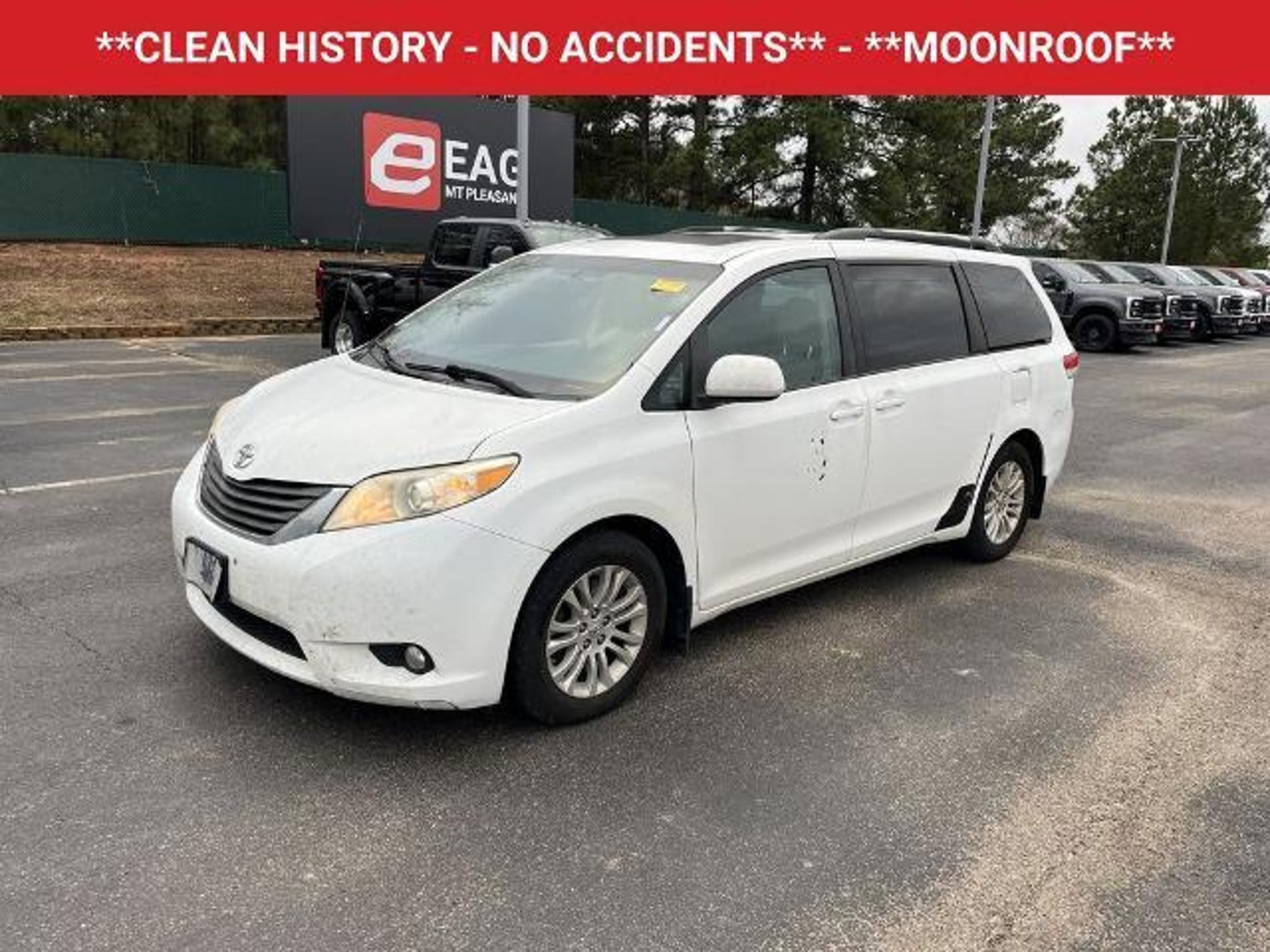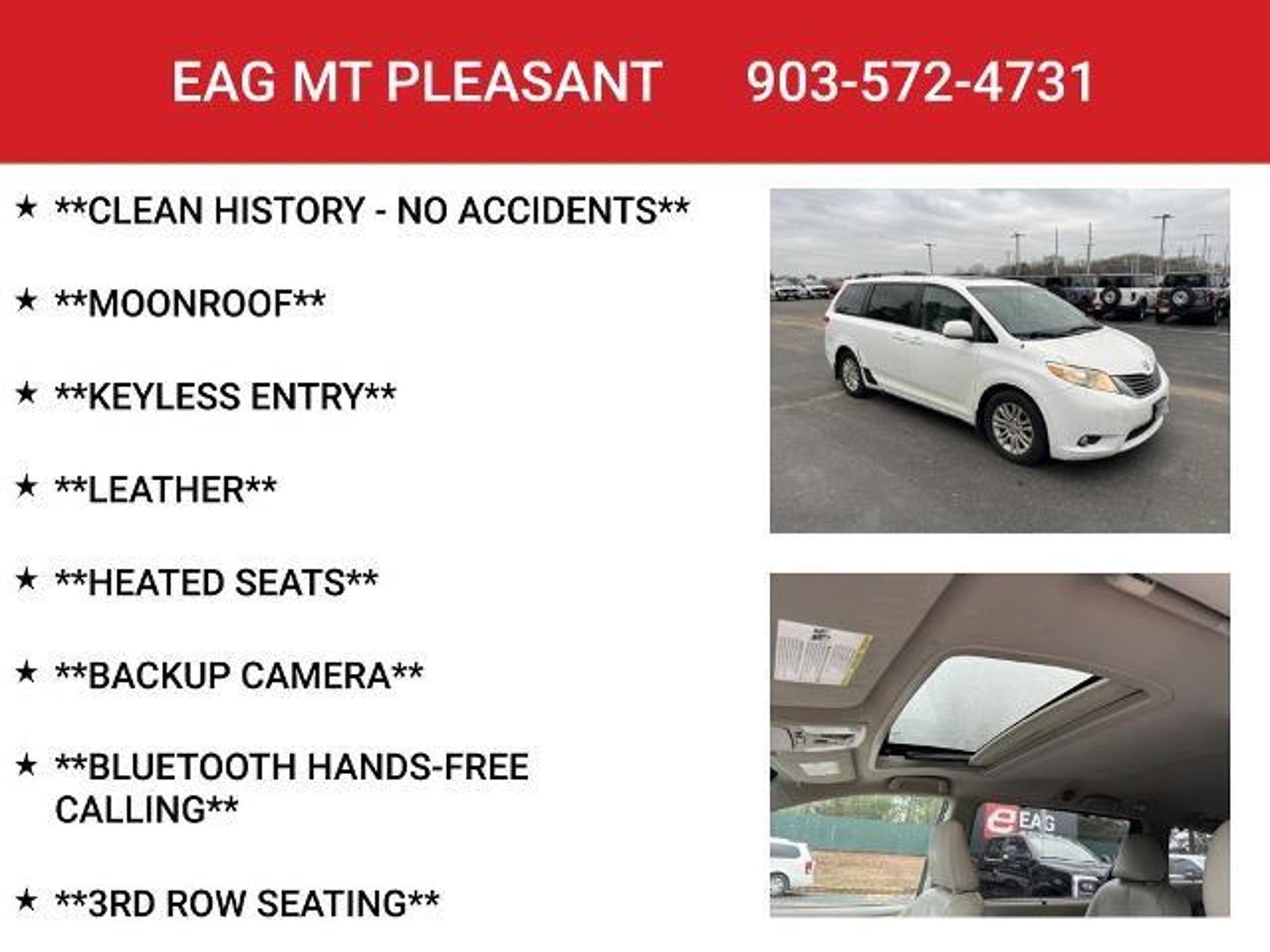 Discover the perfect blend of style, comfort, and convenience with this 2011 Toyota Sienna XLE. This versatile minivan is a true gem, offering an exceptional driving experience and a wealth of premium features to enhance your daily travels. - **CLEAN HISTORY - NO ACCIDENTS** - **MOONROOF** - **KEYLESS ENTRY** - **LEATHER** - **HEATED SEATS** - **BACKUP CAMERA** - **BLUETOOTH HANDS-FREE CALLING** - **3RD ROW SEATING** Powered by a robust 3.5L V6 engine and equipped with a smooth-shifting 6-speed automatic transmission, this Sienna delivers a confident and responsive performance, with an impressive fuel efficiency of 18 city and 24 highway MPG. The spacious interior, with its leather-trimmed seats and heated front buckets, provides a luxurious and comfortable ride for you and your passengers. The convenient power liftgate and split-folding third-row seat offer exceptional versatility, allowing you to easily adapt to your changing cargo and passenger needs. Staying connected on the go is a breeze with the Sienna's advanced technology features, including a premium audio system, Bluetooth hands-free calling, and a rearview camera for effortless parking and maneuvering. The power moonroof and keyless entry further enhance the overall driving experience, making this Sienna a true standout in its class. Whether you're transporting your family, embarking on a road trip, or simply seeking a refined and capable minivan, this 2011 Toyota Sienna XLE is the perfect choice. Experience the perfect blend of style, comfort, and convenience that this exceptional vehicle has to offer. This vehicle is located at EAG Mt. Pleasant, but can be made available upon request. The price listed does not include tax, title, license, or documentation fees ($225). We are located just west of Titus Regional Medical Center on the I-30 frontage road.