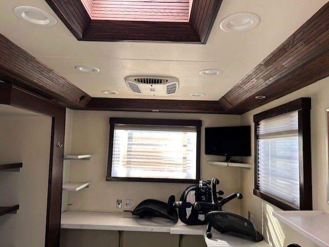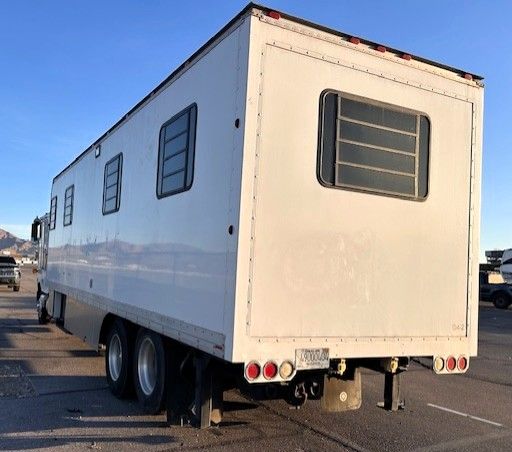Custom made 31' Coach by Quixote, a producer of Luxury Trailers, sound stages and production vehicles. The Coach is very well made with a heavy duty structure. The front slide is 8'7" and the rear slide is 12'3". There is a half bath and three A/C units and comes with a 20kw Kohler generator with 415 hours. The truck is equipped with an L10 Cummins engine and an 8 speed transmission. 33,200 GVW with 10,000lb Tag axle. Original miles on the truck are 157,400. The overall length is 39' and this truck will pull any size of trailer and cruises at 70-75 mph. Pull your trailer and toys down the road in style.