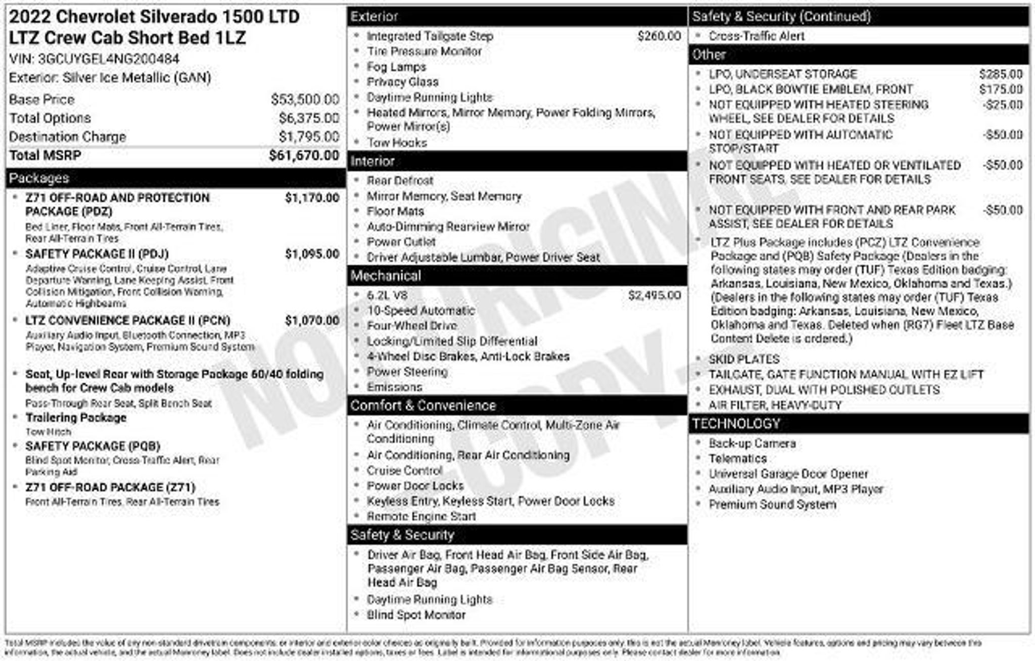 Discover the ultimate in power, capability, and comfort with this exceptional 2022 Chevrolet Silverado 1500 LTD LTZ Z71 Off-Road. This impressive truck is built to conquer any terrain, offering a commanding presence and a wealth of premium features that will elevate your driving experience. At the heart of this Silverado is the potent EcoTec3 6.2L V8 engine, delivering an impressive 420 horsepower and 460 lb-ft of torque. Paired with a smooth-shifting 10-speed automatic transmission and the confidence-inspiring 4-wheel drive system, this truck is ready to tackle any challenge, whether it's hauling heavy loads or conquering off-road adventures. The Z71 Off-Road and Protection Package further enhances the Silverado's capabilities, with features like hill descent control, skid plates, and all-terrain tires. - 6.2L V8 EcoTec3 engine with Dynamic Fuel Management - Z71 Off-Road and Protection Package - Safety Package II with advanced driver assistance technologies - LTZ Convenience Package II with premium Bose audio and wireless charging In addition to its impressive performance, this Silverado LTZ is packed with a wealth of premium features that will elevate your driving experience. The LTZ Convenience Package II includes the Chevrolet Infotainment 3 Premium system with navigation, a Bose premium audio system, and wireless charging for your compatible devices. The Safety Package II adds advanced driver assistance technologies like forward collision alert, lane keep assist, and automatic emergency braking, providing an extra layer of confidence and protection on the road. Stepping inside, you'll be greeted by the Silverado's spacious and well-appointed cabin. The perforated leather-appointed front seats are both heated and ventilated, ensuring maximum comfort in any weather. The multi-flex tailgate offers six functional load/access features, providing unparalleled versatility and convenience. With features like the power sliding rear window, 120-volt bed-mounted power outlet, and the available underseat storage, this Silverado is designed to make your life easier, whether you're hauling gear, towing a trailer, or simply enjoying the ride. Experience the power, capability, and premium features of this 2022 Chevrolet Silverado 1500 LTD LTZ Z71 Off-Road. Visit our showroom today and let us demonstrate how this exceptional truck can elevate your driving experience.