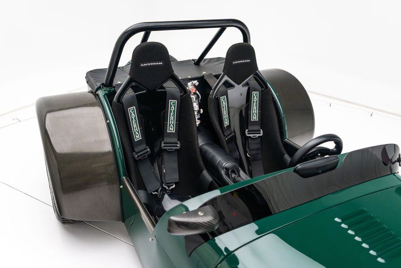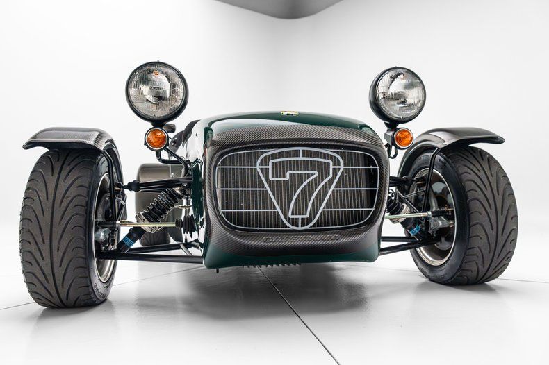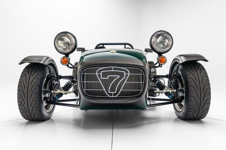 Description: This Caterham Superlight R300 is said to have been built c.2003 at Kampea Motors in Sonoma, California, and it is powered by a 2.0-liter Ford Zetec inline-four with a TWM individual throttle-body assembly. The engine is backed by a six-speed manual transmission and a limited-slip differential. Exposed carbon-fiber components complement the green finish, and the car also has a roll hoop, a tinted windscreen, 13" multi-piece wheels, and a rear-mounted spare. Cockpit appointments include a carbon-fiber dashboard fascia, a MOMO steering wheel, racing seats, and Luke harnesses.