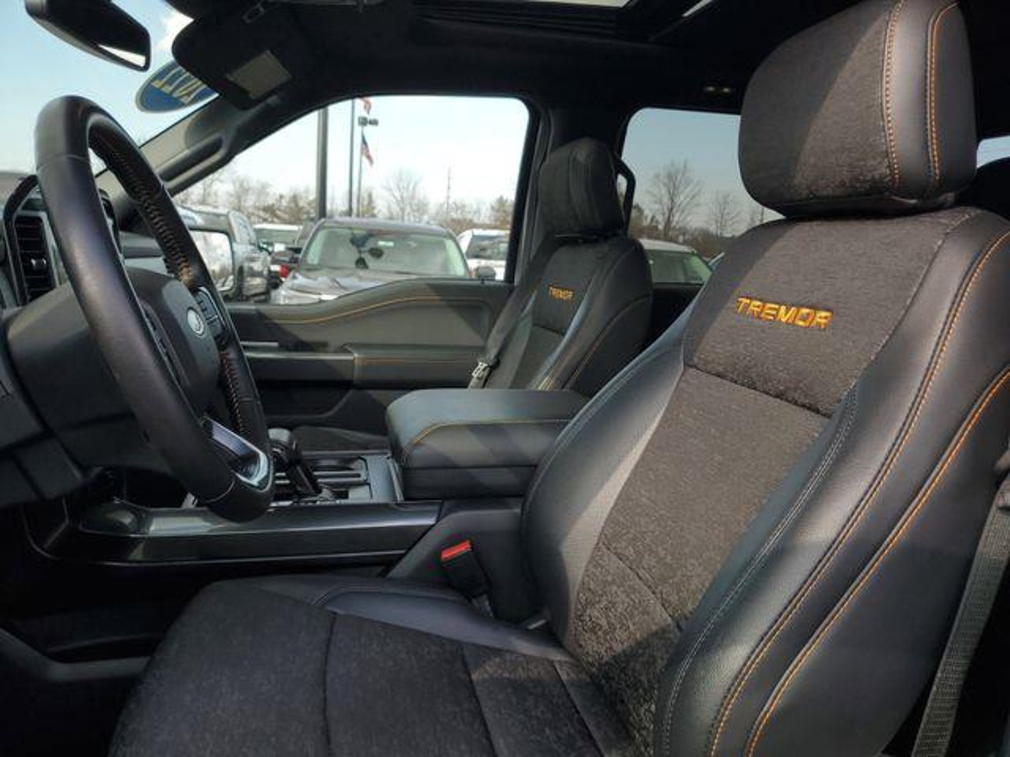 Certified. Ford Gold Certified Certified, 4WD, 4-Wheel Disc Brakes, 6 Speakers, ABS brakes, Air Conditioning, Alloy wheels, AM/FM radio: SiriusXM with 360L, Auto High Beam, Auto High-beam Headlights, Auto Start-Stop Removal, Bed Utility Package, BLIS w/Cross Traffic Alert, Body-Color Door Handles w/Body-Color Bezel, BoxLink, Brake assist, Bumpers: body-color, Carpeted Floor Mats w/Tremor Logo, Class IV Trailer Hitch Receiver, Compass, Connected Navigation & SiriusXM w/360L Removal, Delay-off headlights, Driver door bin, Dual front impact airbags, Dual front side impact airbags, Electronic Locking w/3.73 Axle Ratio, Electronic Stability Control, Emergency communication system: SYNC 4 911 Assist, Equipment Group 401A Mid, Exterior Parking Camera Rear, Ford Co-Pilot360 2.0, Front anti-roll bar, Front Bucket Seats, Front Center Armrest, Front fog lights, Front reading lights, Front wheel independent suspension, Fully automatic headlights, GVWR: 7,050 lbs Payload Package, Heated door mirrors, Illuminated entry, Integrated Trailer Brake Controller, Lane-Keeping System, LED Box Lighting, Low tire pressure warning, Navigation system: Connected Navigation, Occupant sensing airbag, Onboard 400W Outlet, Outside temperature display, Overhead airbag, Overhead console, Panic alarm, Passenger door bin, Passenger vanity mirror, Power door mirrors, Power steering, Power windows, Power-Sliding Rear Window, Pre-Collision Assist w/Automatic Emergency Braking, Pro Trailer Backup Assist, Radio data system, Radio: AM/FM SiriusXM w/360L, Radio: B&O Sound System by Bang & Olufsen, Radio: B&O Unleashed Sound System by Bang & Olufsen, Rear reading lights, Rear step bumper, Rear window defroster, Rear-View Camera, Remote keyless entry, Reverse Sensing System, Security system, Speed control, Speed-sensing steering, Split folding rear seat, Steering wheel mounted audio controls, SYNC 4 w/Enhanced Voice Recognition, Tachometer, Tailgate Step w/Tailgate Work Surface, Telescoping steering wheel, Tilt steering wheel, Traction control, Trail Control, Trailer Tow Package, Trip computer, Twin Panel Moonroof, Unique Sport Cloth 40/Console/40 Front Seat, Unique Sport Cloth 40/Console/40 Power Front Seat, Variably intermittent wipers, Voltmeter, Wheels: 18 Alloy w/Dark Matte Finish, Zone Lighting, 4WD. CARFAX One-Owner.