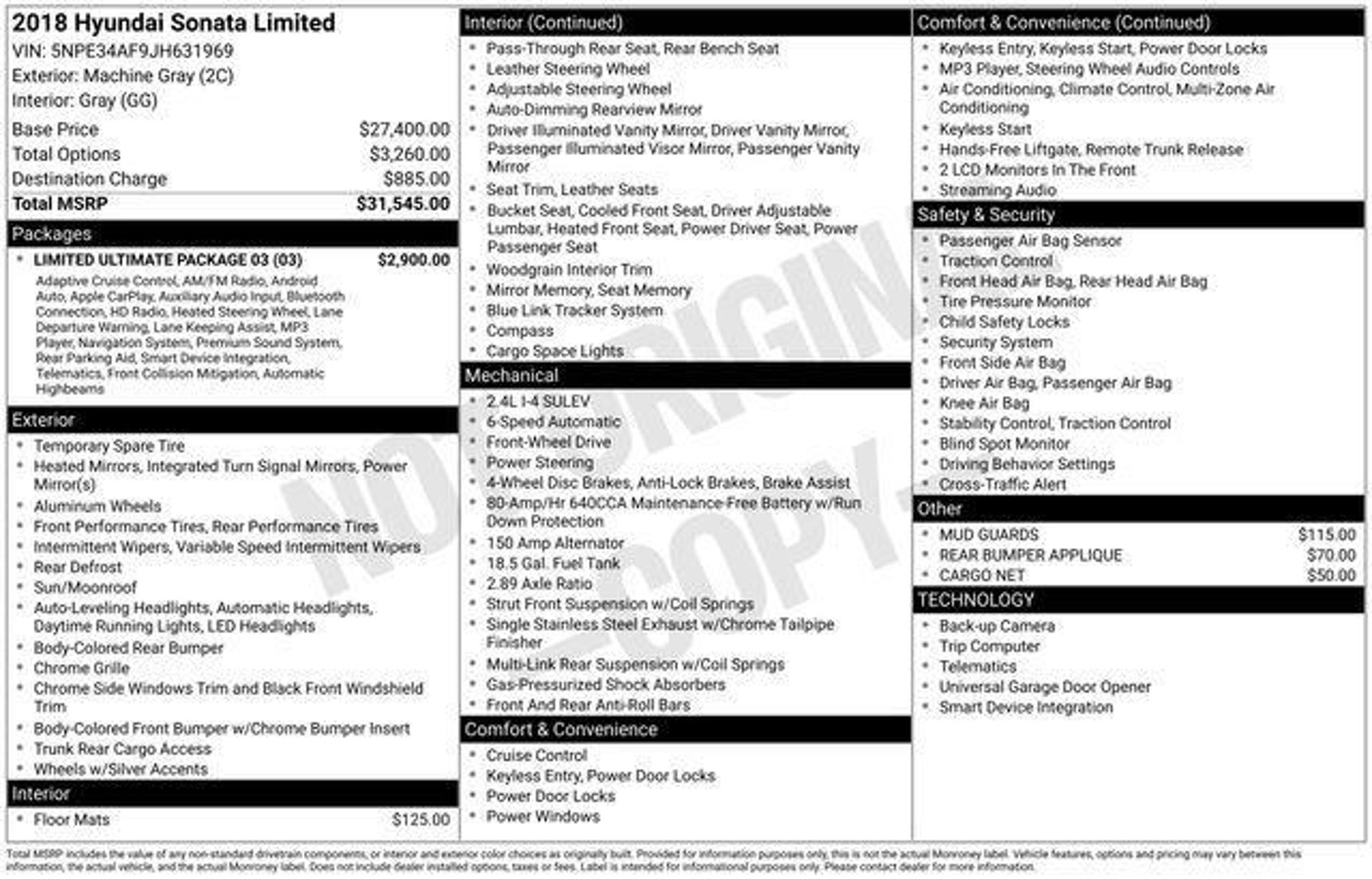 Elevate your driving experience with this meticulously maintained 2018 Hyundai Sonata Limited. This sophisticated sedan boasts a stunning Gray exterior and a wealth of premium features that will captivate the discerning driver. - Local Trade - Great Service History - Triton Certified Classic Vehicle - 3 Month / 4,000 Mile Comprehensive Warranty - 5 Day Return / 30 Day Exchange - Auto Rewards Program - Navigation System - Radio: AM/FM/HD/SiriusXM/MP3 Infinity Prem Audio - Front dual zone A/C - Memory seat - Power driver seat - Remote keyless entry - Steering wheel mounted audio controls - Power moonroof - Exterior Parking Camera Rear - Fully automatic headlights - Heated door mirrors - Power door mirrors - Turn signal indicator mirrors - Apple CarPlay & Android Auto - Blue Link Telematics Gen 2 w/Guidance Beneath its sleek exterior, this Sonata Limited is powered by a robust 2.4L I4 DGI DOHC 16V PZEV engine, delivering an impressive 185 horsepower and exceptional fuel efficiency of 25 city/35 highway MPG. The 6-Speed Automatic with Shiftronic transmission ensures a seamless and responsive driving experience, while the Front-Wheel Drive system provides confident handling in all conditions. The Sonata Limited's comprehensive safety suite includes advanced features like Automatic Emergency Braking, Pedestrian Detection, Lane Keep Assist, and Smart Cruise Control, ensuring your peace of mind on the road. The Triton Certified Classic Vehicle designation further validates the vehicle's exceptional condition and reliability, backed by a comprehensive 3-month/4,000-mile warranty. Indulge in the ultimate in comfort and convenience with the Sonata Limited's premium Leather Seating Surfaces, Heated and Ventilated Front Seats, and Heated Steering Wheel. The Infinity Premium Audio System with 9 speakers and wireless phone charging keep you connected and entertained throughout your journey. Experience the exceptional value and uncompromising quality of this 2018 Hyundai Sonata Limited. Schedule a test drive today and discover the difference that this certified pre-owned sedan can make in your driving experience.