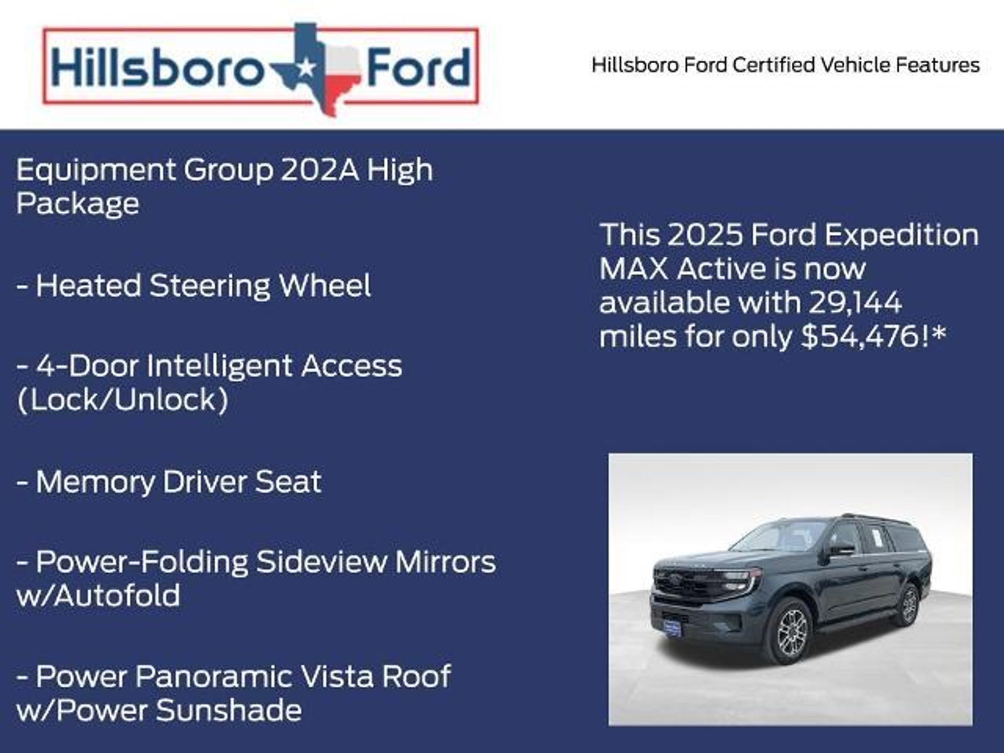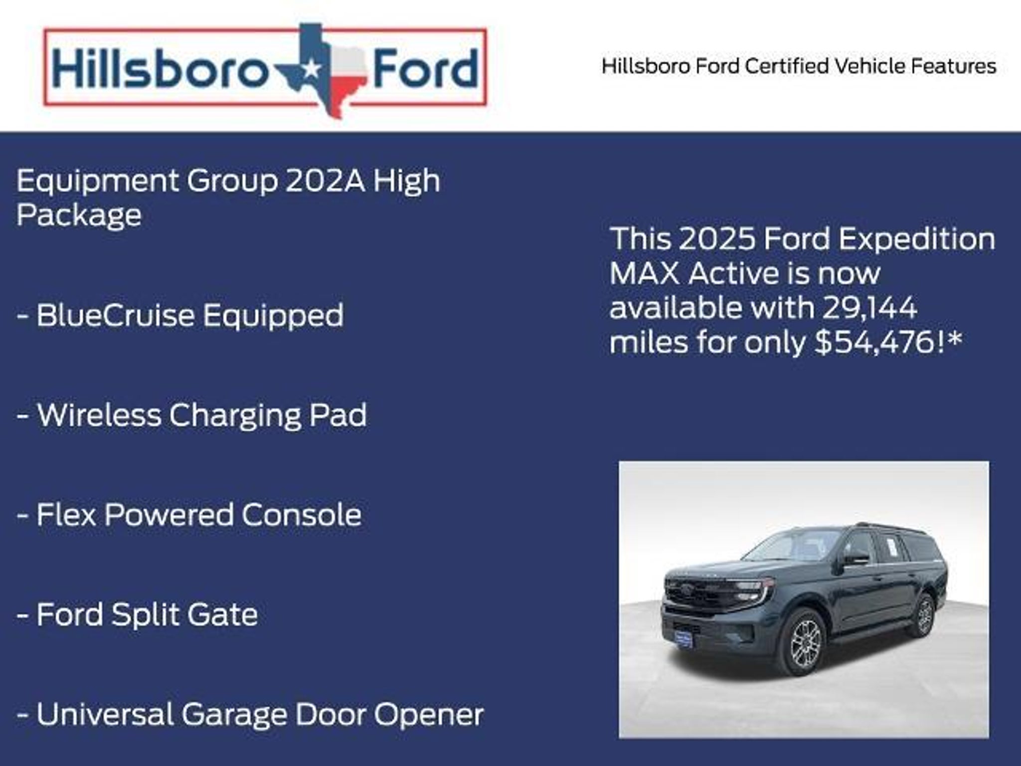 Clean CARFAX. CARFAX One-Owner. Stone Blue Metallic 2025 Ford Expedition Max Active RWD 10-Speed Automatic EcoBoost 3.5L V6 GTDi DOHC 24V Twin Turbocharged 110V/400W AC Power Outlet, 2nd Row Power-Folding 40/20/40 ActiveX Bench Seat, 2nd Row Power-Folding Captain's Chairs, 360-Degree Zone Lighting, 3rd Row Flexible Seating, 3rd Row Vinyl Seats, 4-Door Intelligent Access (Lock/Unlock), ActiveX Front Heated Captain's Chairs, BlueCruise Equipped, Equipment Group 202A High Package, Flex Powered Console, Ford Split Gate, Front Side Laminated Glass, Heated Steering Wheel, Memory Driver Seat, Navigation System, Power Panoramic Vista Roof w/Power Sunshade, Power Tilt/Telescopic Steering Wheel w/Memory, Power-Folding Sideview Mirrors w/Autofold, Rain Sensing Wipers, SecuriCode Keyless Entry Keypad, Universal Garage Door Opener, USB Ports, Wheels: 20 Carbonized Gray Bright Machined Aluminum, Wireless Charging Pad. Recent Arrival! Hillsboro Ford has been in operation since the 1930s. Visit us today and find out for yourself why our reputation has stood the test of time. Our expert sales, service and parts personnel are standing by and waiting to assist you. Drive the short country mile down the road to Hillsboro Ford today. Find out for yourself why our neighbors in Waco, Waxahachie, Whitney, Cleburne and Midlothian have been shopping with us for years. Your new 2025 Ford Expedition Max Active is waiting for you. Vehicle may have an additional $1,495 in dealer adds, see dealer and addendum for details.