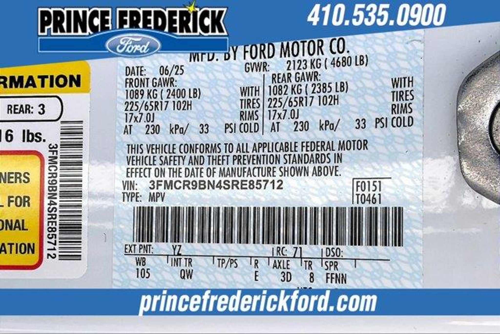 2025 Ford Bronco Sport Big Bend **ONE OWNER, *** 4 WHEEL DRIVE, CONVENIENCE PACKAGE, Bronco Sport Big Bend, 4D Sport Utility, 1.5L EcoBoost, 8-Speed Automatic, 4WD, Oxford White, Convenience Package, Front Driver/Passenger Seat Back Map Pockets, Heated 8-Way Power Driver's Seat, LED Fog Lamps, Premium Wrapped Steering Wheel, Universal Garage Door Opener (UGDO). NO HIDDEN COSTS ! ALL VEHICLE PRICING INCLUDES COMPREHENSIVE 100 POINT MD STATE INSPECTION AND ALL RECONDITIONING FEES. We at PRINCE FREDERICK FORD are driven to provide the finest automotive purchasing and ownership experience by not only meeting the customer's expectations, but consistently exceeding them. Our goal is to become the BEST STORE FOR YOU through an unrivaled DEDICATION TO EXCELLENCE. CALL US AT 1-410-535-0900 OR VISIT US ON THE WEB AT WWW.PRINCEFREDERICK FORD.COM.We at PRINCE FREDERICK FORD are driven to provide the finest automotive purchasing and ownership experience by not only meeting the customer's expectations, but consistently exceeding them. Our goal is to become the world's largest volume dealership through an unrivaled DEDICATION TO EXCELLENCE. CALL US AT 1.410.535.0900 OR visit us on the web at WWW.PRINCEFREDERICKFORD.COM.