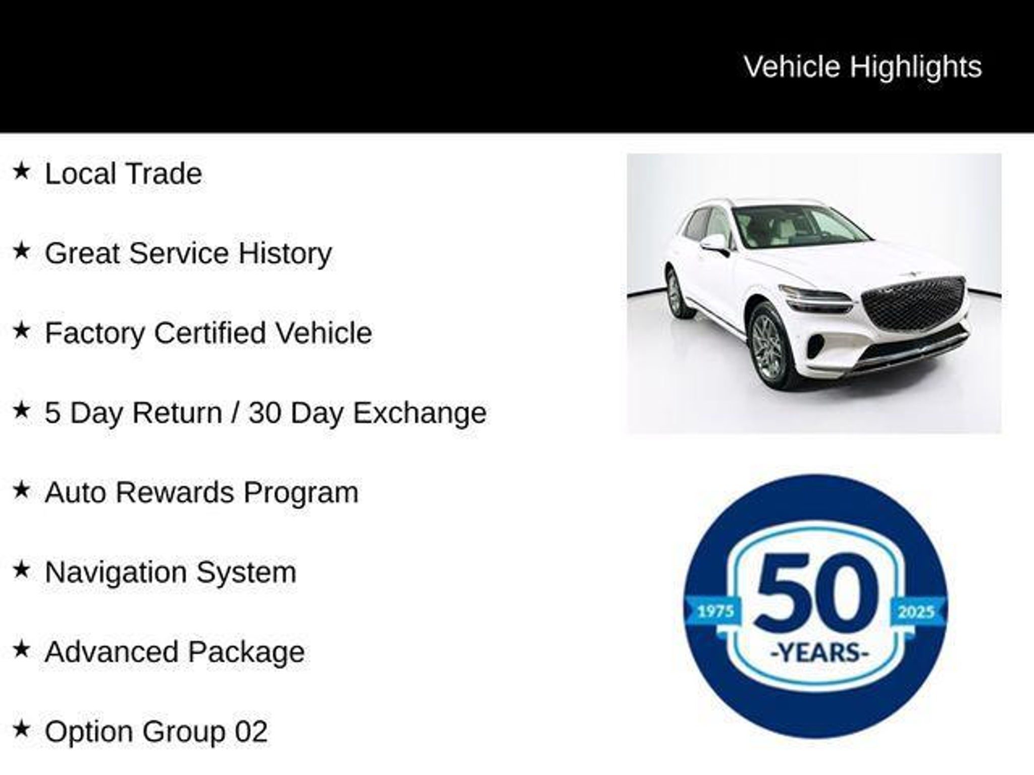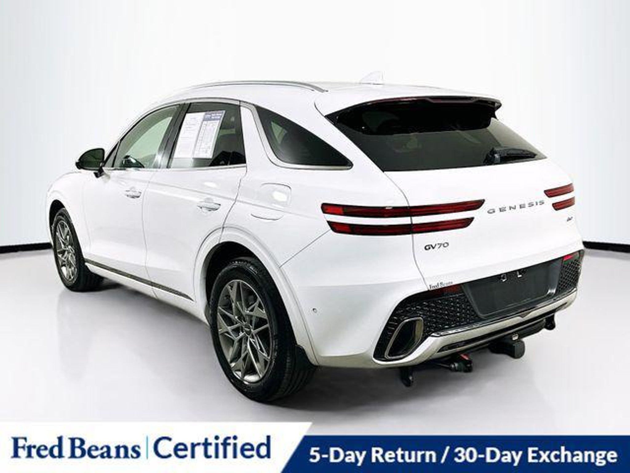 Elevate your driving experience with this exceptional 2023 Genesis GV70 2.5T. Boasting a sleek white exterior and a meticulously maintained interior, this certified pre-owned SUV is a true testament to Genesis' commitment to quality and performance. - Local Trade - Great Service History - Factory Certified Vehicle - 5 Day Return / 30 Day Exchange - Auto Rewards Program - ADVANCED PACKAGE - Ventilated Front Seats - Power Folding ECM Mirrors w/Genesis Logo Lamp - Power Telescoping Steering Wheel - Heated Steering Wheel - Integrated Memory System (IMS) - Power Tilt & Slide Panoramic Sunroof - Blind-Spot View Monitor - Reverse Parking Collision-Avoidance Assist - Lexicon Premium Audio Beneath the striking exterior lies a powerful 2.5L DOHC engine, delivering an impressive 22 city/28 highway MPG. With its advanced all-wheel-drive system, the GV70 2.5T offers exceptional handling and control, ensuring a smooth and confident ride in any condition. - 191 Point Inspection - Roadside Assistance - Warranty Deductible: $50 - Transferable Warranty - Vehicle History - Limited Warranty: 72 Month/75,000 Mile From original in-service date & zero (0) miles - Powertrain Limited Warranty: 120 Month/100,000 Mile From original in-service date & zero (0) miles - Includes 10-year/Unlimited mileage Roadside Assistance with Rental Car & Trip interruption reimbursement, see dealers for specific vehicle eligibility. 3 yrs complimentary Genesis Connected Services. This Genesis GV70 2.5T is more than just a vehicle "“ it's a gateway to a refined and luxurious driving experience. With its impressive list of features and the peace of mind that comes with its certification, this SUV is the perfect choice for the discerning buyer seeking a seamless blend of style, performance, and reliability. Schedule a test drive today and discover the difference that the 2023 Genesis GV70 2.5T can make in your daily commute.
