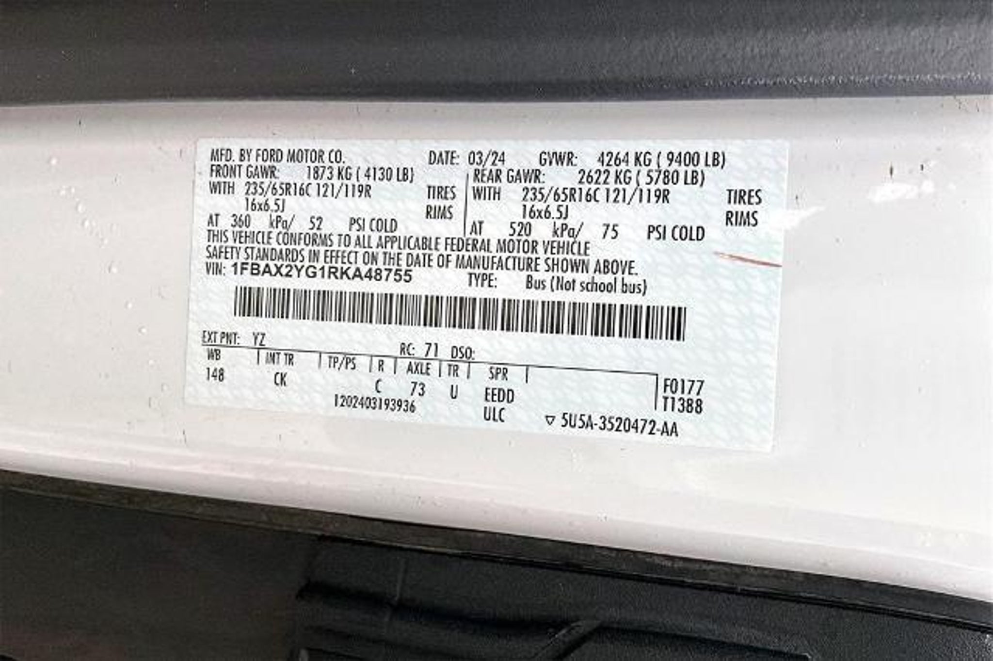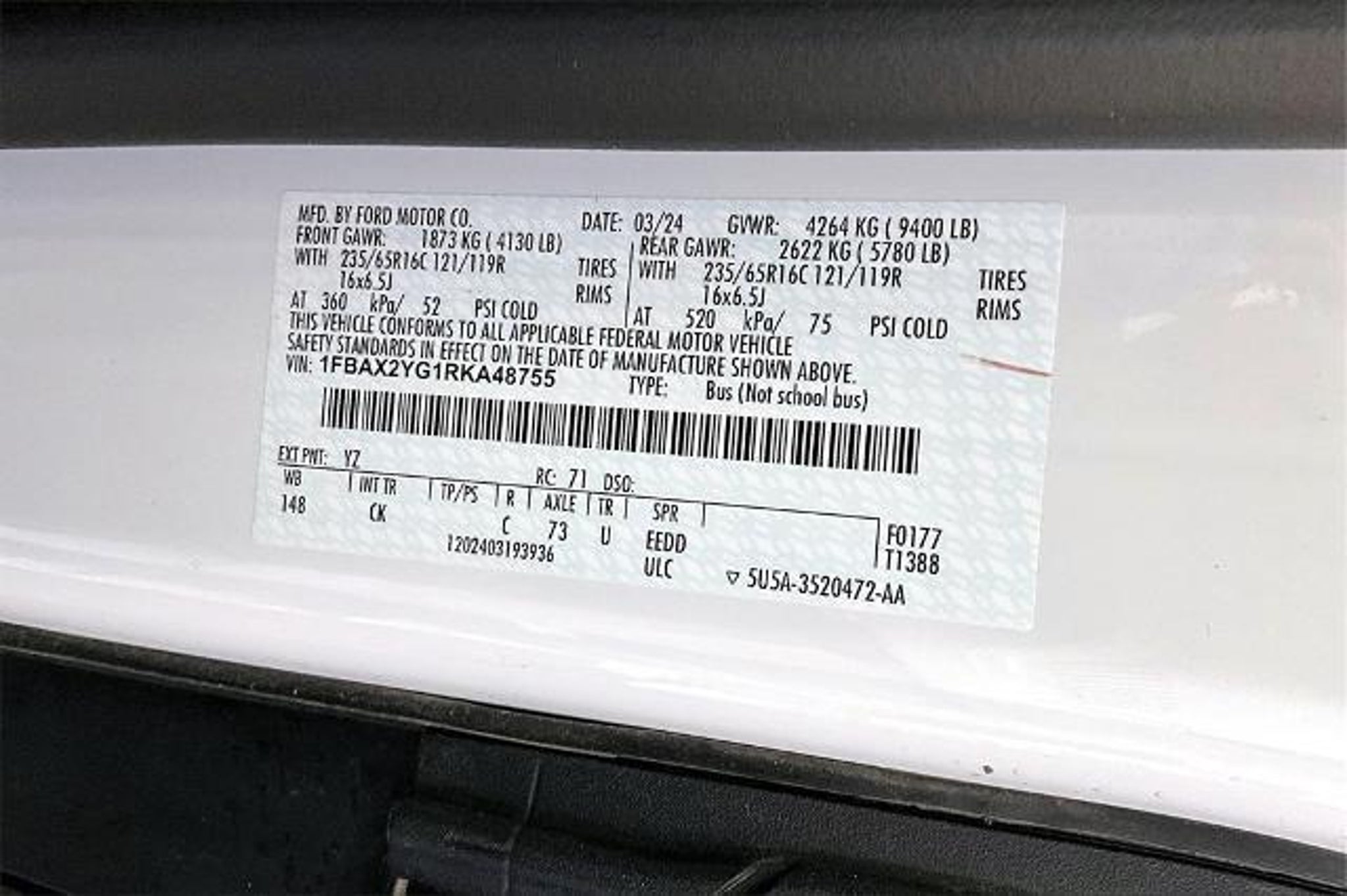 Recent Arrival! Odometer is 5492 miles below market average! Statewide Ford is proud to present you with another True Market Priced Pre-Owned Vehicle. This beautiful 2024 Ford Transit-350 XLT in Oxford White with Gray interior is loaded with the following Factory Options: 3.73 Axle Ratio, 3rd row seats: split-bench, 4-Wheel Disc Brakes, 4th-Row Bench Seat, 8 Speakers, ABS brakes, Air Conditioning, AM/FM radio, Auto High-beam Headlights, Brake assist, Cloth Front Bucket Seats, Dark Palazzo Gray Cloth Bucket Seats, Delay-off headlights, Driver door bin, Driver vanity mirror, Driver's Seat Mounted Armrest, Dual front impact airbags, Dual front side impact airbags, Electronic Air Temperature Control, Electronic Stability Control, Front anti-roll bar, Front Bucket Seats, Front Fog Lamps, Front License Plate Bracket, Front reading lights, Front Sensing System, Front wheel independent suspension, Fully automatic headlights, Illuminated entry, Large Center Console, Low tire pressure warning, Occupant sensing airbag, Overhead airbag, Panic alarm, Passenger door bin, Passenger seat mounted armrest, Passenger vanity mirror, Power door mirrors, Power steering, Power windows, Privacy Glass, Radio: AM/FM Stereo w/SYNC 4 & Nav, Radio: AM/FM Stereo w/SYNC 4/SiriusXM w/360L/Nav, Rain sensing wipers, Rear air conditioning, Rear window defroster, Rear-Window Defroster, Remote keyless entry, Reverse Sensing System, Side Sensing System, Speed control, Steering wheel mounted audio controls, Tachometer, Telescoping steering wheel, Tilt steering wheel, Traction control, Variably intermittent wipers, and Wheels: 16 Steel w/Full Silver Cover.