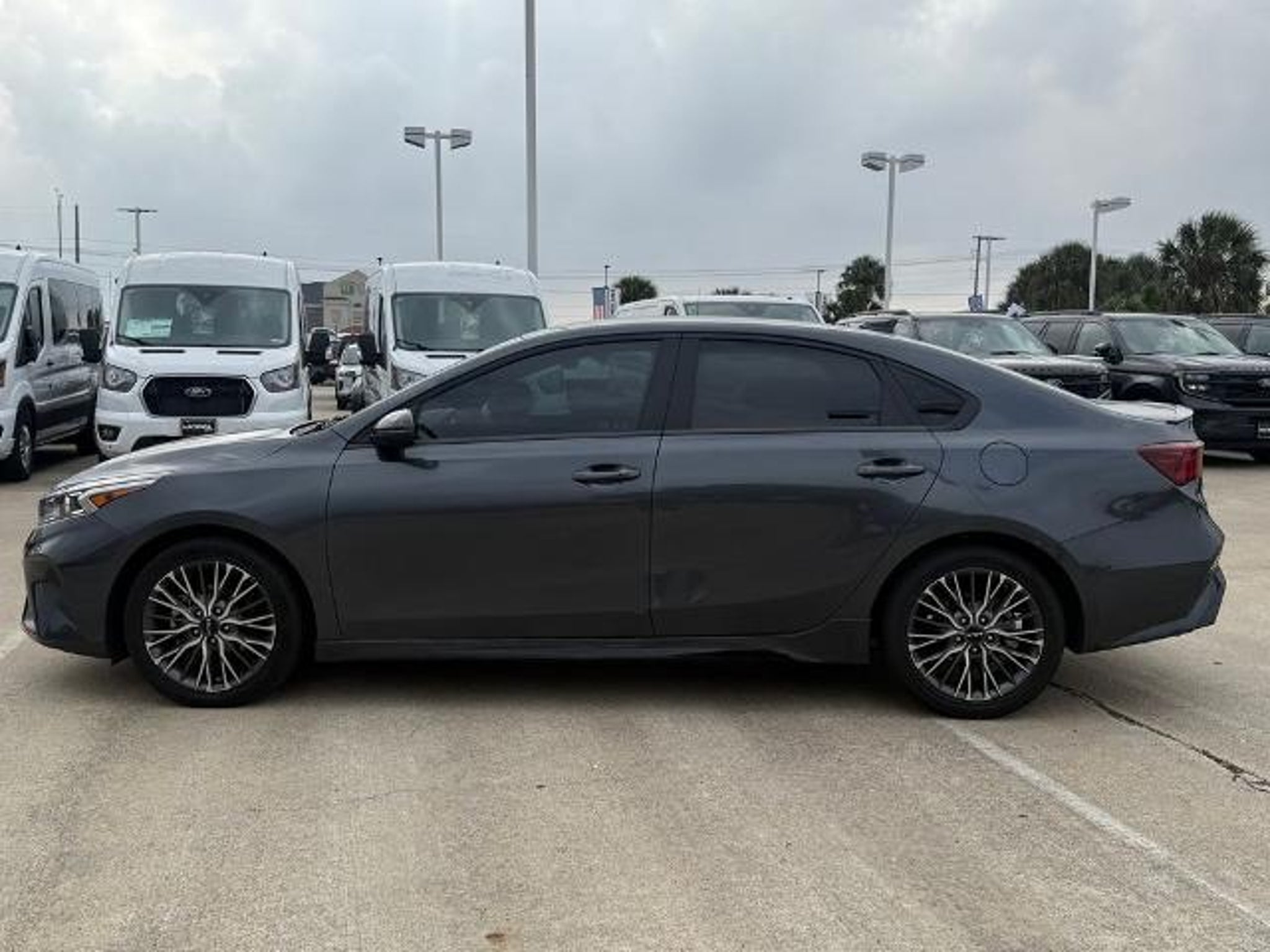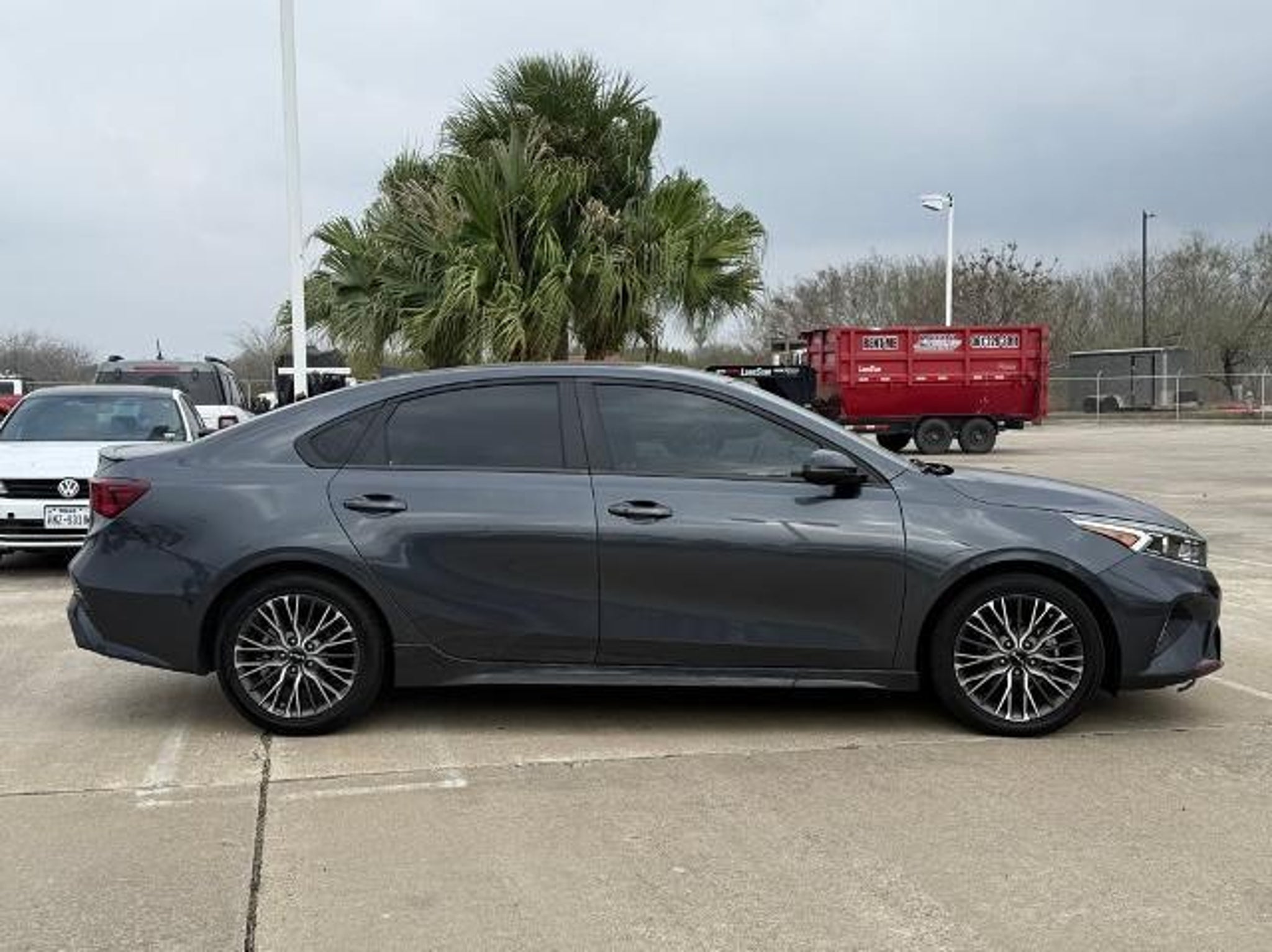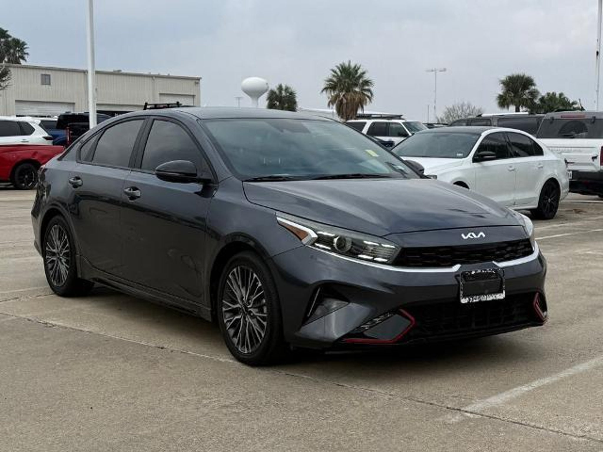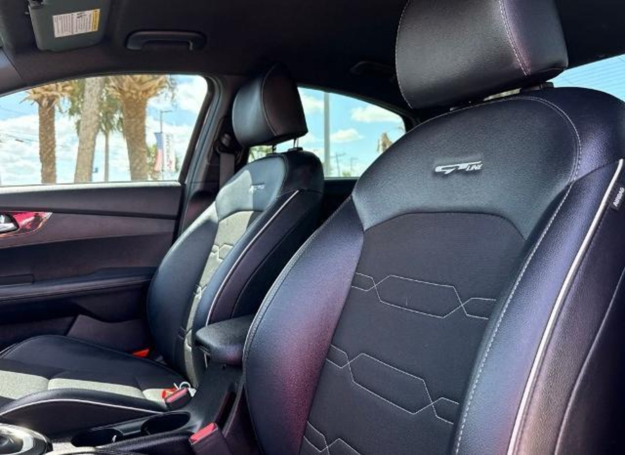 Gravity Gray 2023 Kia Forte GT-Line FWD CVT 2.0L I4 MPI This vehicle comes equipped with the following features and options: 17 x 7.0J Alloy Wheels, 4-Wheel Disc Brakes, 6 Speakers, ABS brakes, Air Conditioning, Alloy wheels, AM/FM radio: SiriusXM, Apple CarPlay & Android Auto, Auto High-beam Headlights, Automatic temperature control, Brake assist, Bumpers: body-color, Cloth & SynTex Seat Trim, Delay-off headlights, Driver door bin, Driver vanity mirror, Dual front impact airbags, Dual front side impact airbags, Electronic Stability Control, Emergency communication system, Exterior Parking Camera Rear, Front anti-roll bar, Front Bucket Seats, Front Center Armrest, Front dual zone A/C, Front fog lights, Front reading lights, Front wheel independent suspension, Fully automatic headlights, Heated door mirrors, Illuminated entry, Leather Shift Knob, Leather steering wheel, Low tire pressure warning, Navigation System, Occupant sensing airbag, Outside temperature display, Overhead airbag, Overhead console, Panic alarm, Passenger door bin, Passenger vanity mirror, Power door mirrors, Power steering, Power windows, Radio data system, Radio: 10.25 Display Audio, Rear seat center armrest, Rear window defroster, Remote keyless entry, Security system, Speed control, Split folding rear seat, Spoiler, Sport steering wheel, Steering wheel mounted audio controls, Tachometer, Telescoping steering wheel, Tilt steering wheel, Traction control, Trip computer, Turn signal indicator mirrors, and Variably intermittent wipers. Odometer is 12472 miles below market average! 28/39 City/Highway MPG