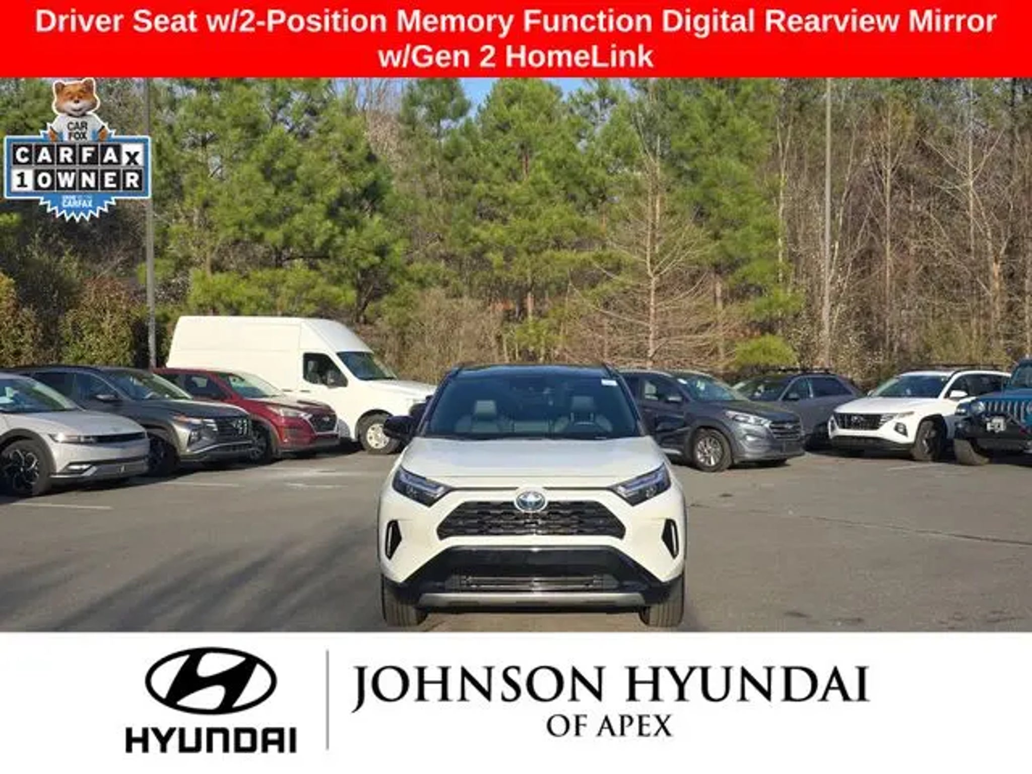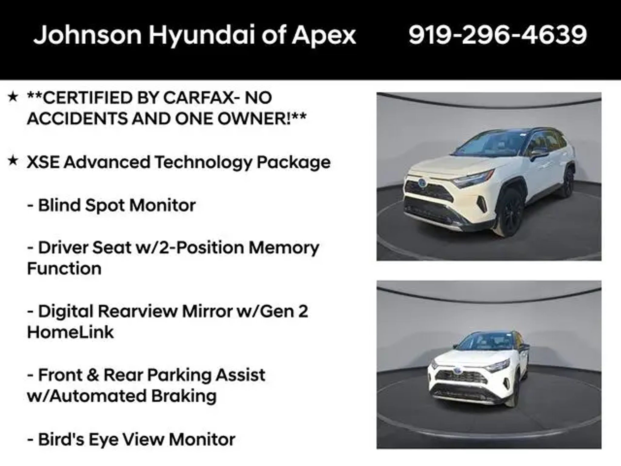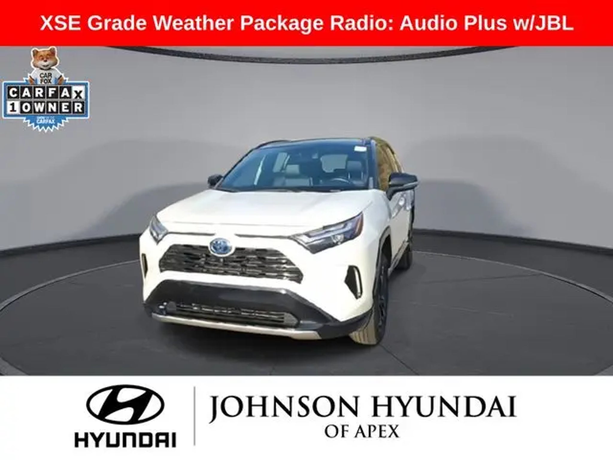 2022 Toyota RAV4 Hybrid XSE Blizzard Pearl/Midnight Black Metallic AWD eCVT Recent Arrival! **CERTIFIED BY CARFAX- NO ACCIDENTS AND ONE OWNER!**, Apple CarPlay/Android Auto, Auto-dimming Rear-View mirror, Automatic temperature control, Bird's Eye View Monitor, Blind Spot Monitor, Digital Rearview Mirror w/Gen 2 HomeLink, Driver Seat w/2-Position Memory Function, Front & Rear Parking Assist w/Automated Braking, Front dual zone A/C, Front fog lights, Fully automatic headlights, Garage door transmitter: HomeLink, Heated 3-Spoke Leather Steering Wheel, Heated door mirrors, Heated Front Seats, Intelligent Clearance Sonar (ICS), Lane Departure Warning System, Leather Shift Knob, Panoramic Glass Roof, Power driver seat, Power Liftgate, Qi-Compatible Wireless Smartphone Charging, Radio: Audio Plus w/JBL, Rain Sensing Front Wipers, Smart Key System w/Push Button Start, SofTex Seat Trim (EC), Telescoping steering wheel, Wheels: 18 x 7.0J Black-Painted Aluminum Alloy, Wiper Deicer, XSE Advanced Technology Package, XSE Grade Weather Package. BENEFITS OF HYUNDAI CERTIFIED PRE-OWNED VEHICLES: Hyundai Certified Pre-Owned (CPO) vehicles come with a manufacturer's warranty, are high quality, and in like-new condition! But not every Hyundai makes the Cut! All Hyundai Certified Pre-Owned vehicles must be five (5) model years or newer, with less than 80,000 miles. They must also pass a comprehensive 173-point quality assurance inspection and have a clean, non-branded title as verified by a CARFAX Vehicle History ReportTM. Every CPO Hyundai provides the Following Additional Value!: *10 Years / 100k Mile Limited Powertrain Warranty! *10 Year Unlimited Mileage Roadside Assistance and Travel Protection with Rental Car at No Charge! *Free Vehicle Carfax Report! *3 Month All Access No Cost Trial of Sirius XM Radio! **That is $2,000 of Additional Value! More than Ever Before!! ***ALL NEW HYUNDAIS COME WITH 3 YEARS / 36,000 MILE COMPLIMENTARY MAINTENANCE!!!*** Price Requires Manufacture Lender Standard Financing *Price plus dealer installed accessories.**Please see dealer for details. Price Requires Manufacture Lender Standard Financing *Price plus dealer installed accessories.**Please see dealer for details.