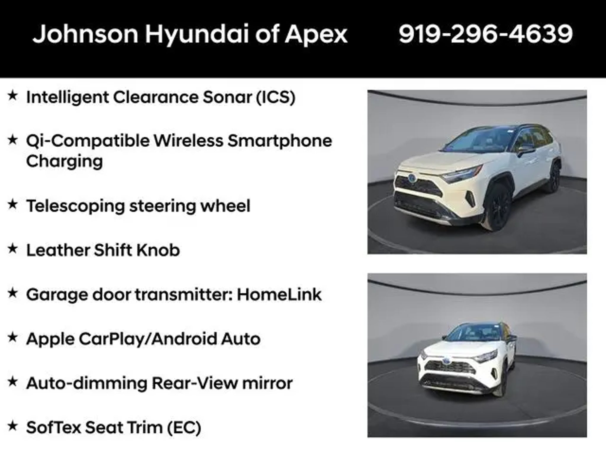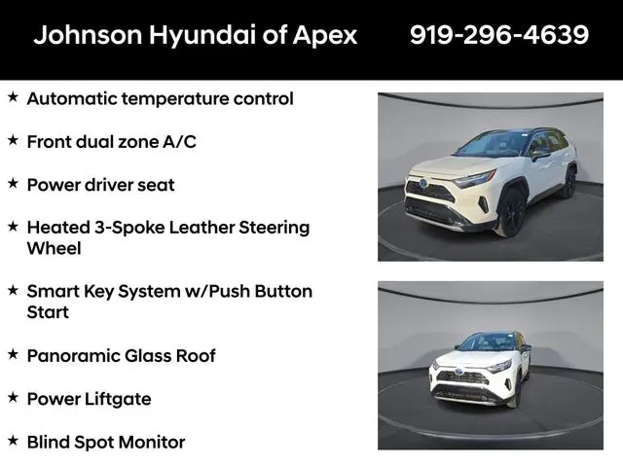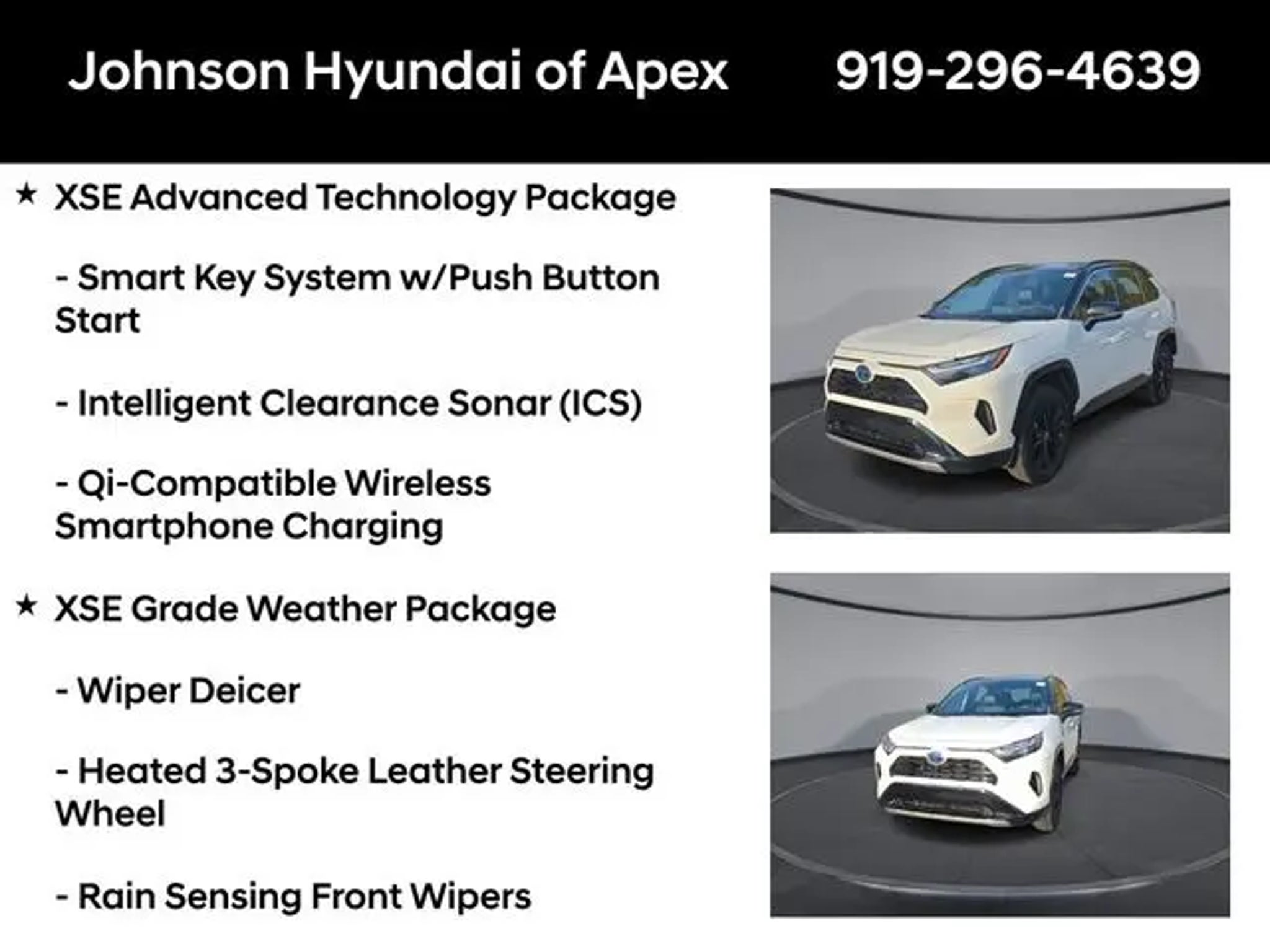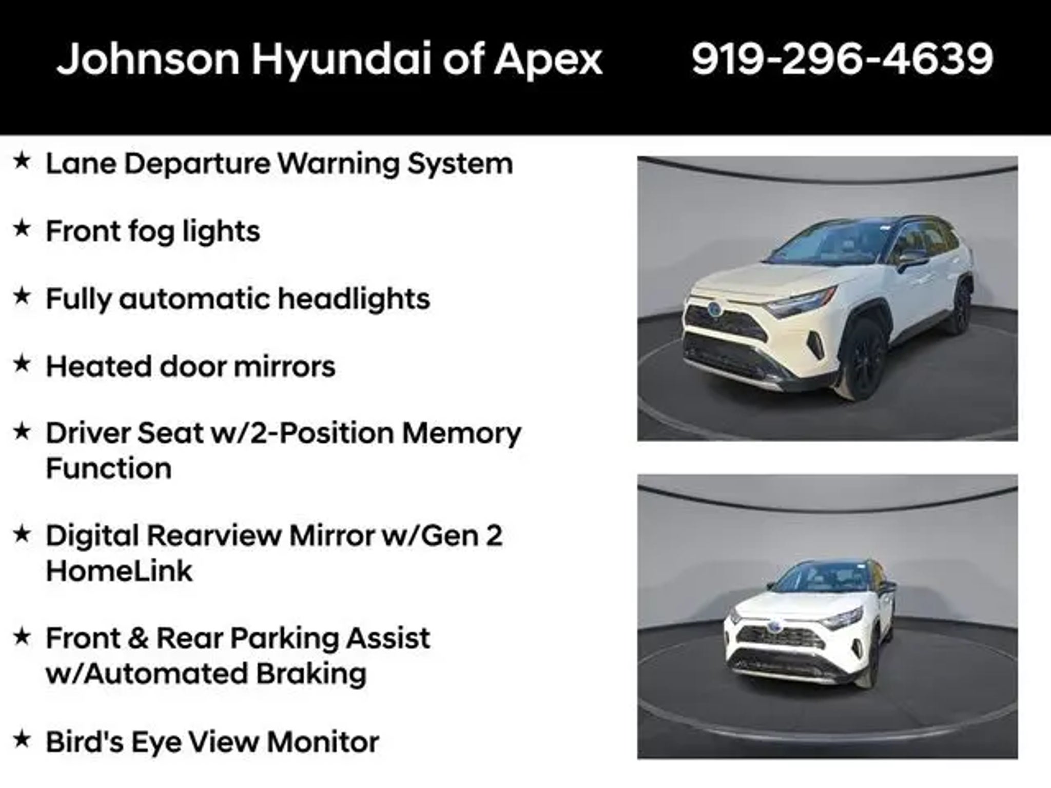 2022 Toyota RAV4 Hybrid XSE Blizzard Pearl/Midnight Black Metallic AWD eCVT Recent Arrival! **CERTIFIED BY CARFAX- NO ACCIDENTS AND ONE OWNER!**, Apple CarPlay/Android Auto, Auto-dimming Rear-View mirror, Automatic temperature control, Bird's Eye View Monitor, Blind Spot Monitor, Digital Rearview Mirror w/Gen 2 HomeLink, Driver Seat w/2-Position Memory Function, Front & Rear Parking Assist w/Automated Braking, Front dual zone A/C, Front fog lights, Fully automatic headlights, Garage door transmitter: HomeLink, Heated 3-Spoke Leather Steering Wheel, Heated door mirrors, Heated Front Seats, Intelligent Clearance Sonar (ICS), Lane Departure Warning System, Leather Shift Knob, Panoramic Glass Roof, Power driver seat, Power Liftgate, Qi-Compatible Wireless Smartphone Charging, Radio: Audio Plus w/JBL, Rain Sensing Front Wipers, Smart Key System w/Push Button Start, SofTex Seat Trim (EC), Telescoping steering wheel, Wheels: 18 x 7.0J Black-Painted Aluminum Alloy, Wiper Deicer, XSE Advanced Technology Package, XSE Grade Weather Package. BENEFITS OF HYUNDAI CERTIFIED PRE-OWNED VEHICLES: Hyundai Certified Pre-Owned (CPO) vehicles come with a manufacturer's warranty, are high quality, and in like-new condition! But not every Hyundai makes the Cut! All Hyundai Certified Pre-Owned vehicles must be five (5) model years or newer, with less than 80,000 miles. They must also pass a comprehensive 173-point quality assurance inspection and have a clean, non-branded title as verified by a CARFAX Vehicle History ReportTM. Every CPO Hyundai provides the Following Additional Value!: *10 Years / 100k Mile Limited Powertrain Warranty! *10 Year Unlimited Mileage Roadside Assistance and Travel Protection with Rental Car at No Charge! *Free Vehicle Carfax Report! *3 Month All Access No Cost Trial of Sirius XM Radio! **That is $2,000 of Additional Value! More than Ever Before!! ***ALL NEW HYUNDAIS COME WITH 3 YEARS / 36,000 MILE COMPLIMENTARY MAINTENANCE!!!*** Price Requires Manufacture Lender Standard Financing *Price plus dealer installed accessories.**Please see dealer for details. Price Requires Manufacture Lender Standard Financing *Price plus dealer installed accessories.**Please see dealer for details.