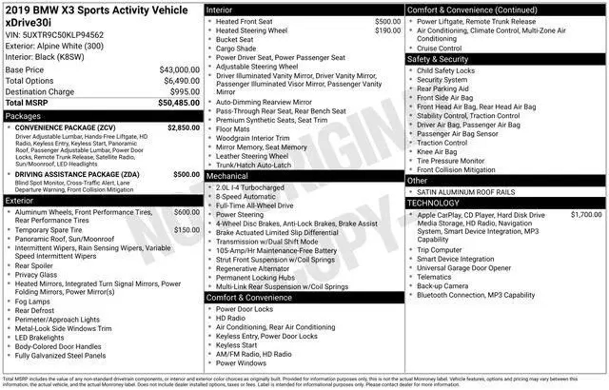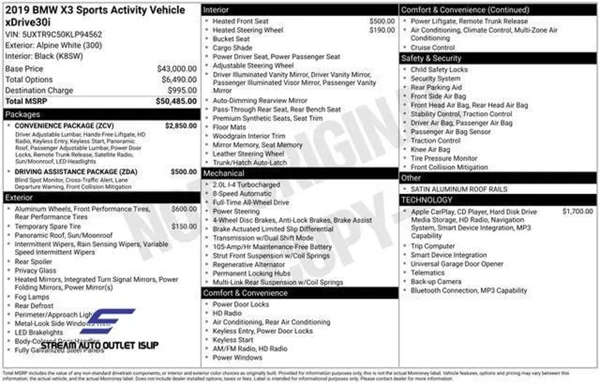 Discover the exceptional 2019 BMW X3 xDrive30i, a premium SUV that seamlessly blends performance, technology, and sophistication. This meticulously maintained vehicle offers a captivating driving experience and a wealth of advanced features to enhance your daily commute and weekend adventures. - Convenience Package: Includes LED Headlights with Cornering Lights, Comfort Access Keyless Entry, Lumbar Support, Panoramic Moonroof, SiriusXM Satellite Radio, and a 1-year All Access subscription. - Navigation System: Featuring in-dash CD player, Advanced Real-Time Traffic Information, Apple CarPlay Compatibility, and a 1-year trial of Remote Services. - Driving Assistance Package: Includes Lane Departure Warning, Active Blind Spot Detection, Active Driving Assistant, and Rear Cross-Traffic Alert for added peace of mind. - Heated Front Seats and Heated Steering Wheel for your comfort in any weather. Powered by a potent 2.0L I4 TwinPower Turbo engine and paired with an 8-speed automatic transmission, this BMW X3 delivers an impressive balance of power and efficiency, with an EPA-estimated 22 MPG in the city and 29 MPG on the highway. The xDrive all-wheel-drive system ensures confident handling and traction, making this SUV a true joy to drive, whether navigating winding roads or tackling inclement conditions. The exterior of this BMW X3 is adorned in a sleek and sophisticated White finish, complemented by the striking 19-inch V-spoke alloy wheels. Step inside and you'll be greeted by a spacious and well-appointed cabin, featuring premium SensaTec upholstery, a Panoramic Moonroof, and a premium audio system with 12 speakers for an immersive listening experience. This exceptional 2019 BMW X3 xDrive30i is an exceptional value, priced at just $15,695. With its blend of performance, technology, and luxury, this SUV is the perfect companion for the discerning driver who demands the best. We invite you to schedule a test drive and experience the exceptional capabilities of this remarkable vehicle for yourself.