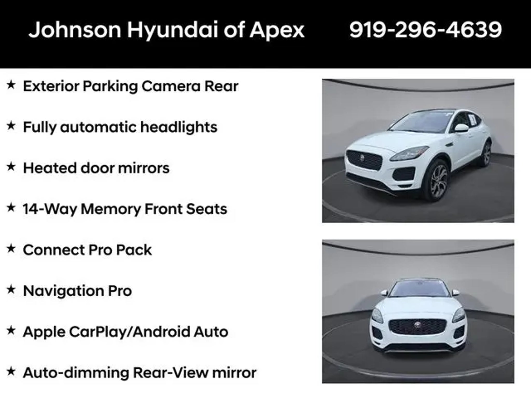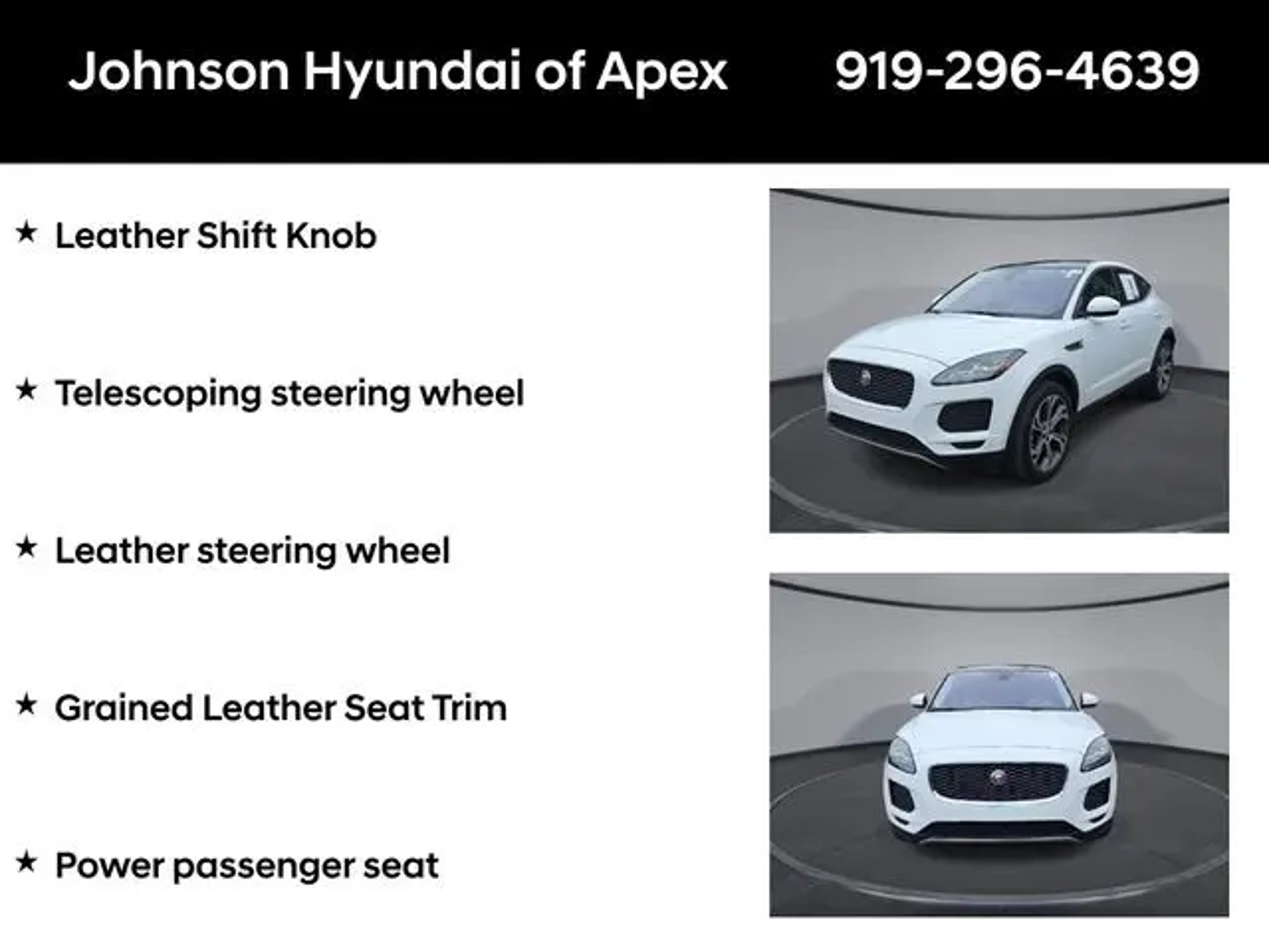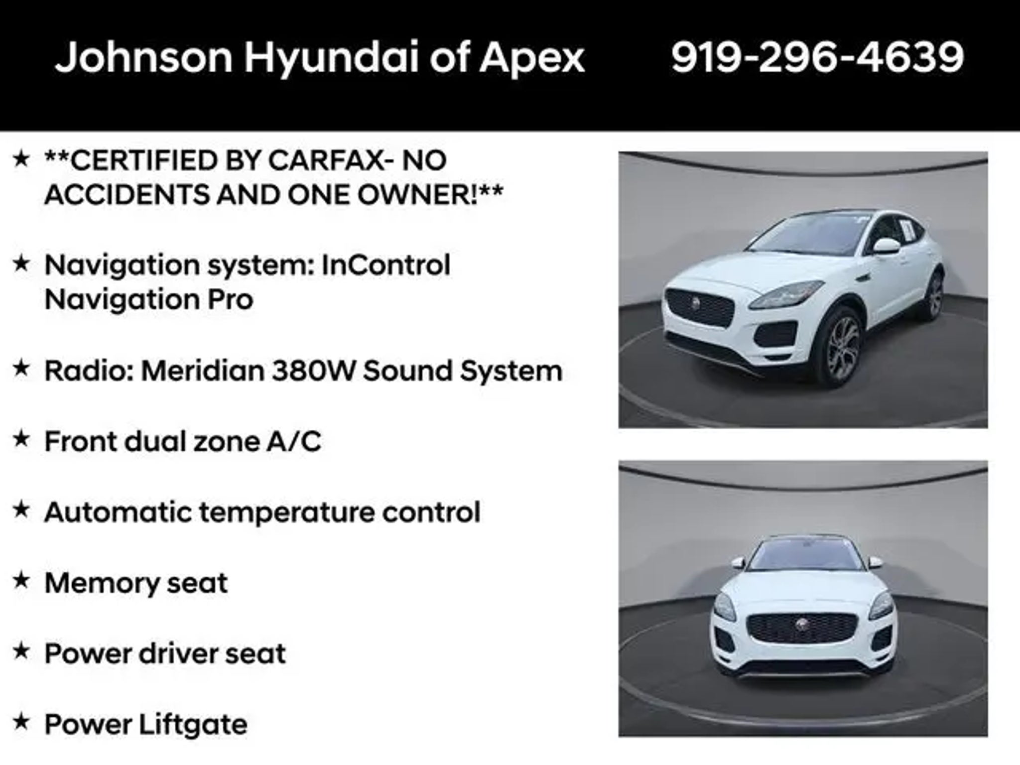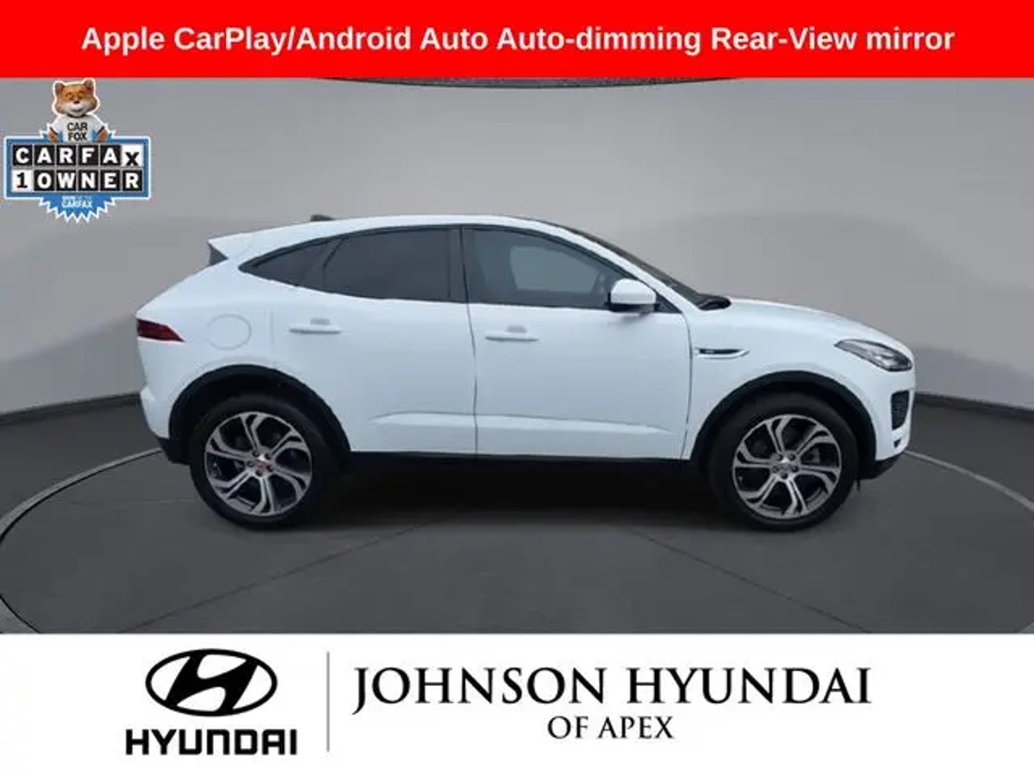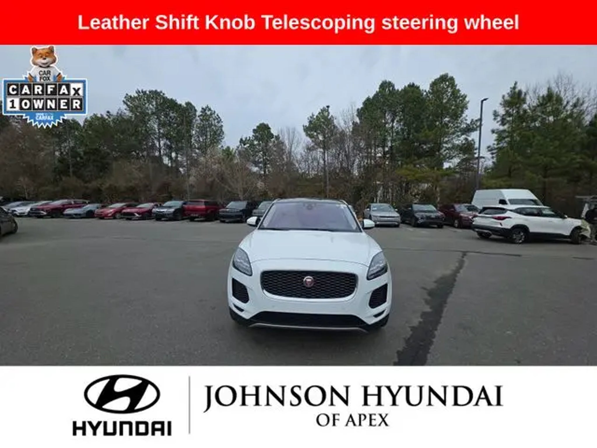 2020 Jaguar E-PACE SE Yulong White Metallic AWD 9-Speed Automatic Odometer is 31503 miles below market average! **CERTIFIED BY CARFAX- NO ACCIDENTS AND ONE OWNER!**, 14-Way Memory Front Seats, Apple CarPlay/Android Auto, Auto-dimming Rear-View mirror, Automatic temperature control, Connect Pro Pack, Exterior Parking Camera Rear, Front dual zone A/C, Fully automatic headlights, Grained Leather Seat Trim, Heated door mirrors, Leather Shift Knob, Leather steering wheel, Memory seat, Navigation Pro, Navigation system: InControl Navigation Pro, Power driver seat, Power Liftgate, Power passenger seat, Radio: Meridian 380W Sound System, Telescoping steering wheel. BENEFITS OF HYUNDAI CERTIFIED PRE-OWNED VEHICLES: Hyundai Certified Pre-Owned (CPO) vehicles come with a manufacturer's warranty, are high quality, and in like-new condition! But not every Hyundai makes the Cut! All Hyundai Certified Pre-Owned vehicles must be five (5) model years or newer, with less than 80,000 miles. They must also pass a comprehensive 173-point quality assurance inspection and have a clean, non-branded title as verified by a CARFAX Vehicle History ReportTM. Every CPO Hyundai provides the Following Additional Value!: *10 Years / 100k Mile Limited Powertrain Warranty! *10 Year Unlimited Mileage Roadside Assistance and Travel Protection with Rental Car at No Charge! *Free Vehicle Carfax Report! *3 Month All Access No Cost Trial of Sirius XM Radio! **That is $2,000 of Additional Value! More than Ever Before!! ***ALL NEW HYUNDAIS COME WITH 3 YEARS / 36,000 MILE COMPLIMENTARY MAINTENANCE!!!*** Price Requires Manufacture Lender Standard Financing *Price plus dealer installed accessories.**Please see dealer for details. Price Requires Manufacture Lender Standard Financing *Price plus dealer installed accessories.**Please see dealer for details.