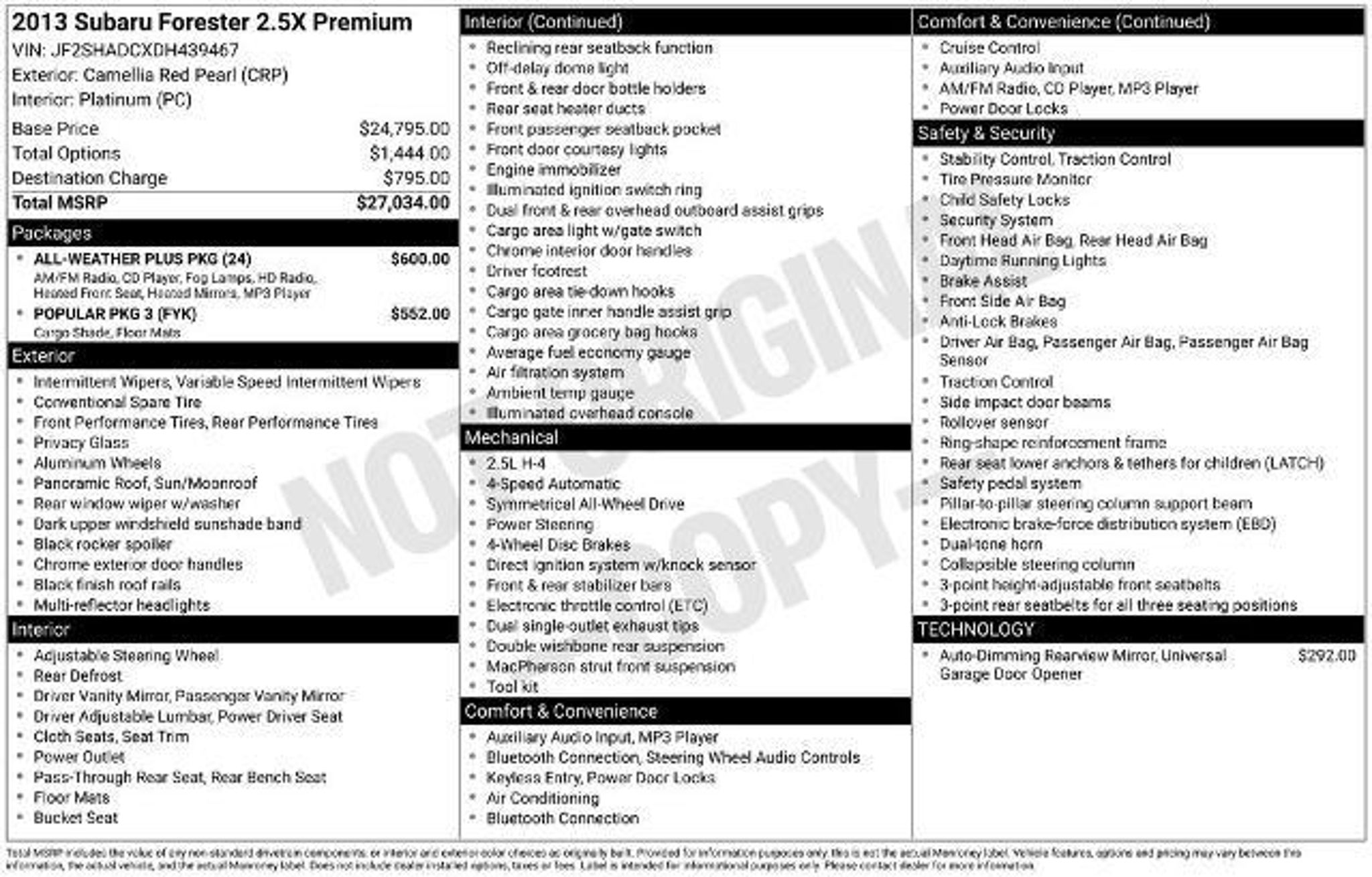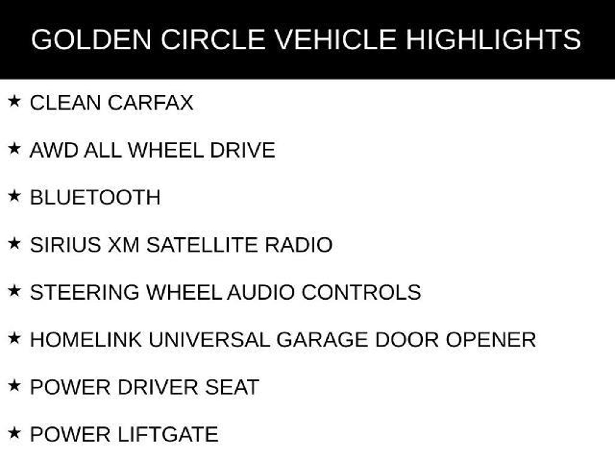 CLEAN CARFAX, AWD ALL WHEEL DRIVE, BLUETOOTH, SIRIUS XM SATELLITE RADIO, STEERING WHEEL AUDIO CONTROLS, HOMELINK UNIVERSAL GARAGE DOOR OPENER, POWER DRIVER SEAT, POWER LIFTGATE, ALL WEATHER FLOOR MATS, 2.5X SERIES, ALL-WEATHER PACKAGE, POPULAR PACKAGE #3, 17 ALUMINUM ALLOY WHEELS, 4 SPEAKERS, AIR CONDITIONING, ANTI-WHIPLASH FRONT HEAD RESTRAINTS, AUTO-DIM MIRROR W/COMPASS ADAPTER, AUTO-DIMMING MIRROR W/COMPASS & HOMELINK, BLACK CARGO TRAY, BRAKE ASSIST, BUMPERS: BODY-COLOR, CD PLAYER, DRIVER VANITY MIRROR, FOG LIGHTS, FOUR WHEEL INDEPENDENT SUSPENSION, FRONT CENTER ARMREST, HEATED EXTERIOR MIRRORS, LOW TIRE PRESSURE WARNING, OCCUPANT SENSING AIRBAG, OUTSIDE TEMPERATURE DISPLAY, OVERHEAD AIRBAG, OVERHEAD CONSOLE, PANIC ALARM, PASSENGER VANITY MIRROR, POWER DOOR MIRRORS, POWER WINDOWS, REAR BUMPER COVER, REAR WINDOW DEFROSTER, REAR WINDOW WIPER, REMOTE KEYLESS ENTRY, ROOF RACK: RAILS ONLY, SECURITY SYSTEM, SPEED CONTROL, SPLASH GUARD KIT, SPLIT FOLDING REAR SEAT, TELESCOPING STEERING WHEEL, TILT STEERING WHEEL, TRACTION CONTROL, VARIABLY INTERMITTENT WIPERS, WINDSHIELD WIPER DE-ICER.