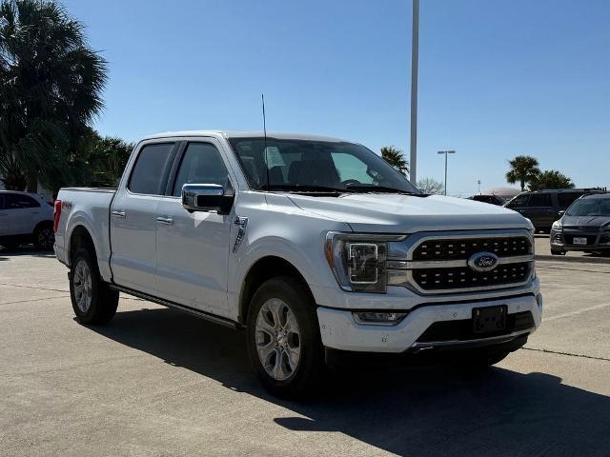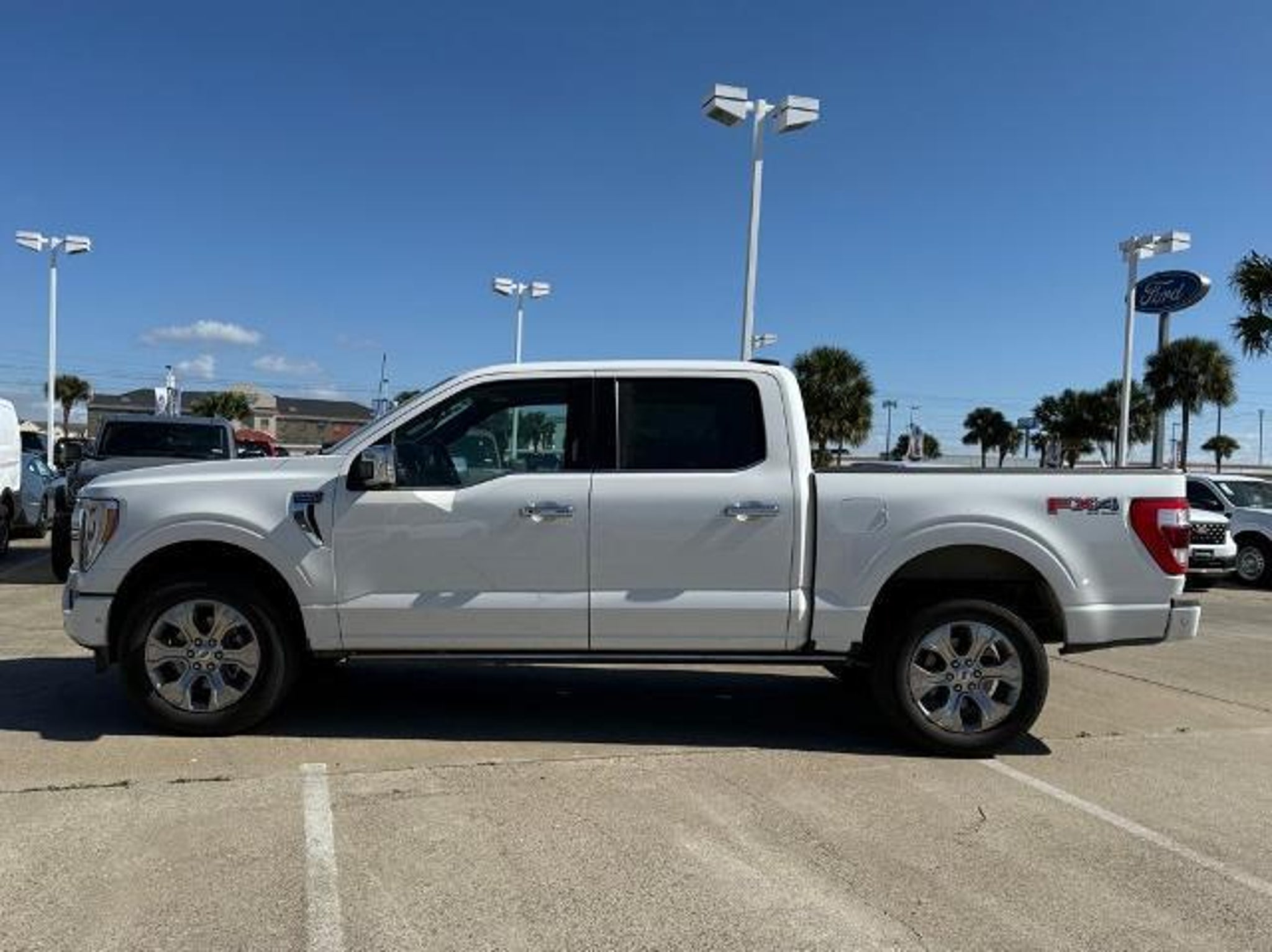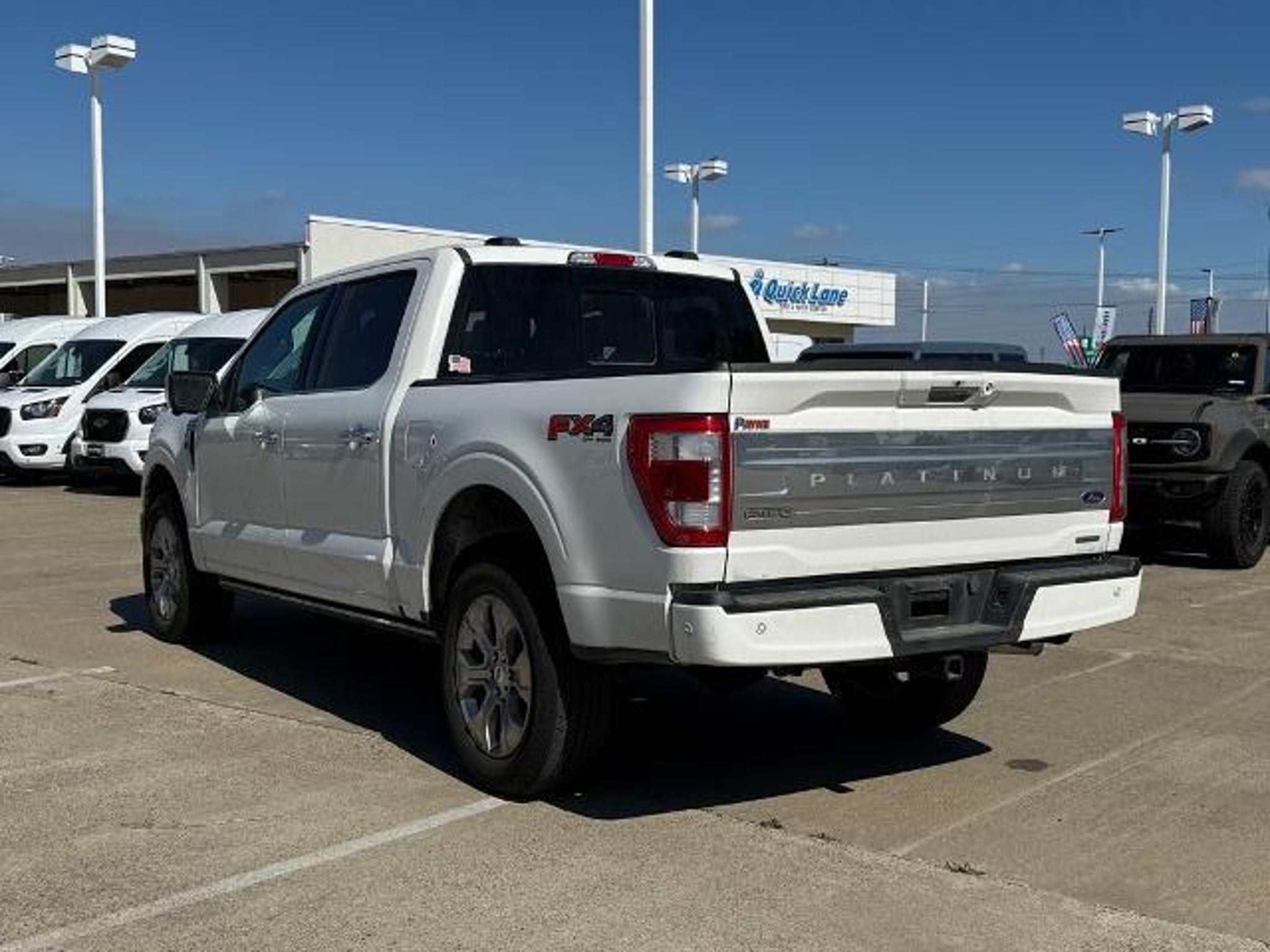 Star White Metallic Tri-Coat 2023 Ford F-150 Platinum 4WD 10-Speed Automatic 3.5L V6 EcoBoost 4WD. This vehicle comes equipped with the following features and options: Bed Utility Package (BoxLink, LED Box Lighting, Power Tailgate, and Tailgate Step w/Tailgate Work Surface), Equipment Group 701A High (360 Degree Camera, Pro Trailer Backup Assist & Pro Trailer Hitch Assist, and Radio: B&O Unleashed Sound System by Bang & Olufsen), Ford BlueCruise 1.0 (Active Park Assist 2.0), FX4 Off-Road Package (4x4 FX4 Off-Road Bodyside Decal, Hill Descent Control, Monotube Rear Shocks, Off-Road Tuned Front Shock Absorbers, Rock Crawl Mode, and Tray Style Floor Liner), Max Trailer Tow Package (Class IV Trailer Hitch Receiver, Extended Range 36 Gallon Fuel Tank, and Integrated Trailer Brake Controller), 4WD, 20 Polished Aluminum Wheels, 4-Wheel Disc Brakes, 8 Speakers, ABS brakes, Active Park Assist 2.0 Removal, Adjustable pedals, Air Conditioning, Alloy wheels, AM/FM radio: SiriusXM with 360L, Auto High-beam Headlights, Auto Start-Stop Removal (DISC), Auto tilt-away steering wheel, Auto-dimming door mirrors, Auto-dimming Rear-View mirror, Automatic temperature control, Brake assist, Bumpers: body-color, Center High-Mounted Stop Lamp CHMSL Camera Removal, Compass, Delay-off headlights, Driver door bin, Driver vanity mirror, Dual front impact airbags, Dual front side impact airbags, Electronic Stability Control, Emergency communication system: SYNC 4 911 Assist, Exterior Parking Camera Rear, Front anti-roll bar, Front Bucket Seats, Front Center Armrest, Front dual zone A/C, Front fog lights, Front reading lights, Front wheel independent suspension, Fully automatic headlights, Garage door transmitter, Heated door mirrors, Heated front seats, Heated rear seats, Heated steering wheel, Illuminated entry, Inclination/Intrusion Sensor Removal, Interior Work Surface, LED Sideview Mirror Spotlights, Low tire pressure warning, Memory seat, Multicontour Seats w/Active Motion Removal, Occupant sensing airbag, Outside temperature display, Overhead airbag, Overhead console, Panic alarm, Passenger door bin, Passenger vanity mirror, Pedal memory, Power door mirrors, Power driver seat, Power passenger seat, Power steering, Power windows, Radio data system, Radio: B&O Sound System by Bang & Olufsen, Rain sensing wipers, Rear reading lights, Rear seat center armrest, Rear step bumper, Rear window defroster, Remote keyless entry, Security system, Speed control, Speed-sensing steering, Split folding rear seat, Steering Wheel Heat Removal (D