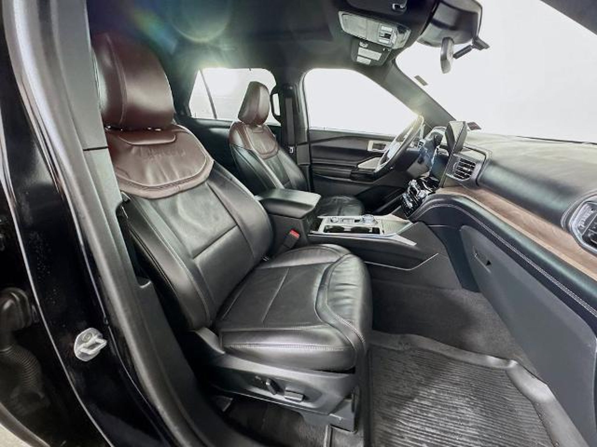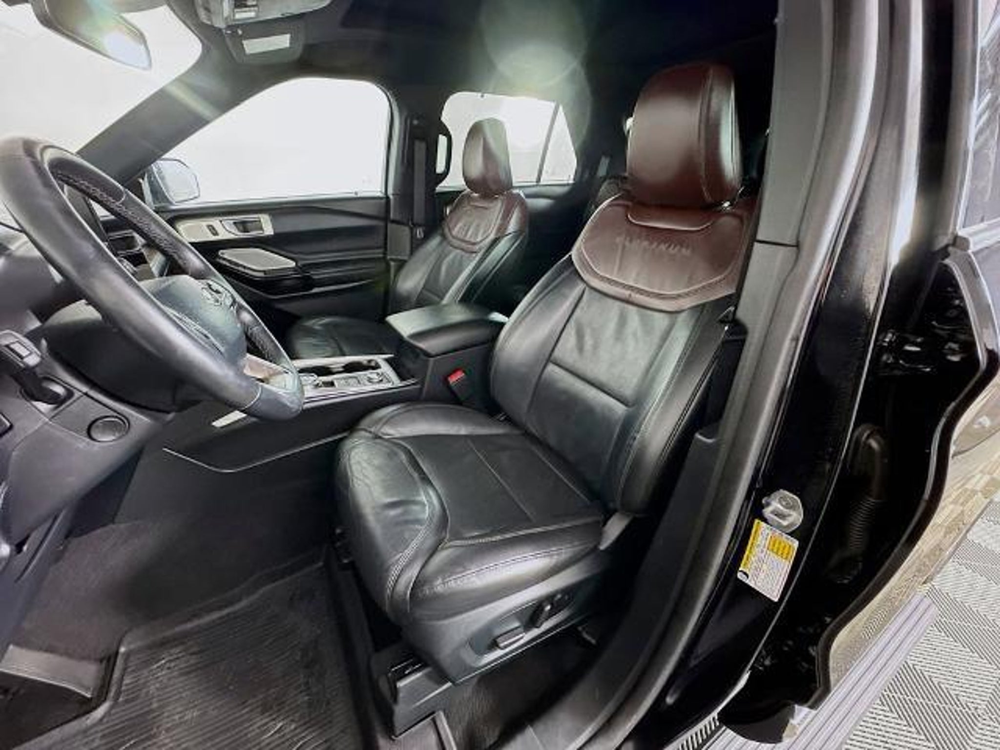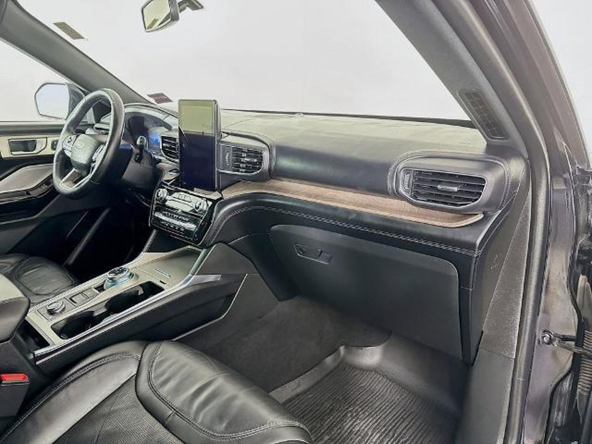 2023 Ford Explorer Platinum 4WD Powerful 3.0L EcoBoost V6 engine with smooth 10-speed automatic transmission and confident 4WD. Top-tier Platinum trim loaded with luxury: ventilated/heated leather seats, heated steering wheel, ambient lighting, 12 digital instrument cluster, 10.1 touchscreen with navigation, B&O premium audio, wireless charging, Ford Co-Pilot360 Assist (adaptive cruise, lane centering, evasive steering), 360-degree camera, remote start, power-folding third row, panoramic roof, and trailer tow package. Stunning in Agate Black Metallic with Ebony leather interior. Premium full-size SUV blending performance, tech, and ultimate comfort!