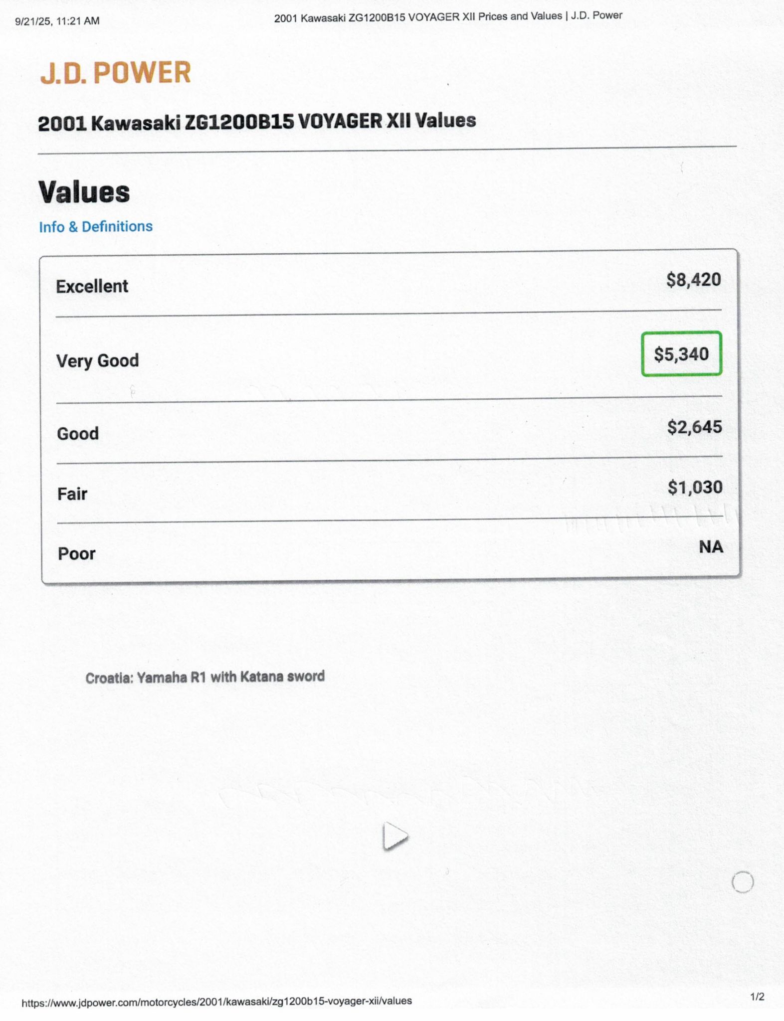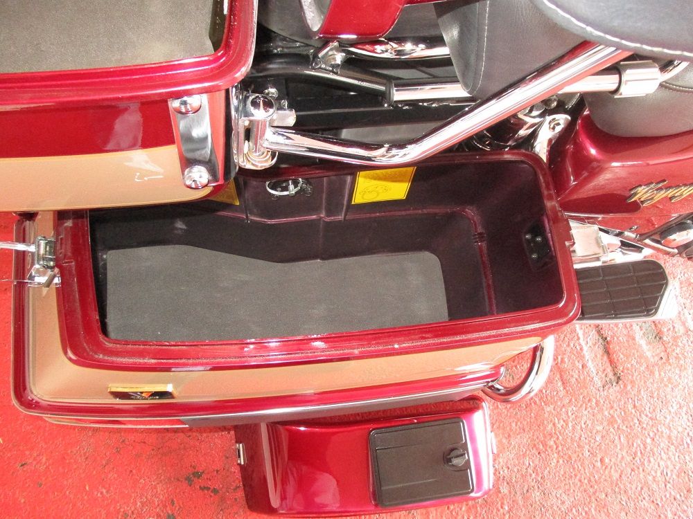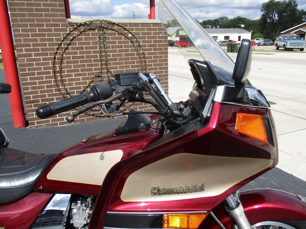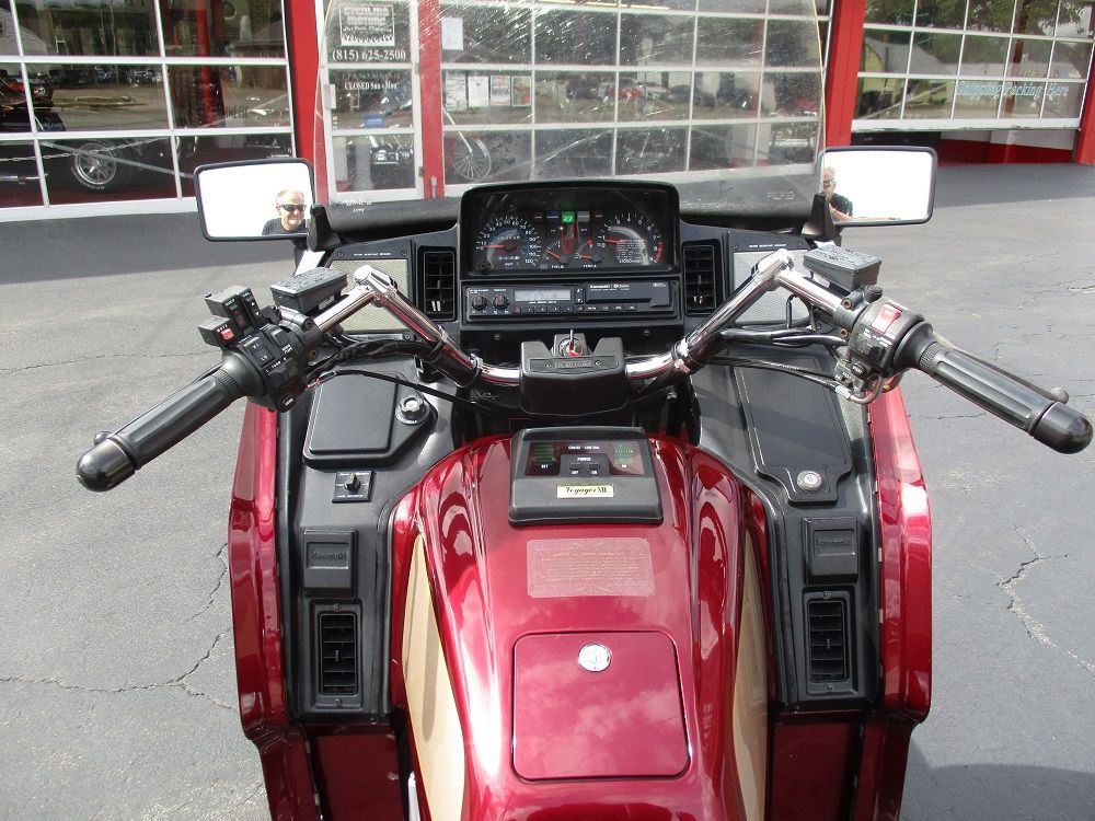 The Kawasaki Voyager debuted in 1986 as a fully dressed touring motorcycle, designed to rival Hondas Gold Wing with long-distance comfort, integrated luggage and advanced electronics. The 2001 Kawasaki Voyager XII (ZG1200) is a full-dress touring motorcycle powered by a 1,196cc liquid-cooled, inline-four engine with DOHC and four valves per cylinder. It uses a 5-speed transmission and shaft drive, has a large fairing, comfortable seating and weighs in with a wet weight of 799 lbs. This particular example was optioned in a gorgeous Vintage Red and Pearl Beige that still looks amazing. It has been nicely upgraded with a driver backrest that has a storage pouch in the rear, driver floor boards, a heel to toe shifter and it sounds amazing ripping through its true dual performance exhaust with dual tips on both sides. It was last serviced less than 1,000 miles ago at which time both tires were replaced. The previous owner was planning to change the brake pads but realized that the owner prior to him had just done it and they had too much life left to remove them. The 3 sets of new pads he was planning to install are included as well as the needed gaskets for the next service, the original toe shifter, a waterproof storage cover, the original color matched saddle bag and trunk liners with Voyager logos and the original owners manual for the bike and Clarion PK-9090V stereo system. The are few scratches here and there and there is some discoloration on the windshield but overall