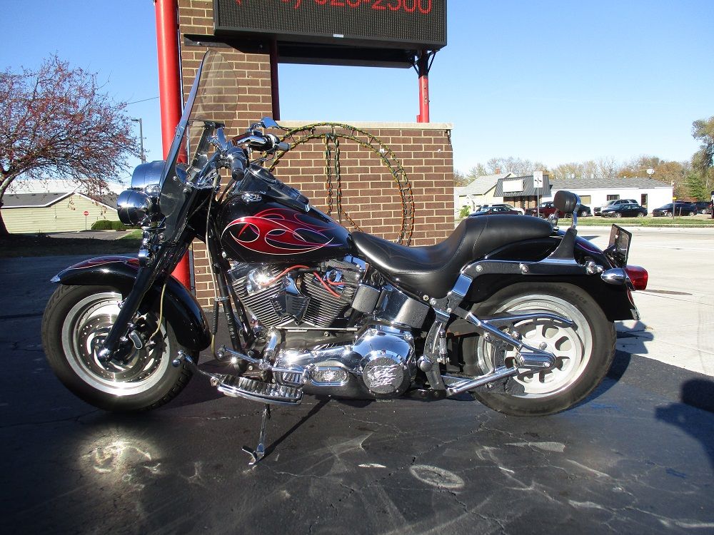 With its fat FL forks, wide 16 tires, broad handlebars and chrome 7 headlight nacelle this softail is anything but skinny. Its distinctive look will get you noticed in a crowd. The 2002 Fat Boy has a 1450cc Twin Cam V-Twin mated to a 5 speed manual transmission. You will also appreciate the driver floor boards, solid disc wheels, FL rear fender and the optional fuel injection which this bike is equipped with. This particular example has also been nicely upgraded with a long list of chrome which includes the rear swing arm, front forks, axle covers, frame inserts, swingarm bolt covers, upper and lower belt guards, shift levers, hand levers, horn cover, switch housing covers and chrome fender tips with gold H-D Eagles. It has a full custom paint job with custom tribal graphics, Daymaker LED headlight and passing lamps, smoked turn signals, a sweet low profile H-D seat with custom stitching, a matching QR passenger backrest, a QR windshield, Carlini beach bars, upgraded floor boards with a matching brake pedal, matching grips and pegs, flamed mirrors as well as flamed covers for the master cylinder, inspection cover and primary cover. To top it off it has a Stage I Hyper Charger and it sounds just plain nasty ripping through its Vance & Hines Short Shot performance exhaust system. Less than 1,000 miles ago it received new tires, brakes and a battery. Within the last 5 miles it was fully serviced and inspected and everything is in perfect working order. We have priced it fairly