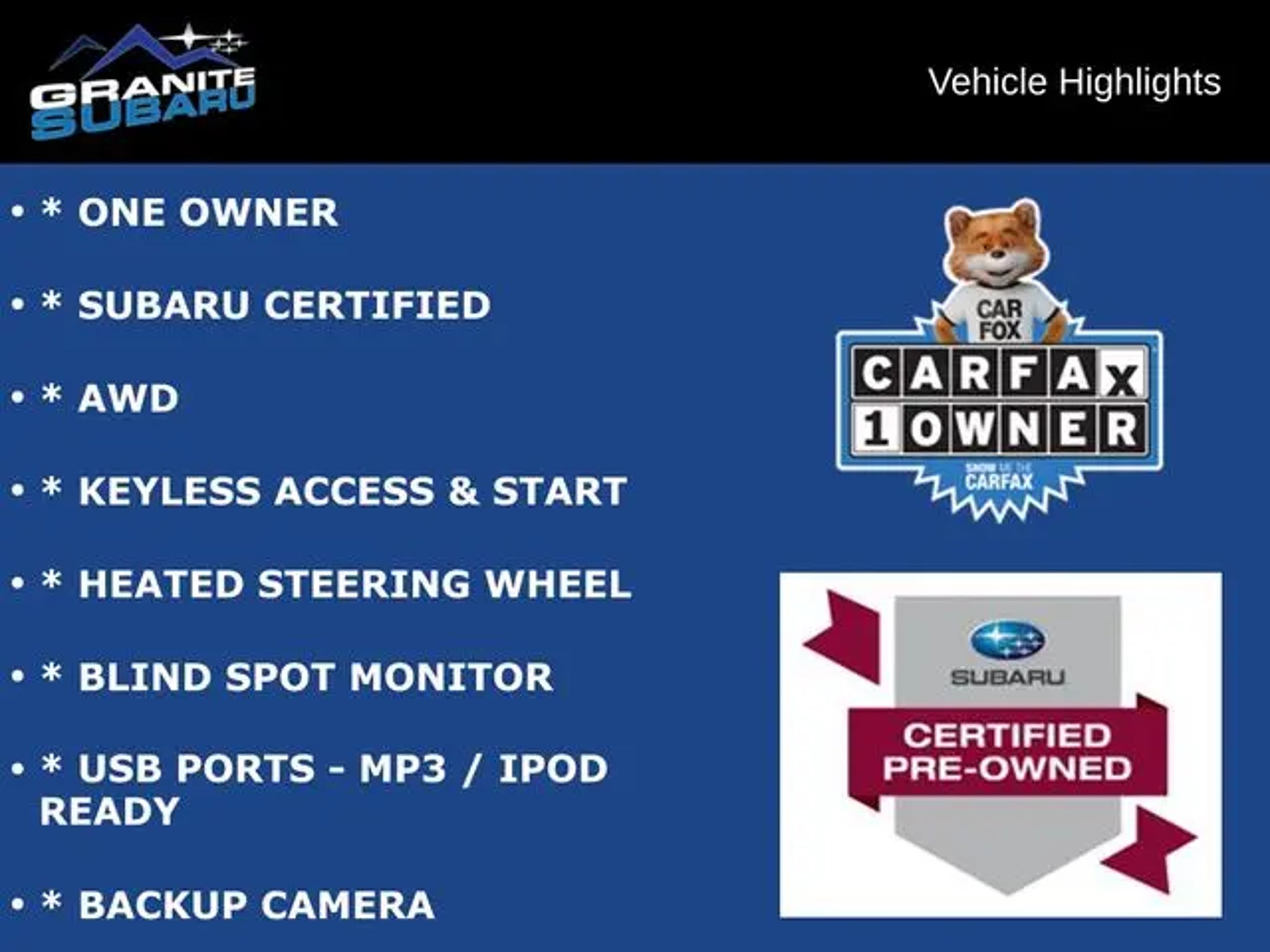 * ONE OWNER, * SUBARU CERTIFIED, * AWD, * KEYLESS ACCESS & START, * HEATED STEERING WHEEL, * BLIND SPOT MONITOR, * USB PORTS - MP3 / IPOD READY, * BACKUP CAMERA, * POWER REAR GATE, * ALLOY WHEELS. At Granite Subaru in Hudson, NH we use real market data from credible 3rd parties like Edmunds so you can get a market proven price and a clear value of what your trade is worth. It's all about transparency, honesty, and integrity so you can purchase with confidence and walk away with a great deal. Our experienced sales staff is eager to share its knowledge and enthusiasm with you. We encourage you to browse our online inventory, schedule a test drive and investigate financing options. You can also request more information about a vehicle using our online form or by calling .