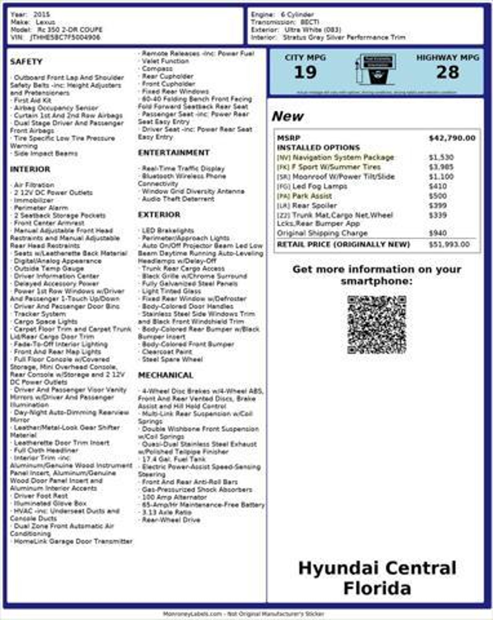 Discover the exhilaration of the 2015 Lexus RC 350 - a sophisticated sports coupe that blends dynamic performance with refined luxury. This stunning white RC 350 is equipped with a powerful 3.5L V6 engine and an 8-speed automatic transmission, delivering an exceptional driving experience with 19 city and 28 highway MPG. - F SPORT W/SUMMER TIRES - NAVIGATION SYSTEM PACKAGE - MOONROOF W/POWER TILT/SLIDE - PARK ASSIST with clearance and back sonar - LED FOG LAMPS The RC 350 F SPORT offers an unparalleled blend of style and substance. Its aggressive yet elegant exterior is complemented by a driver-focused interior with premium NuLuxe seating, a performance-inspired TFT instrument cluster, and a wealth of advanced technologies. Enjoy the thrill of responsive handling, thanks to the F SPORT-tuned suspension and Adaptive Variable Suspension system. The available Navigation System Package elevates your driving experience with a high-resolution 7-inch display, Lexus Enform connectivity, and a comprehensive suite of voice-activated features. Stay connected and entertained with the premium audio system, Bluetooth integration, and smartphone integration. Safety is also a top priority, with the RC 350 offering a comprehensive suite of advanced driver assistance technologies, including a Blind Spot Monitor, Rear Cross-Traffic Alert, and a Backup Camera with dynamic grid lines. This exceptional 2015 Lexus RC 350 F SPORT is a true driver's car, blending exhilarating performance with refined luxury. Experience the thrill for yourself - schedule a test drive today and discover the difference that Lexus craftsmanship can make.