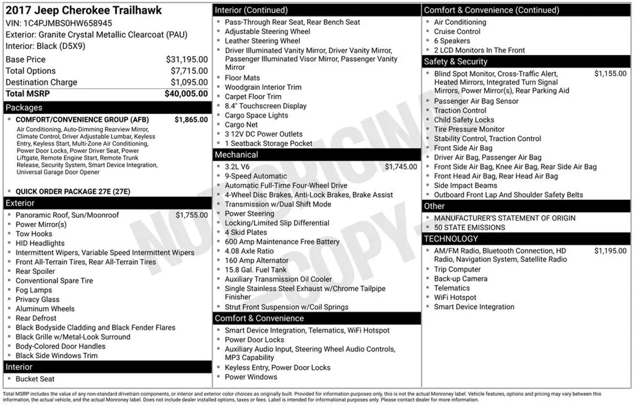 CLEAN CARFAX, 4X4 FOUR WHEEL DRIVE, BLUETOOTH, SIRIUS XM SATELLITE RADIO, UCONNECT, NAVIGATION SYSTEM GPS NAV, STEERING WHEEL AUDIO CONTROLS, TOUCH SCREEN CONTROLS, BACKUP CAMERA, HOMELINK UNIVERSAL GARAGE DOOR OPENER, KEYLESS PUSH BUTTON START, AUTOMATIC HEADLIGHTS, POWER DRIVER SEAT, HEATED FRONT LEATHER SEATS, REMOTE START, POWER LIFTGATE, ALL WEATHER FLOOR MATS, TRAILHAWK SERIES, QUICK ORDER PACKAGE 27E, SAFETEC, 17 ALUMINUM WHEELS, 6 SPEAKERS, 8.4 TOUCHSCREEN DISPLAY, AIR CONDITIONING, ANTI-WHIPLASH FRONT HEAD RESTRAINTS, AUXILIARY TRANSMISSION OIL COOLER, BI-XENON HID HEADLAMPS (DISC), BLIND SPOT & CROSS PATH DETECTION, BRAKE ASSIST, COMPASS, DELAY-OFF HEADLIGHTS, DRIVER VANITY MIRROR, EMERGENCY COMMUNICATION SYSTEM: UCONNECT ACCESS, EXTERIOR MIRRORS W/HEATING ELEMENT, FOUR WHEEL INDEPENDENT SUSPENSION, FRONT FOG LIGHTS, INTEGRATED VOICE COMMAND W/BLUETOOTH, LOW TIRE PRESSURE WARNING, OCCUPANT SENSING AIRBAG, OUTSIDE TEMPERATURE DISPLAY, OVERHEAD CONSOLE, PANIC ALARM, PASSENGER VANITY MIRROR, POWER MULTI-FUNCTION FOLD AWAY MIRRORS, POWER WINDOWS, REAR WINDOW WIPER, REMOTE KEYLESS ENTRY, SPEED CONTROL, SPEED-SENSING STEERING, TELESCOPING STEERING WHEEL, TILT STEERING WHEEL, VARIABLY INTERMITTENT WIPERS.