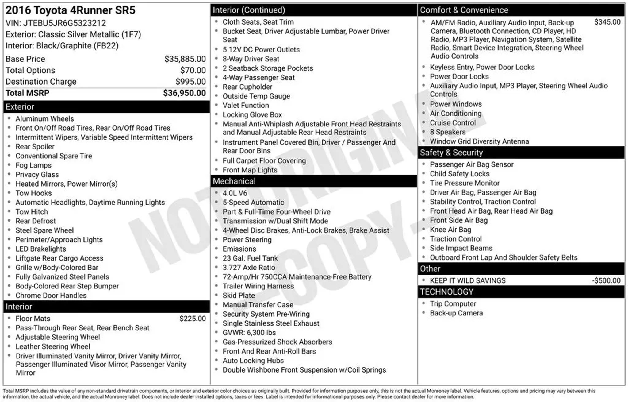 Bell Ford has been proudly serving Phoenix, Arizona for 40 years. Conveniently located on the southeast corner of the i17 and Bell Road. Visit us online today at www.bellford.com This 2016 Toyota 4Runner SR5 is a rugged and capable SUV that's ready to take you on all your adventures. Equipped with a powerful 4.0L V6 engine, 4-wheel drive, and a 5-speed automatic transmission, this 4Runner delivers impressive performance both on and off the road. - RADIO: ENTUNE PREMIUM AUDIO WITH NAVIGATION - CARPET FLOOR MATS & CARPET CARGO MAT The 4Runner's spacious interior offers seating for up to five, with a split-folding rear seat that provides ample cargo space. Enjoy the convenience of the Entune Premium Audio system with navigation, which includes a 6.1-inch touchscreen display, Bluetooth connectivity, and a suite of popular apps. With its bold, muscular styling and impressive off-road capabilities, the 4Runner SR5 is the perfect companion for your active lifestyle. The rugged four-wheel-drive system and high ground clearance make it easy to tackle challenging terrain, while the responsive handling and comfortable ride ensure a smooth journey no matter where the road takes you. Boasting a city fuel economy of 17 mpg and a highway rating of 21 mpg, this 4Runner delivers a great balance of power and efficiency. And with its low mileage of just 116,851 miles, this well-maintained SUV still has plenty of life left to offer. Whether you're planning a family adventure, a weekend getaway, or just need a reliable daily driver, the 2016 Toyota 4Runner SR5 is an exceptional choice. Visit us at Bell Ford today to take this impressive SUV for a test drive and experience its capabilities for yourself. For any other questions, please contact us at 602.281.4080