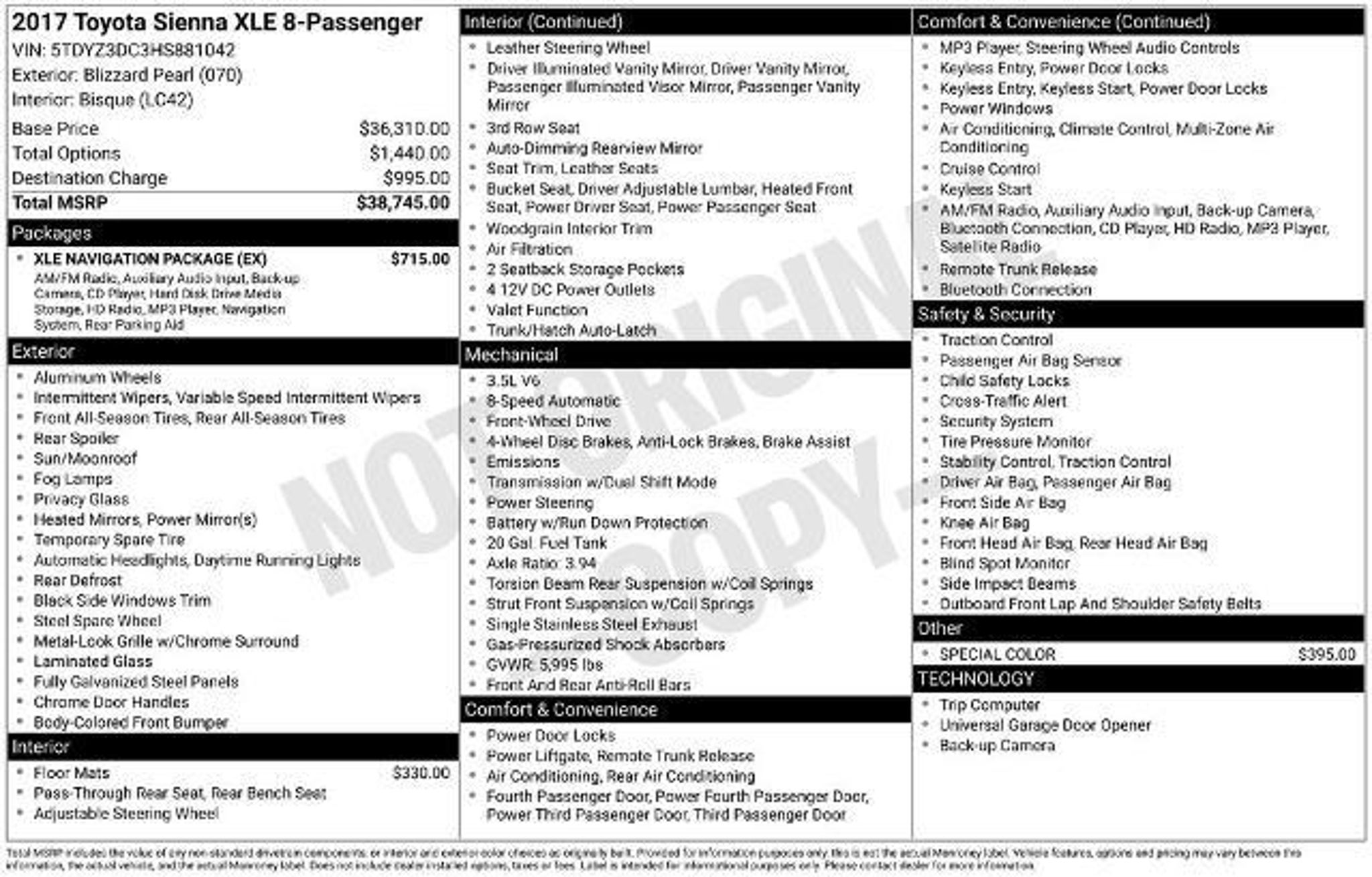 2017 Toyota Sienna XLE 8 Passenger Clean Title Family Ready If you're looking for a dependable, comfortable, and family-friendly van, this 2017 Toyota Sienna XLE 8-Passenger is hard to beat. Known for Toyotas legendary reliability and practicality, the Sienna is one of the most sought-after minivans on the roadand this one comes with a clean title, giving you extra peace of mind when buying. The XLE trim adds a premium touch with leather seating, power sliding doors, and plenty of comfort features that make road trips, carpools, and daily driving easy. With seating for up to eight passengers, theres room for the whole family, friends, and gear without feeling cramped. Inside youll find a spacious and well-thought-out cabin with leather-trimmed seating, tri-zone climate control, power-adjustable front seats, and a power liftgate for easy loading. The power sliding doors make getting kids or passengers in and out effortless, especially in tight parking lots. Toyota built the Sienna to handle real lifewhether its school runs, long road trips, or weekend adventures. The smooth ride, strong V6 engine, and excellent reliability record make it one of the most practical vehicles you can buy. Highlights: Clean Title XLE Premium Trim 8 Passenger Seating Leather Interior Power Sliding Doors Power Liftgate Tri-Zone Climate Control Backup Camera All the reliability Toyota is known for If youve been searching for a clean, well-equipped Sienna thats ready for its next family, this one is absolutely worth a look. Come see it today at Sky Ford before its goneSiennas in this condition dont stick around long. 19/27 City/Highway MPG Awards: * 2017 KBB.com 12 Best Family Cars * 2017 KBB.com Best Resale Value Awards * 2017 KBB.com 10 Most Awarded Brands Reviews: * Refined ride quality gives it a confident feel from the driver seat; high-quality materials and trim throughout the cabin; wide range of adjustments for the second-row seats; no other minivan offers the option of all-wheel drive. Source: Edmunds