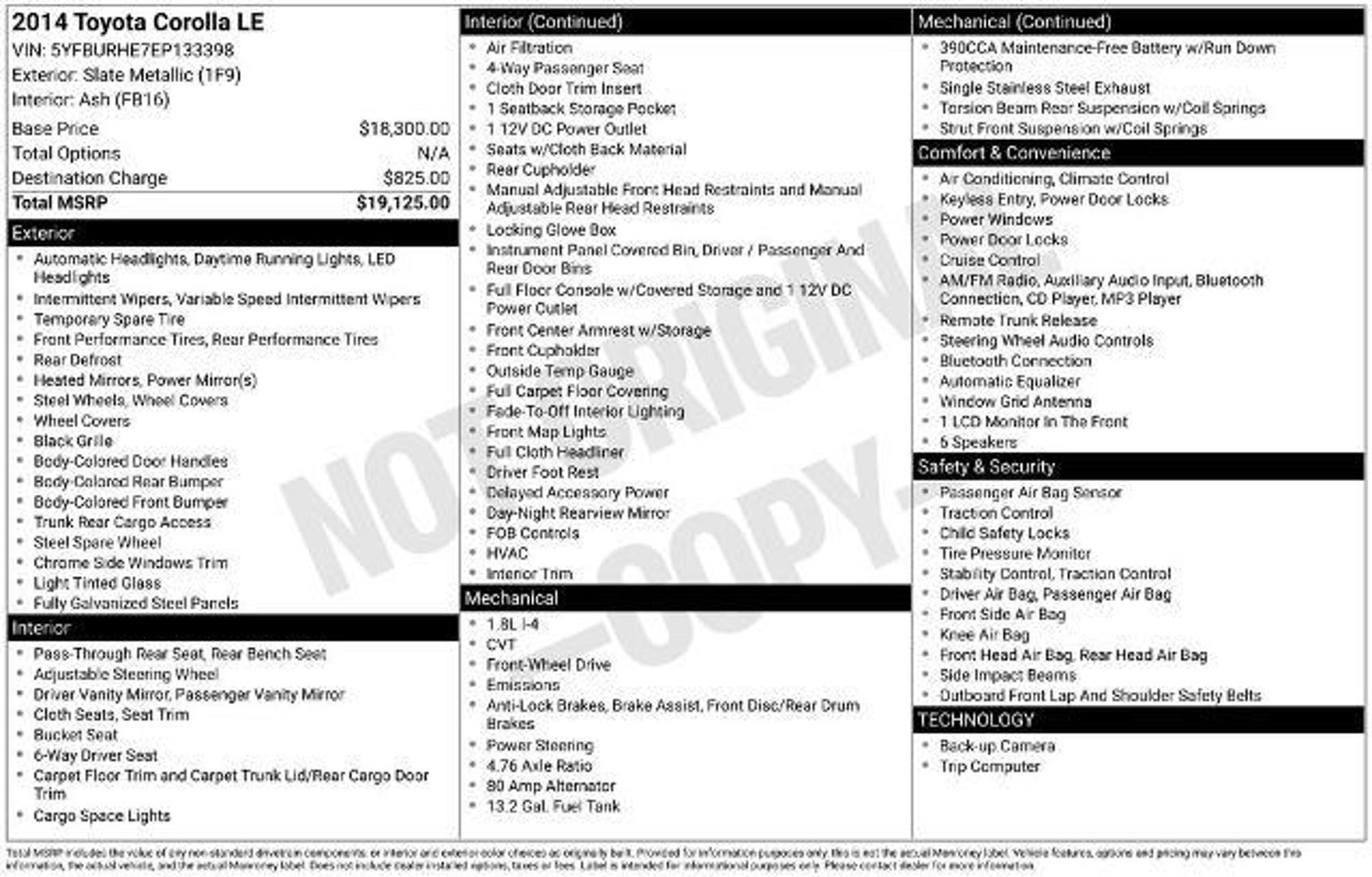 2014 Toyota Corolla LE Sale Price Includes $1,000 Finance Savings. Contact Dealer For Details. 29/38 City/Highway MPG Awards: * 2014 KBB.com 10 Tech-Savviest Cars Under $20,000 * 2014 KBB.com 5-Year Cost to Own Awards * 2014 KBB.com Best Resale Value Awards