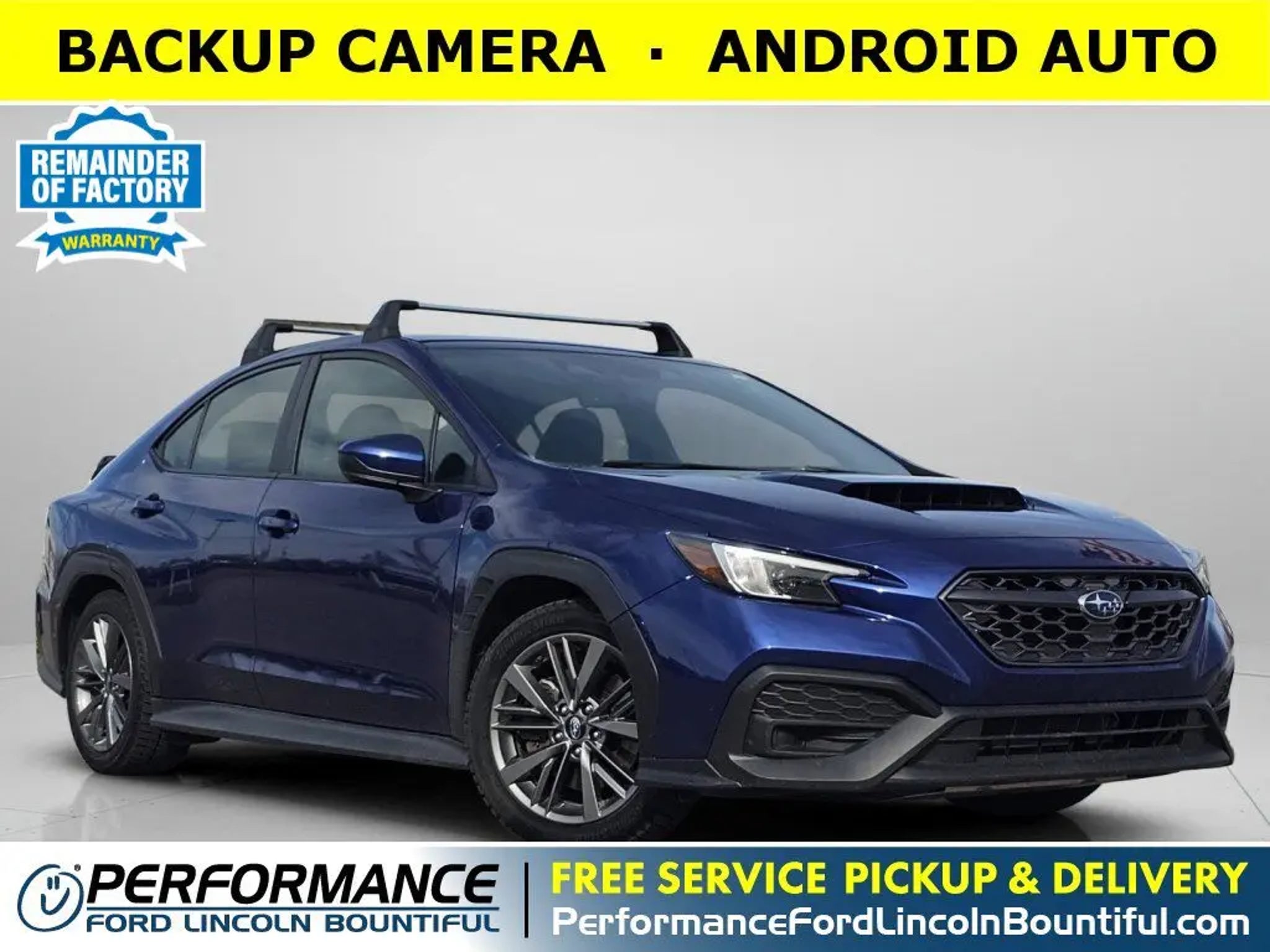 This *2024 Subaru WRX Base* is loaded with convenient features like ALLOY-WHEELS, BACKUP CAMERA, ANDROID AUTO, APPLE CARPLAY, Remote Entry.This stunning *2024 Subaru WRX Base* features a beautiful *Blue* exterior and a *Black* interior.Compare, adjust and save your payment options on every vehicle in stock at: PerformanceFordBountiful.comAutomatic Climate Control, Leather Wrapped Steering Wheel, Compass, Cloth Seats, Air Conditioning, Telescoping Wheel, Bucket Front Seats, Steering Wheel Audio Controls, Illuminated entry, Auto Dimming R/V Mirror, Center Console Storage, Multi-zone Climate Control, Overhead Console, Floor Mats, Trip Odometer, Reading Lights, Vanity Mirrors, Tilt Steering Wheel, Split Folding Rear Seat, Outside Temperature Gauge, Rear Window Defroster, Center Armrest.*Safety and Economy Features Include:* Back-Up Camera, Electronic Stability Control, Security System, Aftermarket Anti Theft System, Brake Assist, Speed Sensitive Power Steering, Auto Highbeams, ABS Brakes, Knee AirBag, Dual Air Bags, Tire Pressure Monitoring System, Overhead airbag, Passenger Air Bag Sensor, Low tire pressure warning, Driver Front Side Impact Air Bag.This vehicle has an EPA rated fuel economy of 26.0 highway / 19.0 city1.Performance Ford Lincoln Bountiful proudly offer our customers at-home services including *Performance Valet*! When you purchase from Performance Ford Lincoln Bountiful, you will be eligible for *FREE Pickup & Delivery*^ for your future service appointments! We value your time and that's why want to give you the best buying and service experiences in Bountiful! Also, ask your product specialist about our home test drives and deliveries. Save time and money through our exclusive Performance Remote Services! Distance limitations may apply.Our dealership is conveniently located off Exit 315 on I-15, North of Salt Lake City. We proudly serve the communities of Bountiful, Centerville, North Salt Lake, Farmington, Salt Lake City, Kaysville, South Salt Lake, Layton, Canyon Rim, Millcreek, West Valley City, Murray, Holladay, Taylorsville, and Syracuse. As a proud member of the family-owned Performance Automotive Network, we have access to thousands of new and used vehicles. This gives us the ability to find the perfect vehicle to fit your needs and budget.*Need financing assistance?* Our strong, group-wide relationships with several lending institutions allow us to offer the most competitive rates! We will give you top-dollar for your trade or make you a cash offer if you'd prefer the convenience of selling directly.With our aggressive pricing strategy, most vehicles sell within the first few weeks, so please contact us ahead of time at * * to ensure the vehicle is still available and ready for your test drive.*We'll Put A Smile On Your Face! *1Based on EPA mileage ratings. Use for comparison purposes only. Your mileage will vary depending on driving conditions, how you drive and maintain your vehicle, etc.*Terms and conditions of warranties vary by brand and vehicle. See dealer for complete details or sign in to download a copy of your vehicle's warranty. Warranty may be restricted or denied if your vehicle or part has been modified, improperly maintained or removed.Delivery to door for Test Drive.