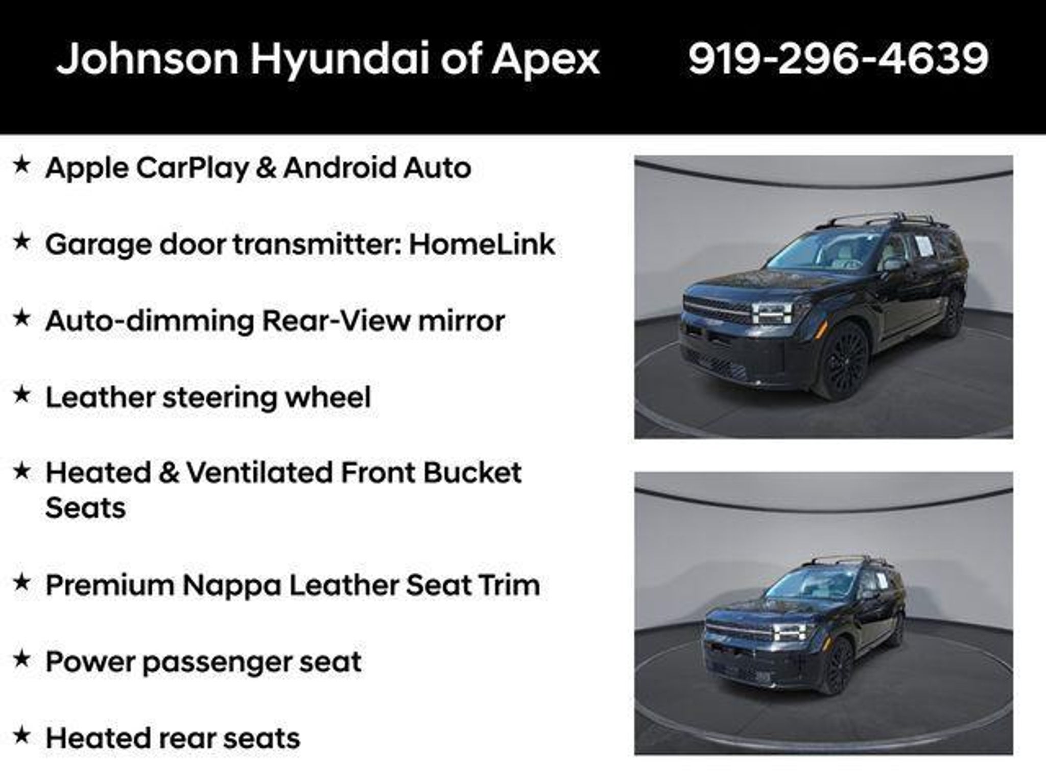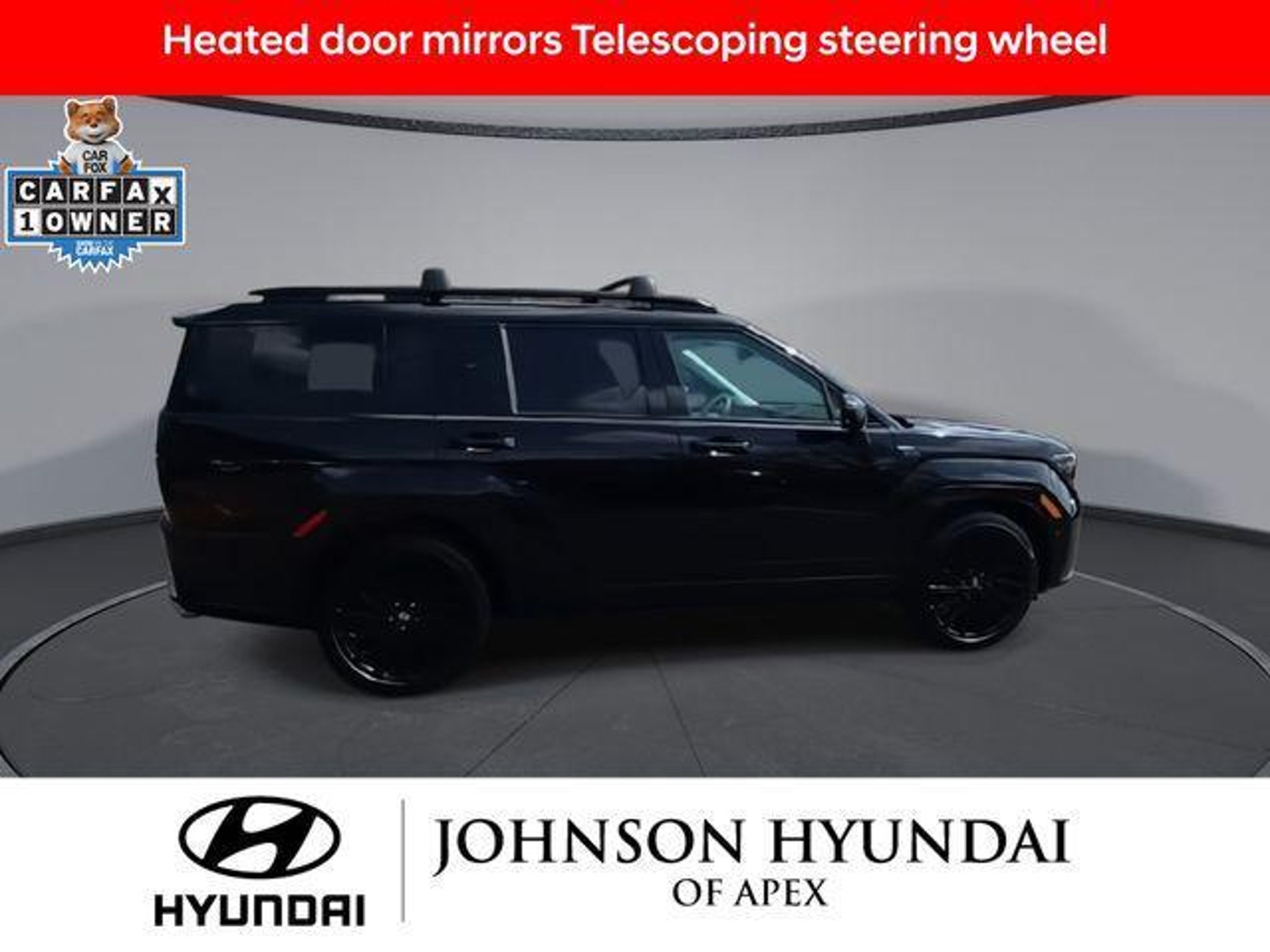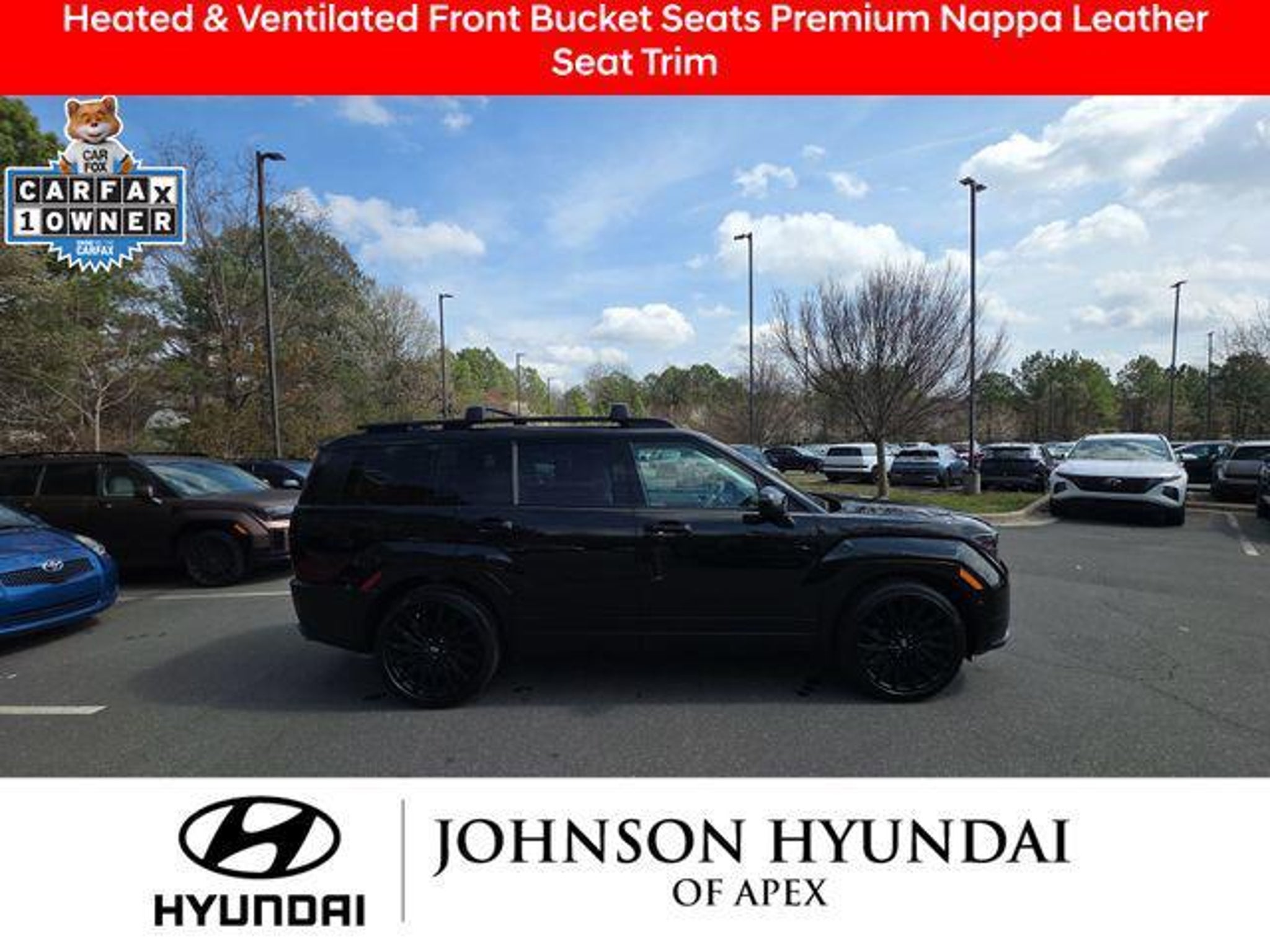 2025 Hyundai Santa Fe Calligraphy Phantom Black AWD Shiftronic Recent Arrival! Certified. **CERTIFIED BY CARFAX- NO ACCIDENTS AND ONE OWNER!**, Apple CarPlay & Android Auto, Auto-dimming Rear-View mirror, Automatic temperature control, Exterior Parking Camera Rear, Front dual zone A/C, Fully automatic headlights, Garage door transmitter: HomeLink, Heads-Up Display, Heated & Ventilated Front Bucket Seats, Heated door mirrors, Heated rear seats, Heated steering wheel, Illuminated entry, Leather steering wheel, Memory seat, Navigation System, Option Group 01, Power Liftgate, Power moonroof, Power passenger seat, Premium Nappa Leather Seat Trim, Radio: AM/FM/HD Bose Premium Audio System, Telescoping steering wheel, Wheels: 21 x 8.5J Unique Dark Finish Alloy. Hyundai Certified Used Vehicles Details: * 173 Point Inspection * Limited Warranty: 60 Month/60,000 Mile (whichever comes first) from original in-service date * Warranty Deductible: $50 * Roadside Assistance * Includes 10-year/Unlimited Mileage Roadside Assistance with Rental Car and Trip Interruption Reimbursement; Please See Dealers for Specific Vehicle Eligibility Requirements. 10-Year/100,000 Mile Hybrid/EV Battery Warranty. 3-Months SiriusXM Trial Subscription. Complimentary 1 Year (Connected Care & Remote Pkgs). * Vehicle History * Powertrain Limited Warranty: 120 Month/100,000 Mile (whichever comes first) from original in-service date BENEFITS OF HYUNDAI CERTIFIED PRE-OWNED VEHICLES: Hyundai Certified Pre-Owned (CPO) vehicles come with a manufacturer's warranty, are high quality, and in like-new condition! But not every Hyundai makes the Cut! All Hyundai Certified Pre-Owned vehicles must be five (5) model years or newer, with less than 80,000 miles. They must also pass a comprehensive 173-point quality assurance inspection and have a clean, non-branded title as verified by a CARFAX Vehicle History ReportTM. Every CPO Hyundai provides the Following Additional Value!: *10 Years / 100k Mile Limited Powertrain Warranty! *10 Year Unlimited Mileage Roadside Assistance and Travel Protection with Rental Car at No Charge! *Free Vehicle Carfax Report! *3 Month All Access No Cost Trial of Sirius XM Radio! **That is $2,000 of Additional Value! More than Ever Before!! ***ALL NEW HYUNDAIS COME WITH 3 YEARS / 36,000 MILE COMPLIMENTARY MAINTENANCE!!!*** Price Requires Manufacture Lender Standard Financing *Price plus dealer installed accessories.**Please see dealer for details. Price Requires Manufacture Lender Standard Financing *Price plus dealer installed accessories.**Please see dealer for details.