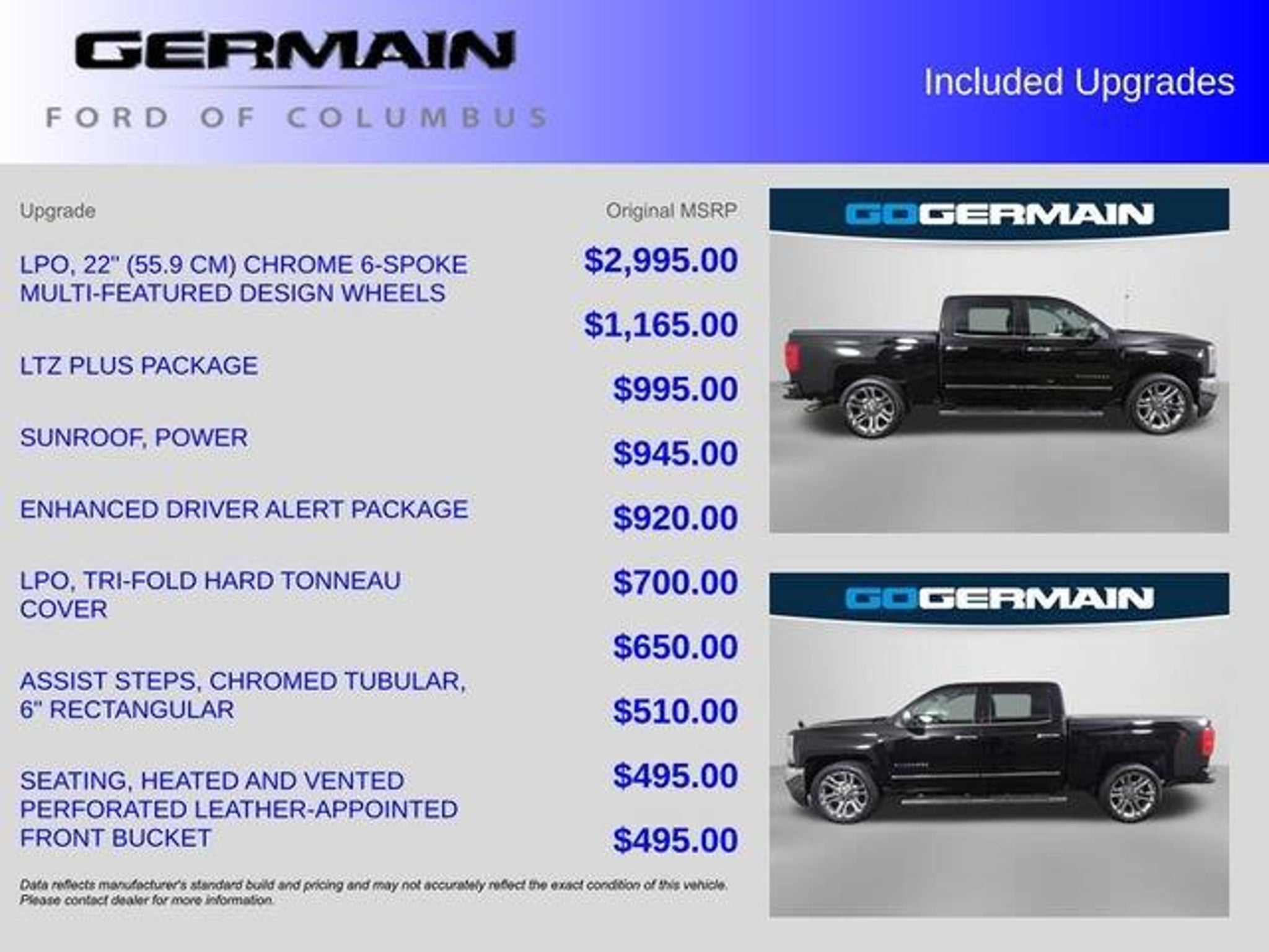 Clean CARFAX. Black LTZ RWD 6-Speed Automatic Electronic with Overdrive EcoTec3 5.3L V8WE HAVE INCLUDED 30 PHOTO'S OF OUR VEHICLES. PLEASE VISIT WWW.GERMAINFORD.COM. Recent Arrival!What is Live Market Pricing? Simple. Live Market Pricing provides the most competitive prices on all our pre-owned vehicles, all the time. Pre-owned Live Market Pricing is achieved by polling over 40,000 pre-owned websites every hour to ensure that every single customer receives real-time Value Pricing on every single Pre-Owned Vehicle we sell. We don't play the pricing games. See for yourself how we measure up to the competitors by. 2016 Chevrolet Silverado 1500 LTZ 1LZ