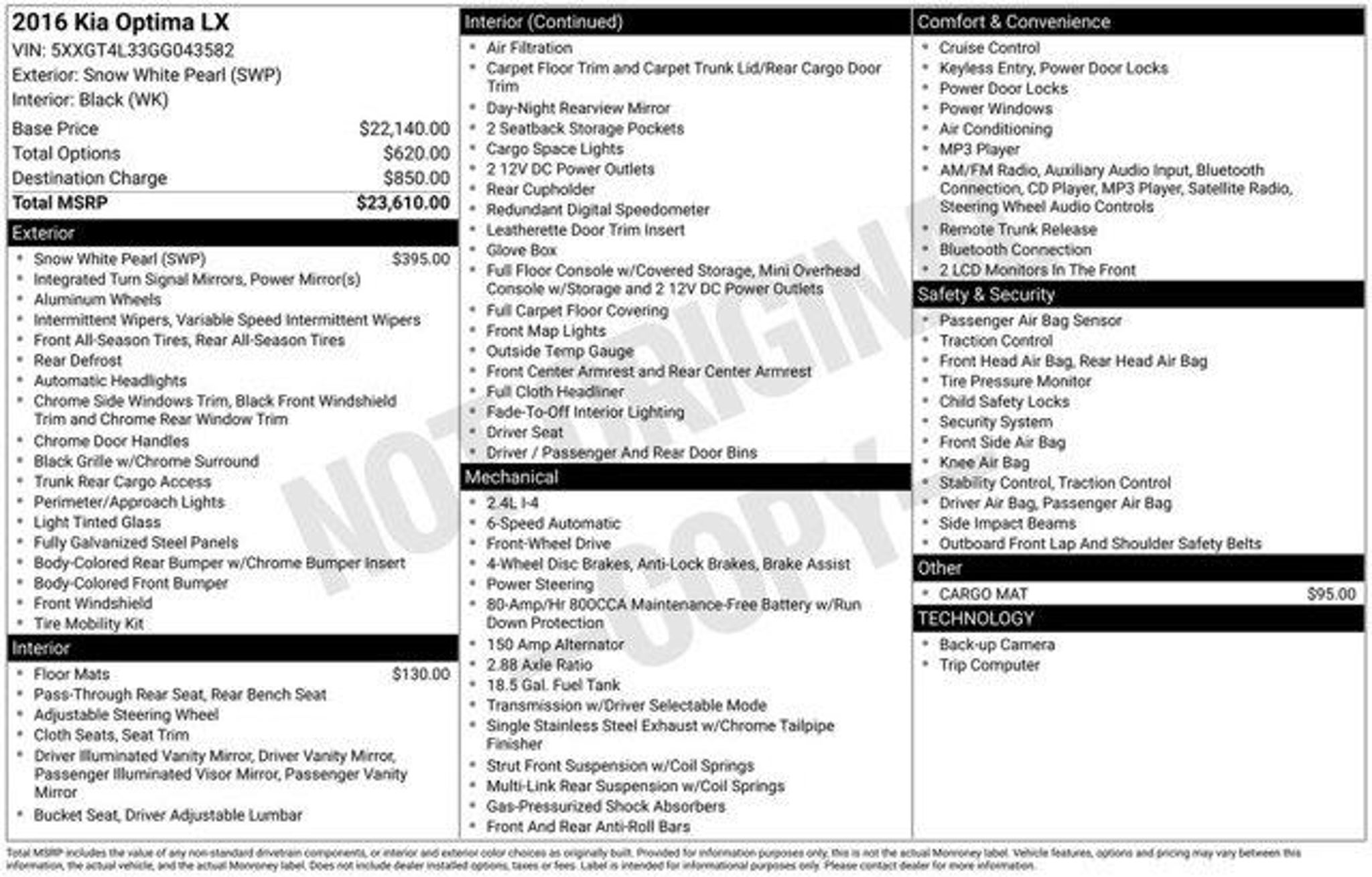 Discover the exceptional value and versatility of this 2016 Kia Optima LX. With its sleek exterior, efficient performance, and impressive array of features, this sedan is poised to elevate your driving experience.- Snow White Pearl exterior- Carpeted floor mats- Cargo matMeticulously maintained and boasting a clean vehicle history, this Optima LX is the perfect blend of style, technology, and practicality. Equipped with a 2.4L I4 DGI DOHC engine and a 6-Speed Automatic with Sportmatic transmission, it delivers an exceptional balance of power and efficiency, achieving an impressive 24 MPG in the city and 35 MPG on the highway.Step inside and be greeted by a well-appointed interior, featuring 6 speakers, SiriusXM radio, and a CD player to keep you entertained on the road. Stay comfortable with the air conditioning and rear window defroster, while the power windows and remote keyless entry add to the convenience. The steering wheel-mounted audio controls and tilt/telescoping steering wheel allow you to customize your driving experience.Safety is a top priority, with features like dual front impact airbags, dual front side impact airbags, a knee airbag, and an overhead airbag providing comprehensive protection. The 4-wheel disc brakes with ABS, traction control, and electronic stability control ensure confident handling, while the rear camera and low tire pressure warning keep you aware of your surroundings.Designed with your needs in mind, the Optima LX offers ample cargo space and a split-folding rear seat, making it easy to accommodate your gear and passengers. The 16-inch alloy wheels and variably intermittent wipers add a touch of style and practicality to this well-rounded sedan.Experience the exceptional value and versatility of this 2016 Kia Optima LX. Schedule a test drive today and discover how this sedan can enhance your driving experience.