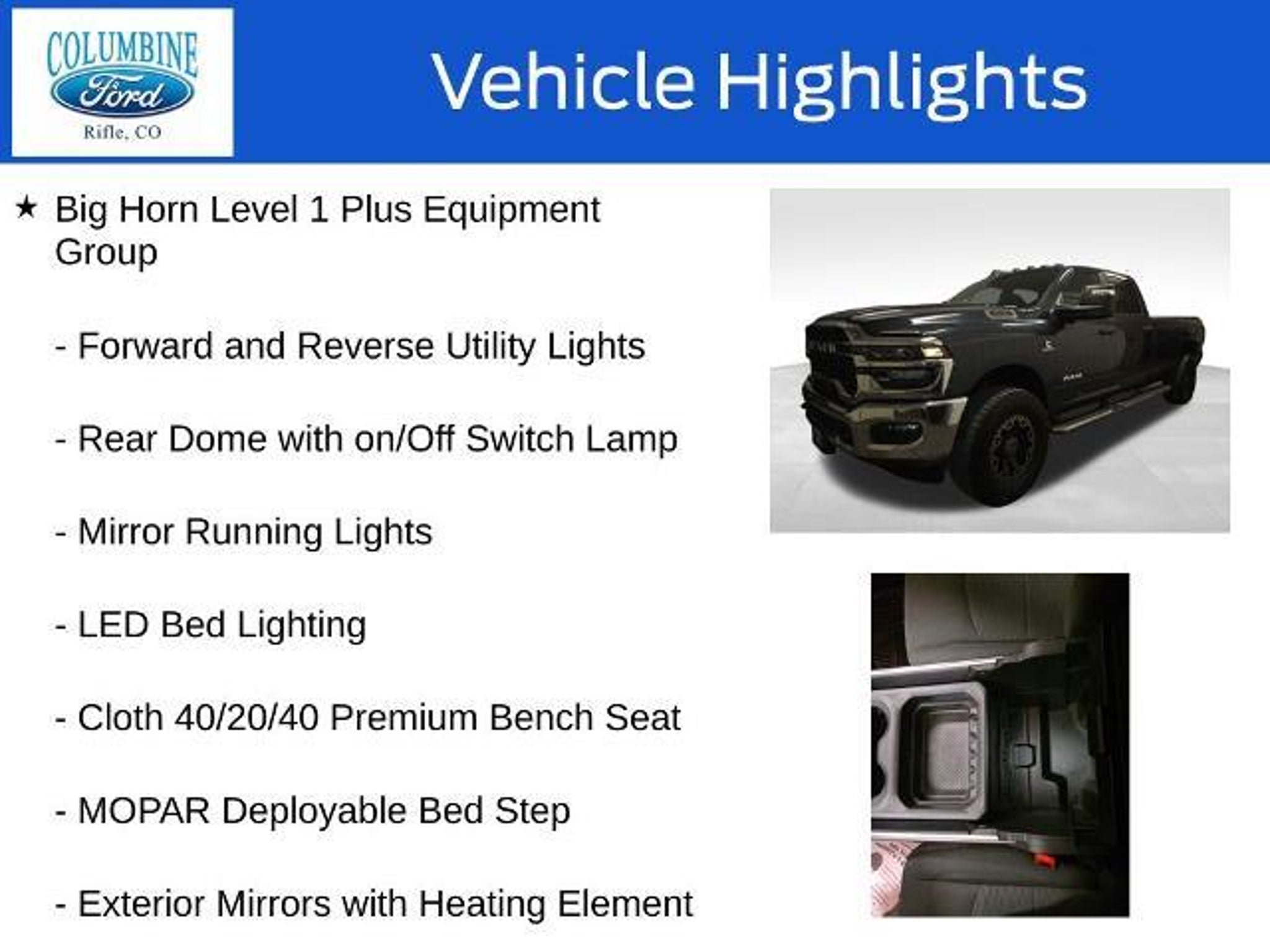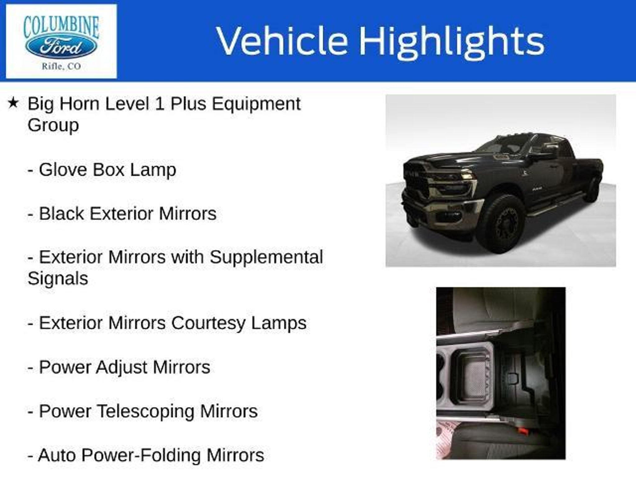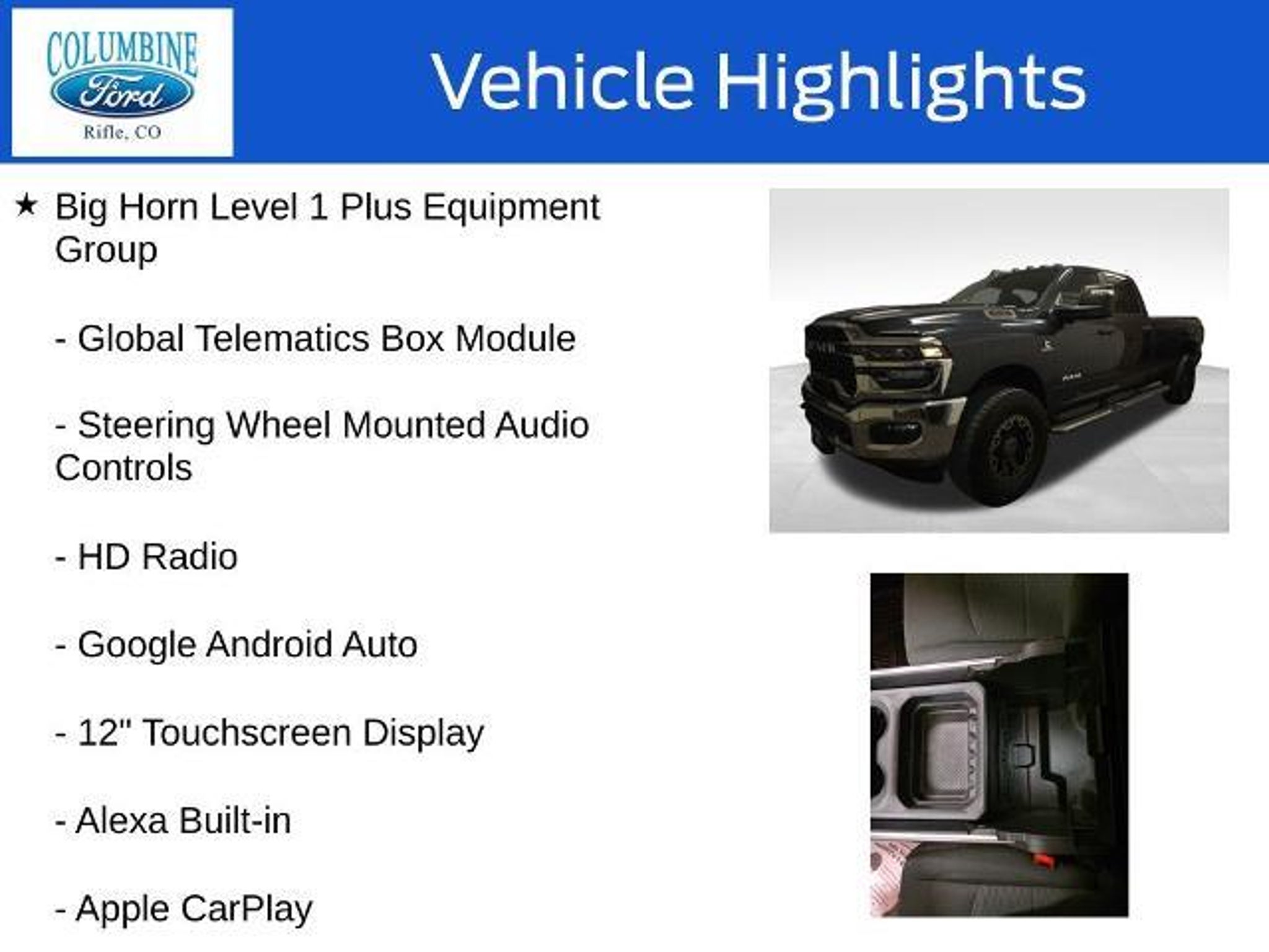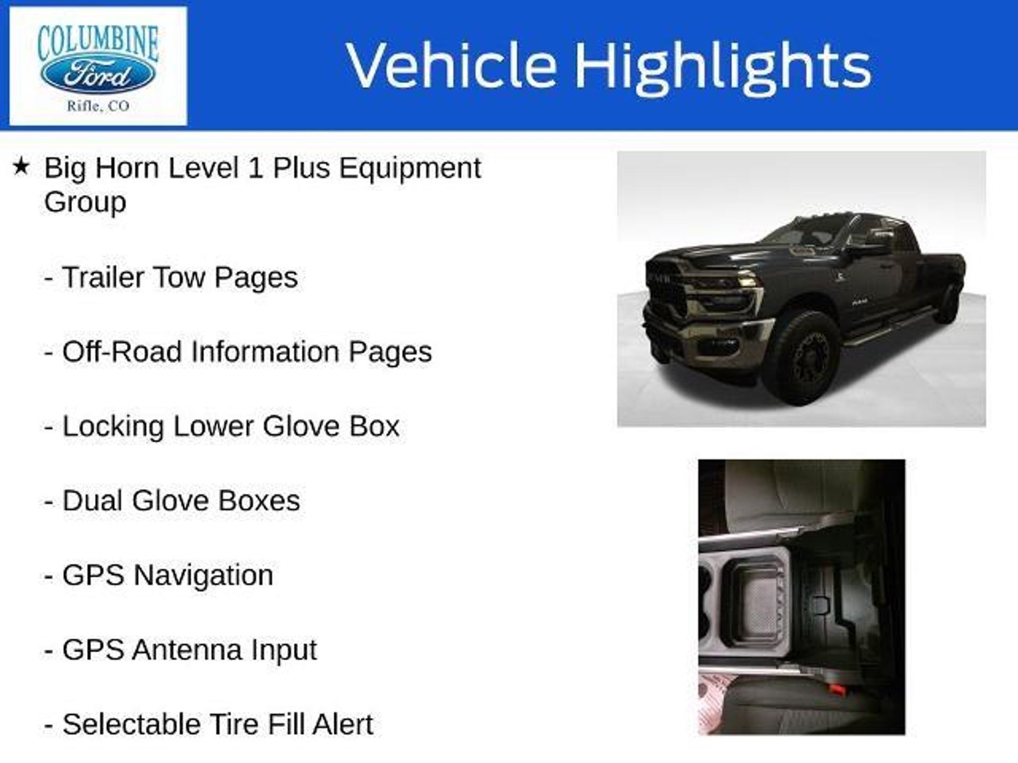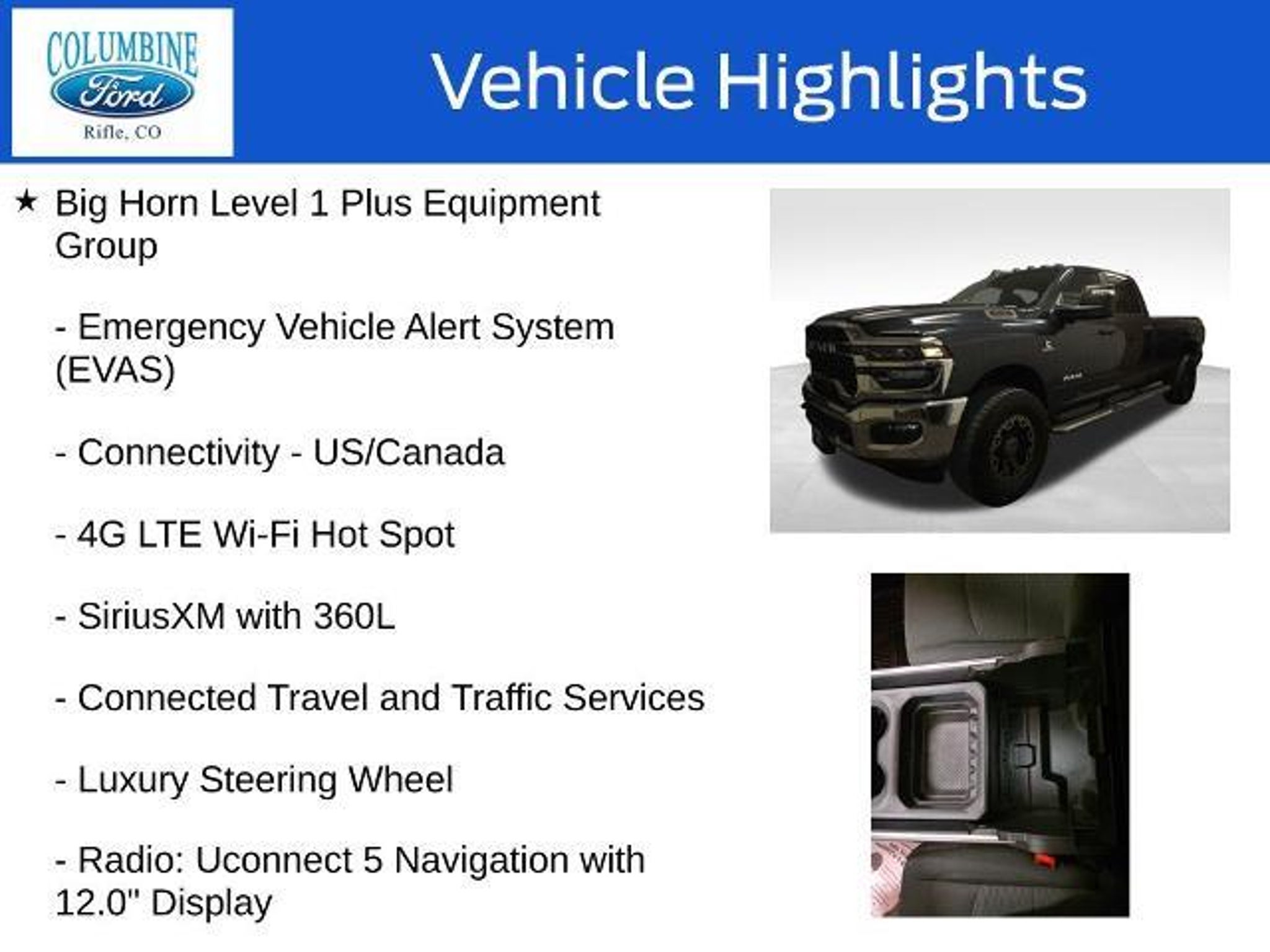 Elevate your driving experience with this exceptional 2026 Ram 3500 Big Horn. Packed with an impressive array of features, this powerful truck is designed to conquer any challenge you face on the road. - 6.7L I-6 Diesel Turbocharged (Cummins) engine - Big Horn Level 1 Plus Equipment Group - Towing Technology Group - Heated Seats and Wheel Group - 5th Wheel/Gooseneck Towing Prep Group - GPS Navigation, 9 Alpine Speakers with Subwoofer, SiriusXM with 360L - Alexa Built-In, Surround View Camera System, Blind Spot & Cross Path Detection This Ram 3500 Big Horn is more than just a workhorse; it's a true companion that will elevate your driving experience. With its impressive towing capacity, advanced technology, and premium comfort features, this truck is ready to tackle any task with unparalleled capability. Imagine the convenience of the Uconnect 5 Navigation system with its massive 12-inch touchscreen display, providing seamless connectivity and intuitive control over your driving experience. The Towing Technology Group further enhances your confidence on the road, with features like the Surround View Camera System and Trailer Reverse Guidance. When the weather turns, the Cold Weather Group and Heated Seats and Wheel Group will keep you comfortable, while the MOPAR Spray-in Bedliner and Deployable Bed Step ensure your cargo is secure and accessible. The 5th Wheel/Gooseneck Towing Prep Group prepares this Ram 3500 for your most demanding towing needs, making it a true workhorse that can handle any job. Experience the power, technology, and comfort of this exceptional 2026 Ram 3500 Big Horn. Visit our showroom today and let our knowledgeable team guide you through all the features that make this truck a must-have for any discerning driver. At Columbine Ford, we're proud to be Western Colorado's most trusted dealership and a multi-year recipient of Ford's prestigious President's Award for exceptional customer satisfaction. Our team is committed to honesty, transparency, and delivering a hassle-free buying experience on every visit. Whether you're shopping new or pre-owned, you'll find unbeatable service, western Colorado's largest selection of vehicles, competitive pricing, and a dealership that truly cares. Visit us at 2828 Railroad Ave., Rifle, CO 81650 or call 970-625-1680. Experience the award-winning difference at Columbine Ford?where Colorado comes to drive.