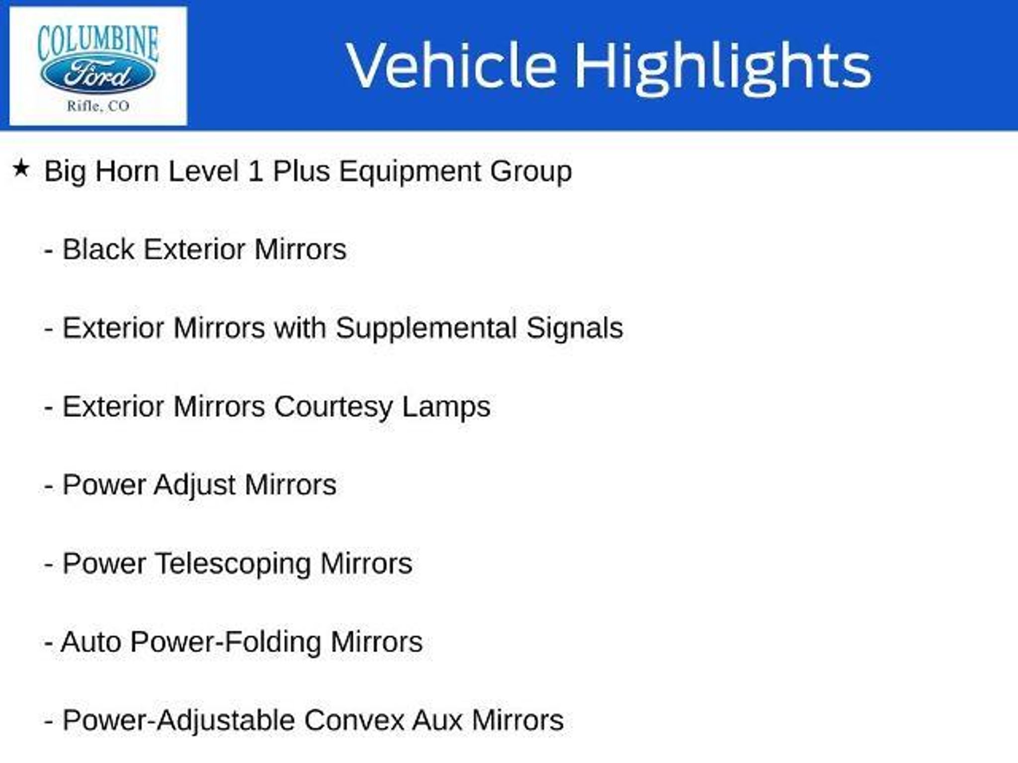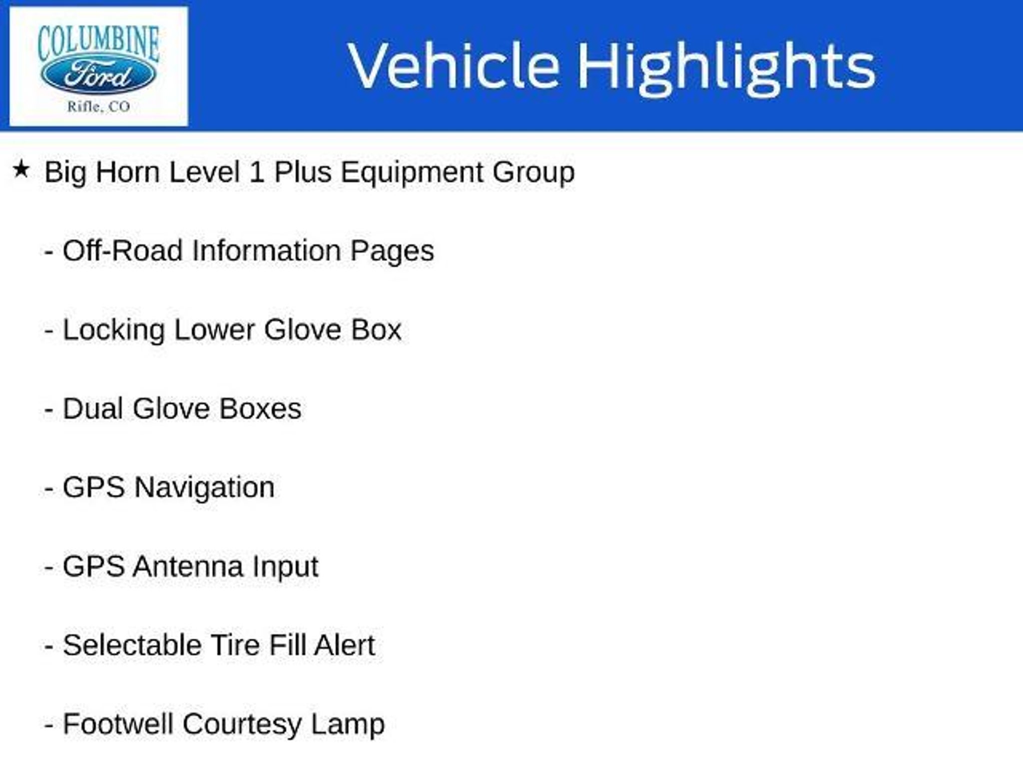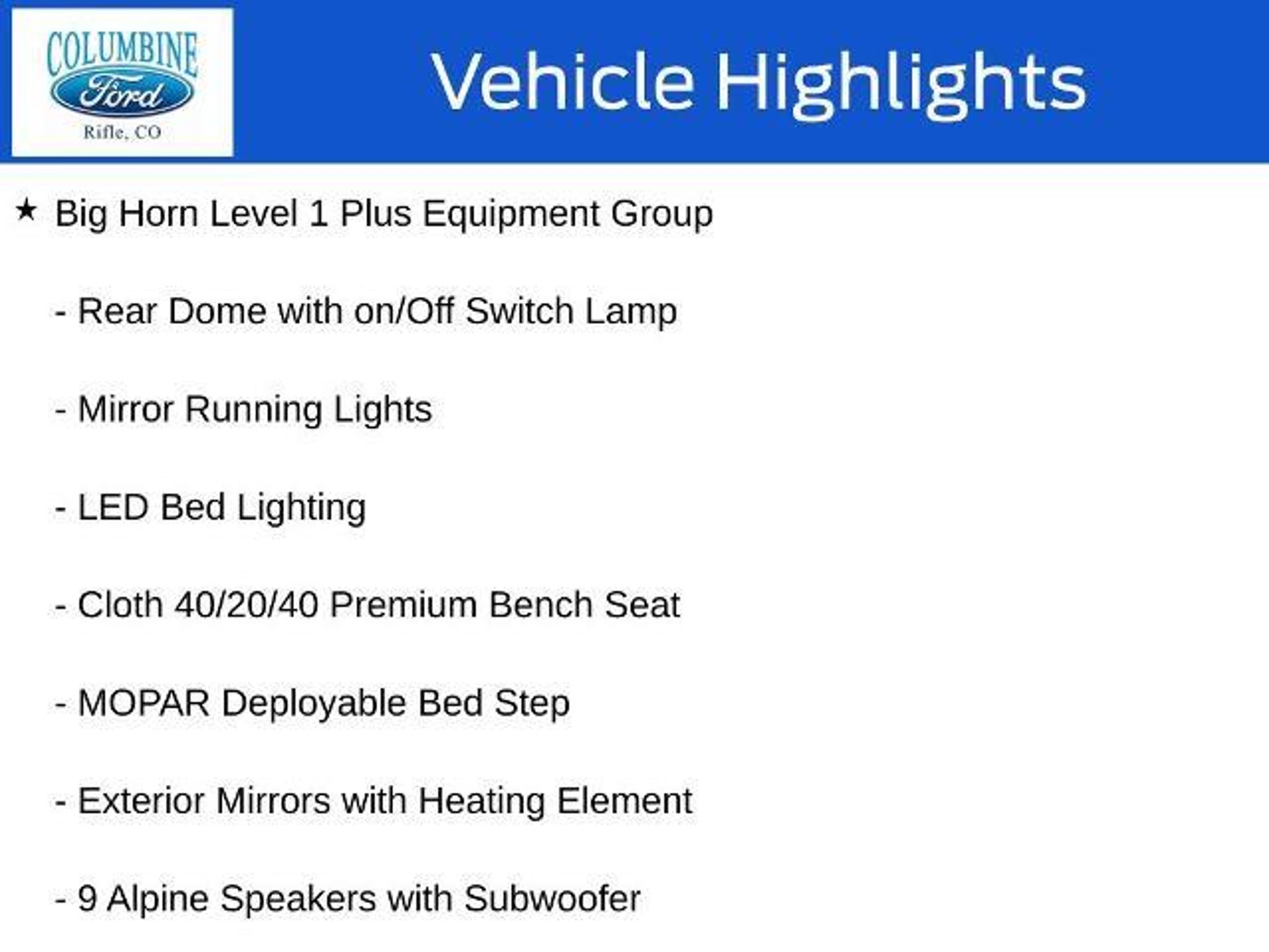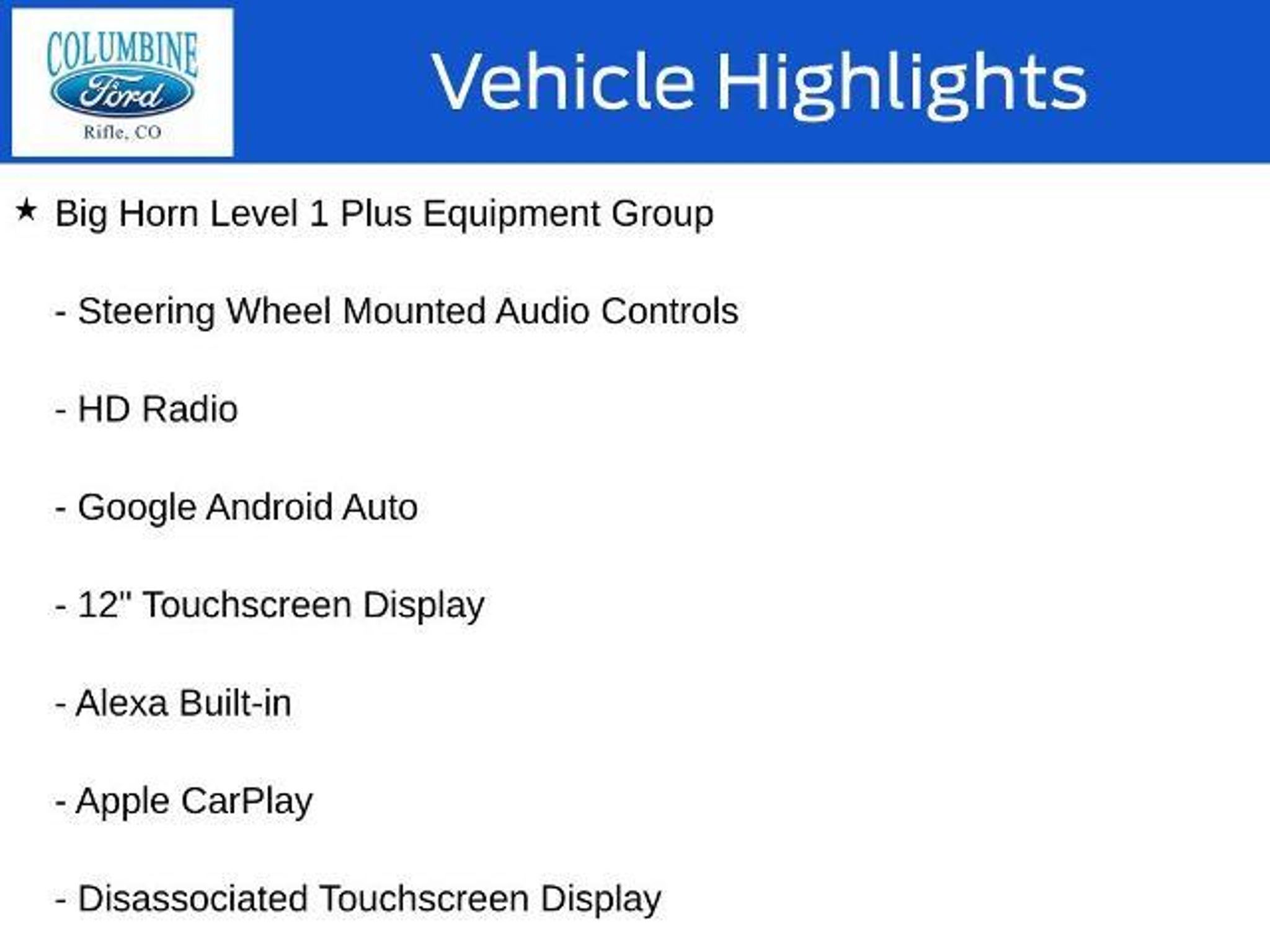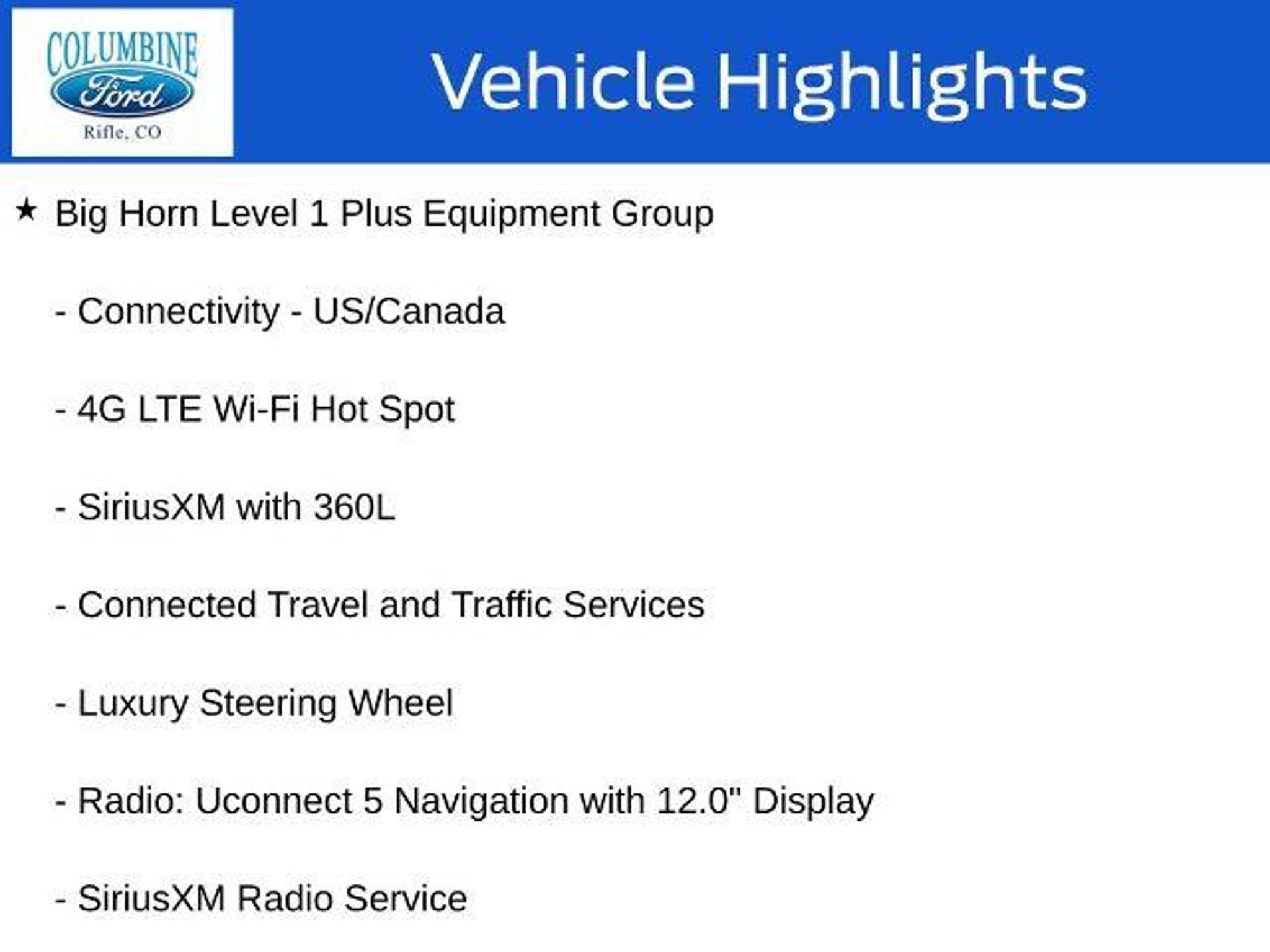 Elevate your driving experience with this exceptional 2026 Ram 3500 Big Horn. Packed with an impressive array of features, this powerful truck is designed to conquer any challenge you face on the road. - 6.7L I-6 Diesel Turbocharged (Cummins) engine - Big Horn Level 1 Plus Equipment Group - Towing Technology Group - Heated Seats and Wheel Group - 5th Wheel/Gooseneck Towing Prep Group - GPS Navigation, 9 Alpine Speakers with Subwoofer, SiriusXM with 360L - Alexa Built-In, Surround View Camera System, Blind Spot & Cross Path Detection This Ram 3500 Big Horn is more than just a workhorse; it's a true companion that will elevate your driving experience. With its impressive towing capacity, advanced technology, and premium comfort features, this truck is ready to tackle any task with unparalleled capability. Imagine the convenience of the Uconnect 5 Navigation system with its massive 12-inch touchscreen display, providing seamless connectivity and intuitive control over your driving experience. The Towing Technology Group further enhances your confidence on the road, with features like the Surround View Camera System and Trailer Reverse Guidance. When the weather turns, the Cold Weather Group and Heated Seats and Wheel Group will keep you comfortable, while the MOPAR Spray-in Bedliner and Deployable Bed Step ensure your cargo is secure and accessible. The 5th Wheel/Gooseneck Towing Prep Group prepares this Ram 3500 for your most demanding towing needs, making it a true workhorse that can handle any job. Experience the power, technology, and comfort of this exceptional 2026 Ram 3500 Big Horn. Visit our showroom today and let our knowledgeable team guide you through all the features that make this truck a must-have for any discerning driver. At Columbine Ford, we're proud to be Western Colorado's most trusted dealership and a multi-year recipient of Ford's prestigious President's Award for exceptional customer satisfaction. Our team is committed to honesty, transparency, and delivering a hassle-free buying experience on every visit. Whether you're shopping new or pre-owned, you'll find unbeatable service, western Colorado's largest selection of vehicles, competitive pricing, and a dealership that truly cares. Visit us at 2828 Railroad Ave., Rifle, CO 81650 or call 970-625-1680. Experience the award-winning difference at Columbine Ford?where Colorado comes to drive.