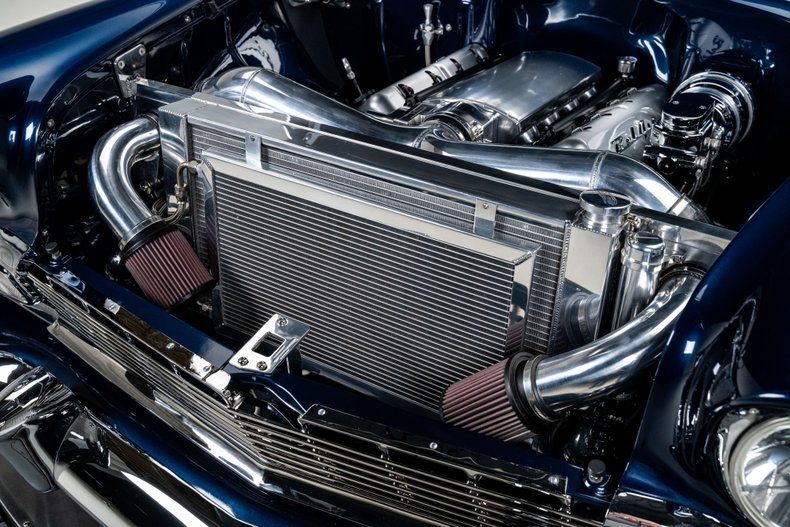 Finished in an attractive metallic blue over metallic silver two-tone, the body presents a tasteful interpretation of Chevrolet's iconic Bel Air styling. Traditional trim, chrome and badging remain intact, preserving the unmistakable character that defines the model, while subtle modern touches enhance the presentation. LED '56-style tail lamps provide improved visibility without altering the factory look, and the car's athletic stance immediately signals its modern underpinnings. Completing the exterior are 18" Forgeline CH3P wheels finished in gunmetal with polished lips, wrapped in BFGoodrich G-Force tires that fill the arches perfectly and complement the car's lowered posture.