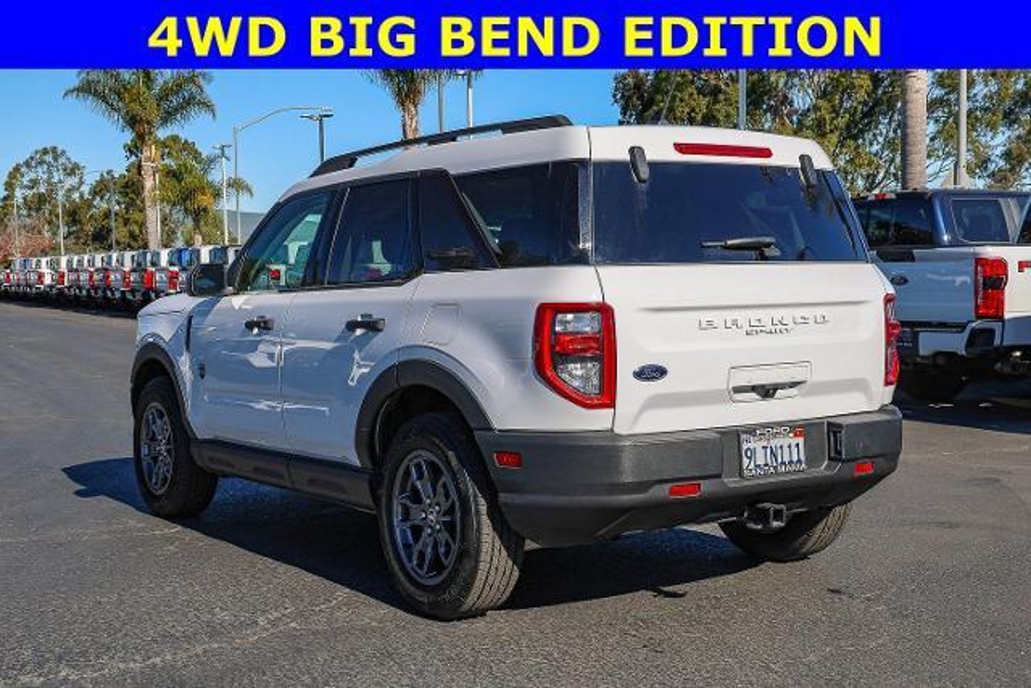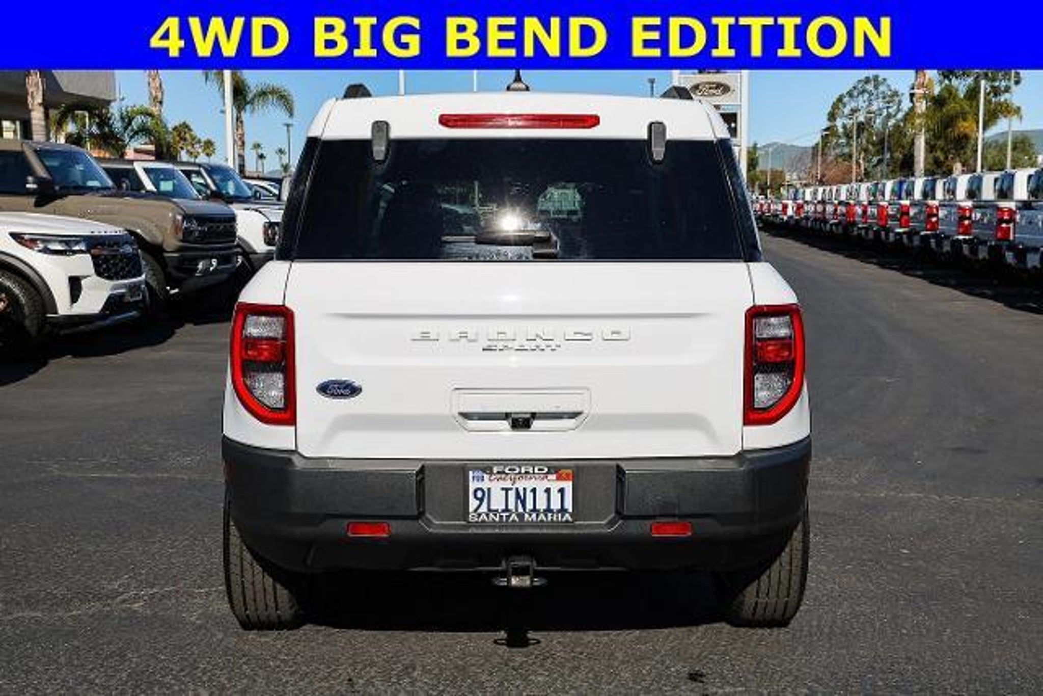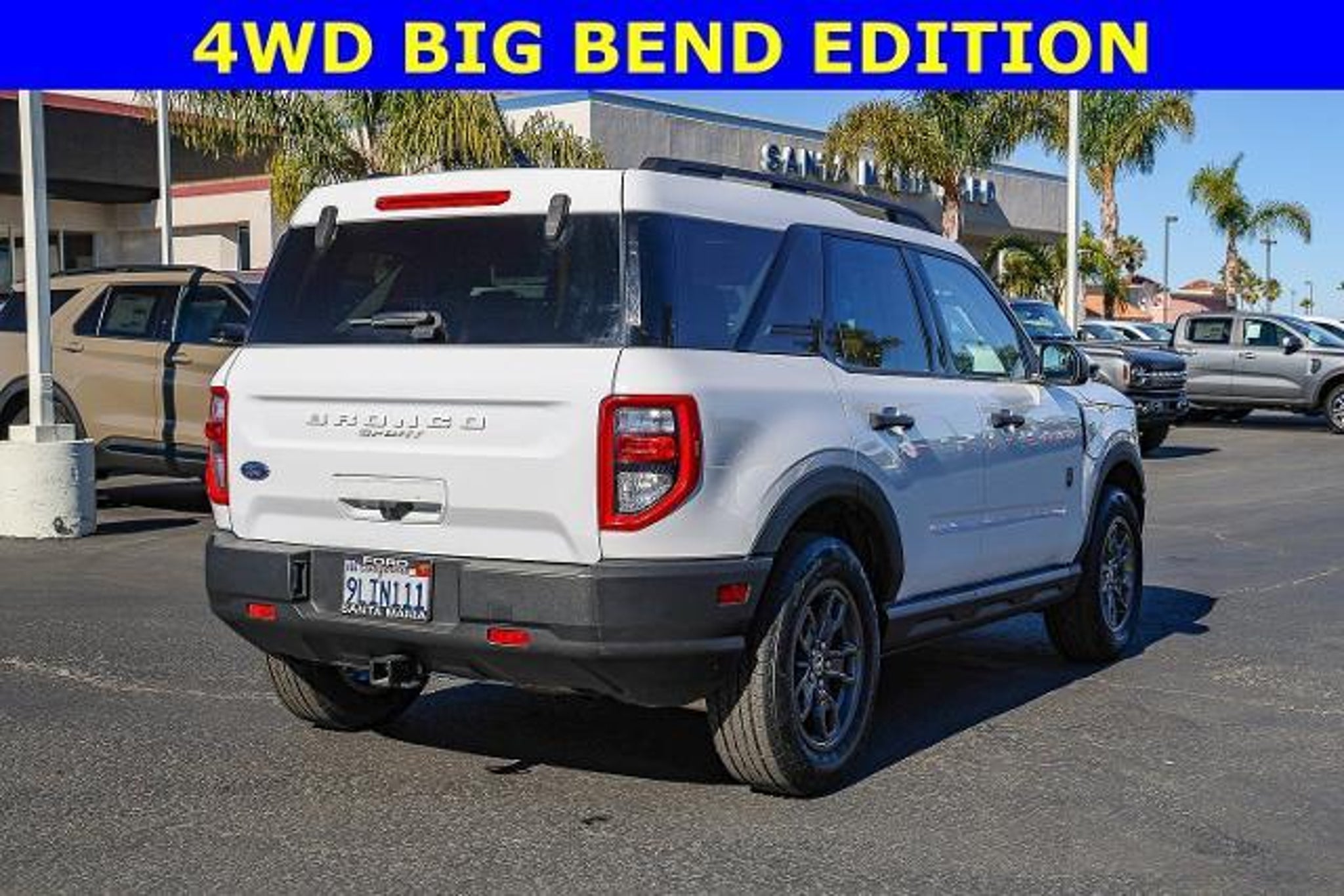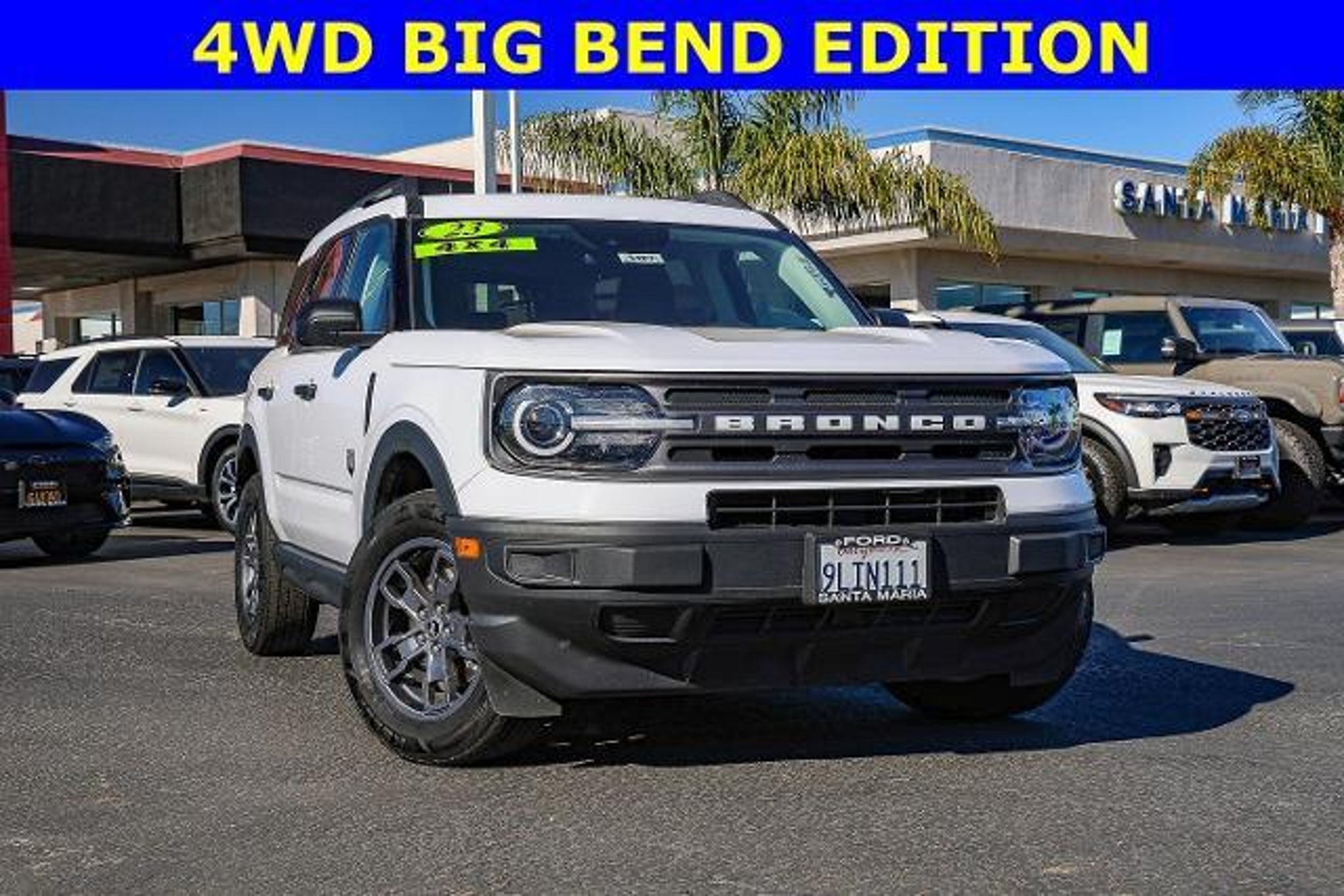 All of our Pre-Owned vehicles are subject to a 100 point inspection to ensure safety and reliability. 3.80 Axle Ratio, 4-Wheel Disc Brakes, 4G LTE Wi-Fi Hotspot Credit, 6 Speakers, ABS brakes, Air Conditioning, Alloy wheels, AM/FM radio: SiriusXM, AM/FM Stereo, Auto High-beam Headlights, Automatic temperature control, Brake assist, Compass, Delay-off headlights, Driver door bin, Driver vanity mirror, Dual front impact airbags, Dual front side impact airbags, Electronic Stability Control, Emergency communication system: SYNC 3 911 Assist, Equipment Group 200A, Four wheel independent suspension, Front anti-roll bar, Front Bucket Seats, Front Center Armrest, Front License Plate Bracket, Front reading lights, Fully automatic headlights, Heated door mirrors, Illuminated entry, Knee airbag, Low tire pressure warning, Occupant sensing airbag, Outside temperature display, Overhead airbag, Overhead console, Panic alarm, Passenger door bin, Passenger vanity mirror, Power door mirrors, Power steering, Power windows, Radio data system, Rear anti-roll bar, Rear reading lights, Rear seat center armrest, Rear window defroster, Rear window wiper, Remote keyless entry, Security system, SiriusXM, Speed control, Speed-sensing steering, Speed-Sensitive Wipers, Split folding rear seat, Steering wheel mounted audio controls, SYNC 3 Communications & Entertainment System, SYNC 3/Apple CarPlay/Android Auto, Tachometer, Telescoping steering wheel, Tilt steering wheel, Traction control, Trip computer, Unique Cloth Front Bucket Seats, Variably intermittent wipers, Wheels: 17 Carbonized Gray-Painted Aluminum. Oxford White 2023 Ford Bronco Sport Big Bend 4WD 8-Speed Automatic 1.5L EcoBoost Recent Arrival! 25/28 City/Highway MPG When was the last time you used the word 'love' to describe how you feel about your car? At Santa Maria Ford, we hear our customers say it all the time, and for good reason. Serving drivers from Paso Robles, Santa Barbara, and Pismo Beach, we offer a wide range of new and used offerings from Ford.