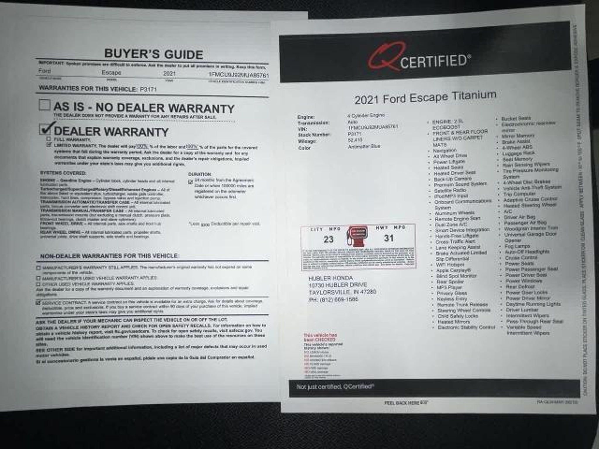 Titanium trim. $300 below J.D. Power Retail! EPA 31 MPG Hwy/23 MPG City! GREAT MILES 52,410! Nav System, Heated Seats, Satellite Radio, Dual Zone A/C, Remote Engine Start, iPod/MP3 Input, Premium Sound System, All Wheel Drive, Power Liftgate, Turbo Charged Engine, Aluminum Wheels, ENGINE: 2.0L ECOBOOST, FRONT & REAR FLOOR LINERS W/O CARPET. Back-Up Camera CLICK NOW! KEY FEATURES INCLUDE Navigation, Power Liftgate, Heated Driver Seat, Back-Up Camera, Premium Sound System, Satellite Radio, iPod/MP3 Input, Remote Engine Start, Dual Zone A/C, Smart Device Integration, Blind Spot Monitor, Hands-Free Liftgate, Apple CarPlay?, Cross-Traffic Alert, WiFi Hotspot. Rear Spoiler, MP3 Player, All Wheel Drive, Onboard Communications System, Aluminum Wheels. OPTION PACKAGES FRONT & REAR FLOOR LINERS W/O CARPET MATS Deletes standard front and rear carpeted floor mats, ENGINE: 2.0L ECOBOOST auto start-stop technology (STD). Ford Titanium with Antimatter Blue exterior and Ebony interior features a 4 Cylinder Engine with 250 HP at 5500 RPM*. EXPERTS REPORT Great Gas Mileage: 31 MPG Hwy. A GREAT TIME TO BUY This Escape is priced $300 below J.D. Power Retail. Pricing analysis performed on 3/5/2026. Horsepower calculations based on trim engine configuration. Fuel economy calculations based on original manufacturer data for trim engine configuration. Please confirm the accuracy of the included equipment by calling us prior to purchase.