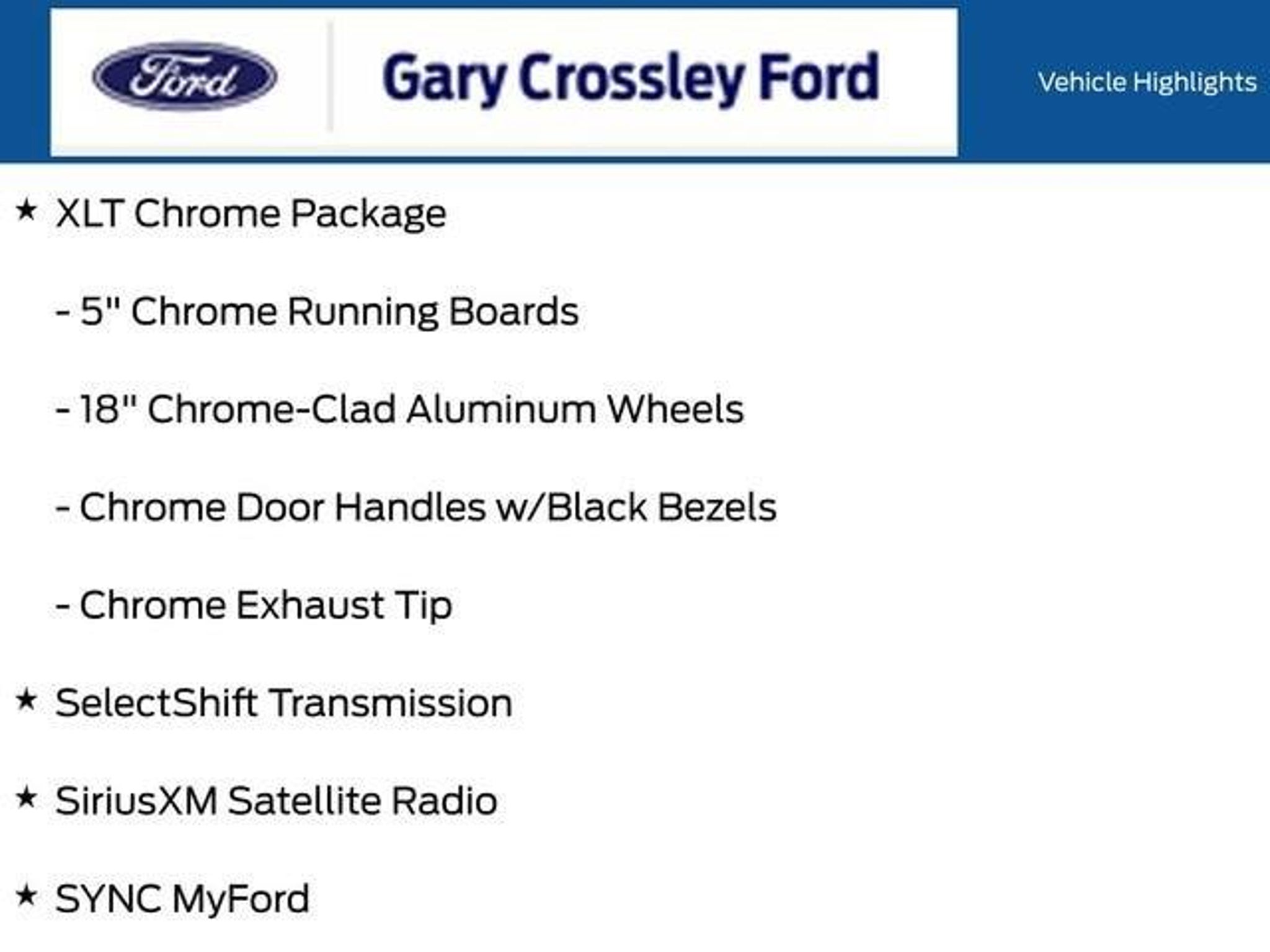 ** Local Trade In **, ** Rear Back Up Camera **, ** Trailer Tow Package **, 18 Chrome-Clad Aluminum Wheels, 3.31 Axle Ratio, 4.2 LCD Productivity Screen in Instrument Cluster, 5 Chrome Running Boards, 6-Way Power Driver Seat, Auxiliary Transmission Oil Cooler, Chrome Door Handles w/Black Bezels, Chrome Exhaust Tip, Equipment Group 302A Luxury, Heated Power Side Mirrors, Leather-Wrapped Steering Wheel, Power Adjustable Pedals, Power-Sliding Rear Window w/Defrost & Privacy Tint, Rear-View Camera, Reverse Sensing System, SelectShift Transmission, Self-Dimming Rear-View Mirror, SiriusXM Satellite Radio, SYNC MyFord, Trailer Brake Controller, Trailer Tow Package, Upgraded Radiator, XLT Chrome Package, XLT Convenience Package, XLT Plus Package. CARFAX One-Owner. Ingot Silver Metallic 2014 Ford F-150 XLT 3.5L V6 4D SuperCrew 4WD 6-Speed Automatic ElectronicRecent Arrival! Odometer is 4063 miles below market average!Come Experience the Crossley Difference! Although every reasonable effort has been made to ensure the accuracy of the information contained on this site, absolute accuracy cannot be guaranteed. Specifications, features, safety and warranty data are based on what is available as standard specs/features per trim level, for the designated model-year, and may not apply to vehicles with added packages or options. See dealer for written warranty information. Dealer makes no guarantees or warranties, either expressly or implied, with respect to the accuracy of any data listed on this page which was obtained from third party sources. All vehicles are subject to prior sale. Prices include all eligible factory rebates to dealer. Prices do not include upfits, plows, or other accessories. Price does not include applicable tax, title, license, processing and/or documentation fees, and any emissions testing charges. Doc fees vary by state (Rhode Island $399, Massachusetts $499, Connecticut $899, New York $175, Illinois $367.70, Florida $995 doc fee and $229 electronic filing fee, Pennsylvania $477.70, Missouri $604.70, New Jersey $795). Price and availability subject to change. Manufacturer's Suggested Retail Price (MSRP) is listed for customer information and customer comparison purposes only, and the actual sales price may vary depending on changing market conditions and other factors. Any information contained on this page should be used for informational purposes only. All vehicles may not be physically located at this dealership but may be available for delivery through this location. Pleas