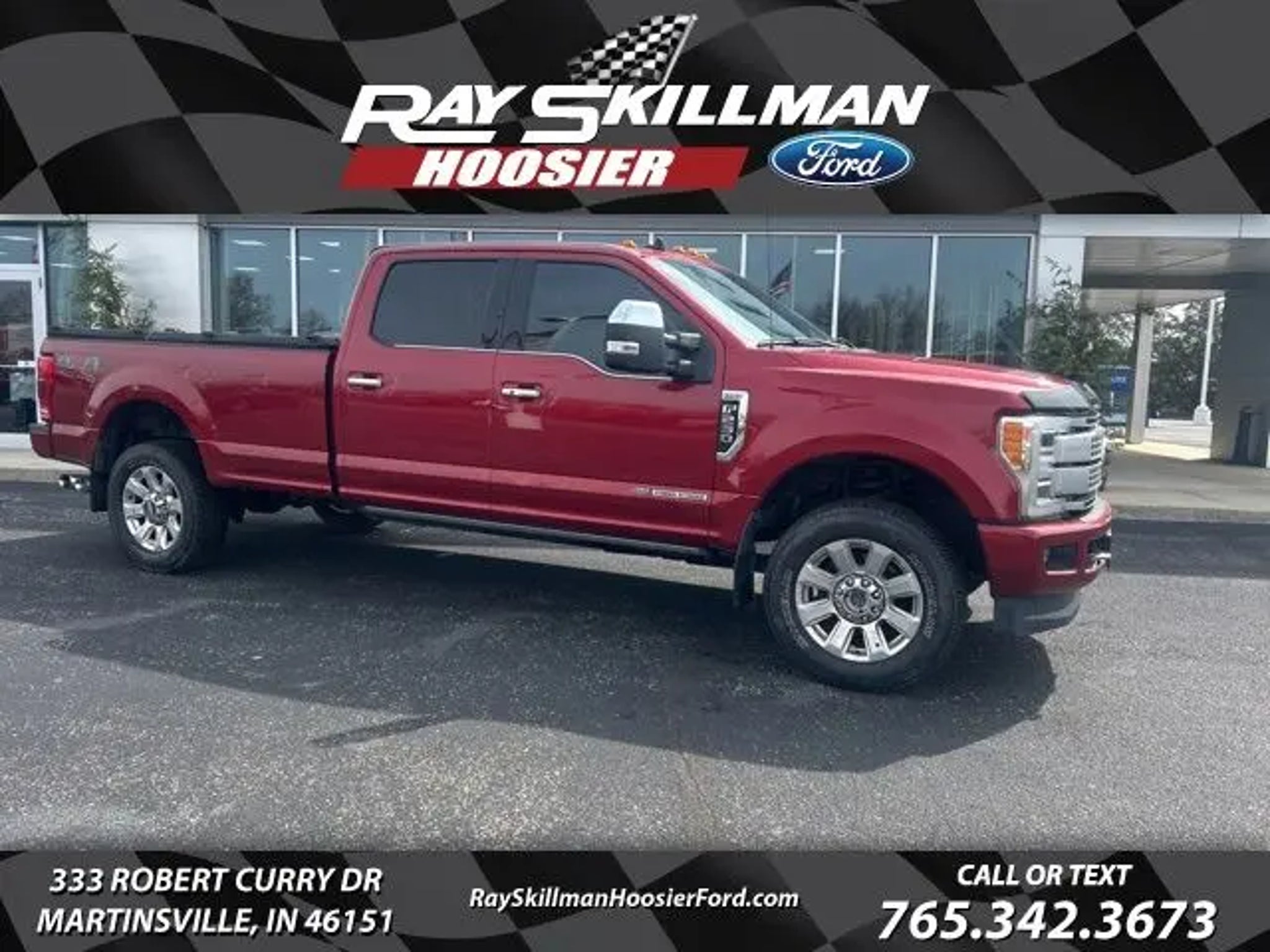 Recent Arrival! Ruby Red 2019 Ford F-250SD Platinum 4WD TorqShift 6-Speed Automatic Power Stroke 6.7L V8 DI 32V OHV Turbodiesel AIR BAGS, GOOSNECK HITCH INCLUDED, LOCKING BED COVER, 4WD, 6 Angular Chrome Step Bars, 6 Ebony Black Angular Running Boards, Black Out Surrounds Halogen Only Headlamps, Body-Color Door Handles w/Chrome Insert, Chrome Exhaust Tip, Chrome Package, Ebony Black Painted Front Grille Bars, Ebony Black Painted Mirror Caps, GVWR: 10,000 lb Payload Package, Lariat Sport Appearance Package, Order Code 703A, Rear Wheel Well Liners (Pre-Installed), Snow Plow Prep Package, Tough Bed Spray-In Bedliner, Unique Chrome Mirror Caps, Wheels: 18 Chrome PVD Aluminum, Wheels: 20 Ebony Black Painted Premium Aluminum. Why Buy From Us: At Ray Skillman Hoosier Ford, we are 110% committed to our customers in Martinsville, Bloomington, Mooresville, and all over the great state of Indiana. We want to ease the unnecessary stress of the car buying process and make it simple and enjoyable for you and your family. Our friendly sales team is here to listen to your individual needs and help to identify the right car for you. With so many New Ford Vehicles and a diverse selection of Pre-Owned Vehicles to choose from, drivers are sure to find exactly what they're looking for at Ray Skillman Hoosier Ford. Odometer is 51534 miles below market average! Contact Us: Call or text 765-342-3673 to schedule your test drive today! All offers shown do not include tax, title, or $251.00 doc/compliance fee.